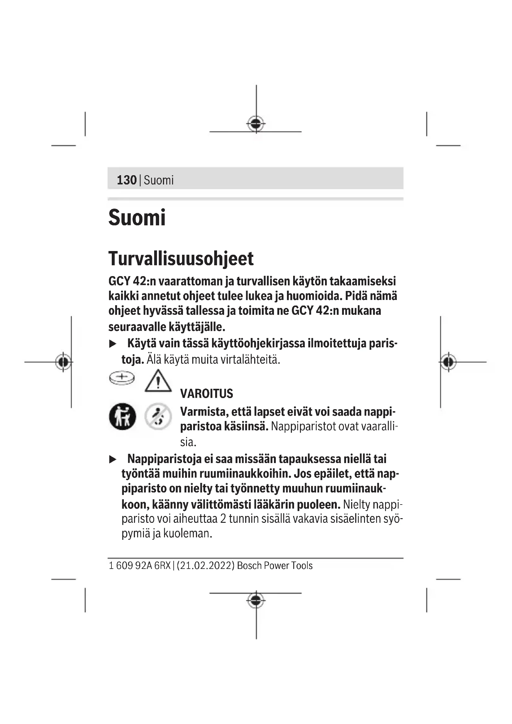 Kantavuus voi vaihdella voimakkaasti ulkoisten olosuhtei- den ja käytettävän vastaanottimen mukaan. Suljetut tilat ja metalliset esteet (esimerkiksi seinät, kaapit, laukut, yms.) saattavat lyhentää huomattavasti Bluetooth®-yhtey- den kantavuutta. 1 609 92A 6RX | (21.02.2022) Bosch Power ToolsSuomi | 135 Järjestelmävaatimukset GCY 42 Mobiililaite (tabletti, älypu- helin) Android 6.0 (ja uudempi) iOS 11 (ja uudempi) Asennus ja käyttö Virtalähde u Irrota Bluetooth® Low Energy Module GCY 42:n suojus sähkötyökalusta esimerkiksi ruuvitaltalla tai suurella kolikolla. Vääränlaisen apuvälineen käyttö voi vahingoittaa elektroniikkaa ja suojusta. – Tee laitteen käyttöönotto ja pariston (1) vaihto kuvasivujen piirrosten mukaan. Huomioi tässä yhteydessä seuraavat oh- jeet. Ensikäyttö (katso kuvatA1–A5) Huomautus: Säilytä GCY42:n paikanpitäjä (3) hyvässä tal- lessa. Jos annat sähkötyökalun muiden käyttöön ilman GCY 42 -moduulia, asenna paikanpitäjä takaisin. Asenna paristo (1)plusnapa ylöspäin GCY 42 -moduuliin (2). Paristoa ei tarvitse painaa sisään, koska se napsahtaa auto- Bosch Power Tools 1 609 92A 6RX | (21.02.2022)136 | Suomi maattisesti paikalleen. Se lukittuu vasta kannen suljennan myötä oikealle paikalleen. Tee asennuksen jälkeen GCY42:n alkuasetus painamalla säh- kötyökalun käynnistyskytkintä. Pariston vaihto (katso kuvatB1–B4) Irrota tyhjä paristo (1) vain sormilla. Sovellus antaa varoituksen, kun pariston varaus on käytetty lä- hes loppuun. GCY 42:n irrottaminen (katso kuvatC1–C2) Älä irrota GCY42 -moduulia (2) väkisin. Älä käytä teräviä tai piikkikärkisiä työkaluja. Huomautus: käännä tarvittaessa sähkötyökalua, jotta saat ir- rotettua GCY42:n helpommin. Käyttöönotto Heti kun paristo (1) on paikallaan ja painat sähkötyökalun käynnistyskytkintä, GCY42 alkaa lähettää jatkuvasti signaa- leja. Bluetooth®-signaaliyhteys ei katkea ennen kuin paristo on tyhjä, rikki tai irrotettu. 1 609 92A 6RX | (21.02.2022) Bosch Power ToolsSuomi | 137 Lisätietoja saat suoraan Bosch-sovelluksesta. Sovelluksen asennus ja käyttöönotto Sinun on ensin asennettava Bosch Toolbox -sovellus, jotta voit käyttää GCY42 -moduulia. – Lataa Bosch Toolbox -sovellus asianomaisesta sovelluskau- pasta (Apple App Store, Google Play Store). Huomautus: latausta varten sinulla täytyy olla kyseisen so- velluskaupan käyttäjätili. – Valitse tämän jälkeen sovelluksen alakohta MyTools. – Mobiililaitteesi neuvoo tästä eteenpäin kuinka muodostat sähkötyökalun ja mobiililaitteen välisen yhteyden. Huomautus: suorita ensin sovelluksen ohjattu toiminto koko- naisuudessaan läpi. Sen avulla saat paremman yleiskuvan yh- teyden muodostamisesta ja langattoman yhteyden toimintojen käytöstä. Tiedonsiirto Bluetooth®-yhteydellä GCY42 lähettää tietoja säännöllisin väliajoin. Ympäristöstä riippuen mobiililaite voi tarvita useampia lähetysjaksoja, en- nen kuin se tunnistaa GCY42 -moduulin. Jos GCY42 -moduu- lia ei tunnisteta, tarkista seuraavat asiat: Bosch Power Tools 1 609 92A 6RX | (21.02.2022)138 | Suomi – Onko etäisyys mobiililaitteeseen liian suuri? Lyhennä mobiililaitteen ja GCY42 -moduulin keskinäistä etäisyyttä. – Onko paristo heikko tai tyhjä? Vaihda paristo. – Sammuta mobiililaitteen Bluetooth® ja kytke se uudelleen päälle. Tarkasta, tunnistaako mobiililaite nyt GCY42:n. Hoito ja huolto Huolto ja puhdistus Poista lika pensselillä. Älä käytä puhdistusaineita tai liuottimia. Asiakaspalvelu ja käyttöneuvonta Asiakaspalvelu vastaa tuotteesi korjausta ja huoltoa sekä va- raosia koskeviin kysymyksiin. Räjäytyskuvat ja varaosatiedot ovat myös verkko-osoitteessa: www.bosch-pt.com Bosch-käyttöneuvontatiimi vastaa mielellään tuotteita ja tar- vikkeita koskeviin kysymyksiin. Ilmoita kaikissa kyselyissä ja varaosatilauksissa 10‑numeroi- nen tuotenumero, joka on ilmoitettu tuotteen mallikilvessä. 1 609 92A 6RX | (21.02.2022) Bosch Power ToolsSuomi | 139 Suomi Robert Bosch Oy Bosch-keskushuolto Pakkalantie 21 A 01510 Vantaa Voitte tilata varaosat suoraan osoitteesta www.bosch-pt.fi. Puh.: 0800 98044 Faksi: 010 296 1838 www.bosch-pt.fi Muut asiakaspalvelun yhteystiedot löydät kohdasta: www.bosch-pt.com/serviceaddresses Hävitys GCY42 -moduulit, lisätarvikkeet ja pakkaukset tulee toimittaa ympäristöystävälliseen uusiokäyttöön. Älä heitä sähkökomponentteja ja paristoja ta- lousjätteisiin! Koskee vain EU‑maita: Sähkö- ja elektroniikkaromua koskevan EU-direktiivin 2012/19/EU ja sen kansalliseen lainsäädäntöön saattamisen mukaan käyttökelvottomat sähkötyökalut sekä EU-direktiivin Bosch Power Tools 1 609 92A 6RX | (21.02.2022)140 | Ελληνικά 2006/66/EY mukaan vialliset tai loppuun käytetyt akut/paris- tot on kerättävä erikseen ja toimitettava ympäristöystävälli- seen kierrätykseen. Jos käytöstä poistetut sähkö- ja elektroniikkalaitteet hävite- tään epäasianmukaisesti, niiden mahdollisesti sisältämät vaa- ralliset aineet voivat aiheuttaa haittaa ympäristölle ja ihmisten terveydelle.