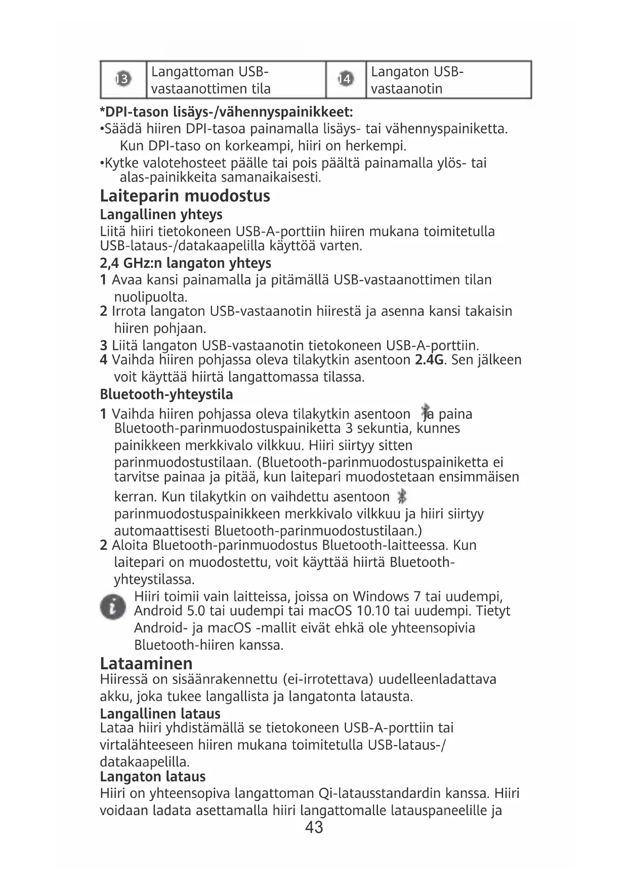 - Kytke valotehosteet päälle tai pois päältä painamalla ylös- tai alas-painikkeita samanaikaisesti. Laiteparin muodostus Langallinen yhteys Liitä hiiri tietokoneen USB-A-porttiin hiiren mukana toimitetulla USB-lataus-/datakaapelilla käyttöä varten. 2,4 GHz:n langaton yhteys 1 Avaa kansi painamalla ja pitämällä USB-vastaanottimen tilan nuolipuolta. 2 Irrota langaton USB-vastaanotin hiirestä ja asenna kansi takaisin hiiren pohjaan. 3 Liitä langaton USB-vastaanotin tietokoneen USB-A-porttiin. 4 Vaihda hiiren pohjassa oleva tilakytkin asentoon 2.4G. Sen jälkeen voit käyttää hiirtä langattomassa tilassa. Bluetooth-yhteystila 1 Vaihda hiiren pohjassa oleva tilakytkin asentoon ja paina Bluetooth-parinmuodostuspainiketta 3 sekuntia, kunnes painikkeen merkkivalo vilkkuu. Hiiri siirtyy sitten parinmuodostustilaan. (Bluetooth-parinmuodostuspainiketta ei tarvitse painaa ja pitää, kun laitepari muodostetaan ensimmäisen kerran. Kun tilakytkin on vaihdettu asentoon , parinmuodostuspainikkeen merkkivalo vilkkuu ja hiiri siirtyy automaattisesti Bluetooth-parinmuodostustilaan.) 2 Aloita Bluetooth-parinmuodostus Bluetooth-laitteessa. Kun laitepari on muodostettu, voit käyttää hiirtä Bluetooth- yhteystilassa. Hiiri toimii vain laitteissa, joissa on Windows 7 tai uudempi, Android 5.0 tai uudempi tai macOS 10.10 tai uudempi. Tietyt Android- ja macOS -mallit eivät ehkä ole yhteensopivia Bluetooth-hiiren kanssa. Lataaminen Hiiressä on sisäänrakennettu (ei-irrotettava) uudelleenladattava akku, joka tukee langallista ja langatonta latausta. Langallinen lataus Lataa hiiri yhdistämällä se tietokoneen USB-A-porttiin tai virtalähteeseen hiiren mukana toimitetulla USB-lataus-/ datakaapelilla. Langaton lataus Hiiri on yhteensopiva langattoman Qi-latausstandardin kanssa. Hiiri voidaan ladata asettamalla hiiri langattomalle latauspaneelille ja 43kohdistamalla hiiren pohjassa oleva langattoman latauksen alue langattoman latauspaneelin langattoman latauksen alueeseen. Langaton latauspaneeli on ostettava erikseen. Lisää toimintoja Mene osoitteeseen https://consumer.huawei.com/en/support/, tee haku laitteesi nimellä ja lataa ja asenna hiiren ohjain, niin saat käyttöösi lisää hiiren toimintoja. Turvallisuutta koskevat tiedot