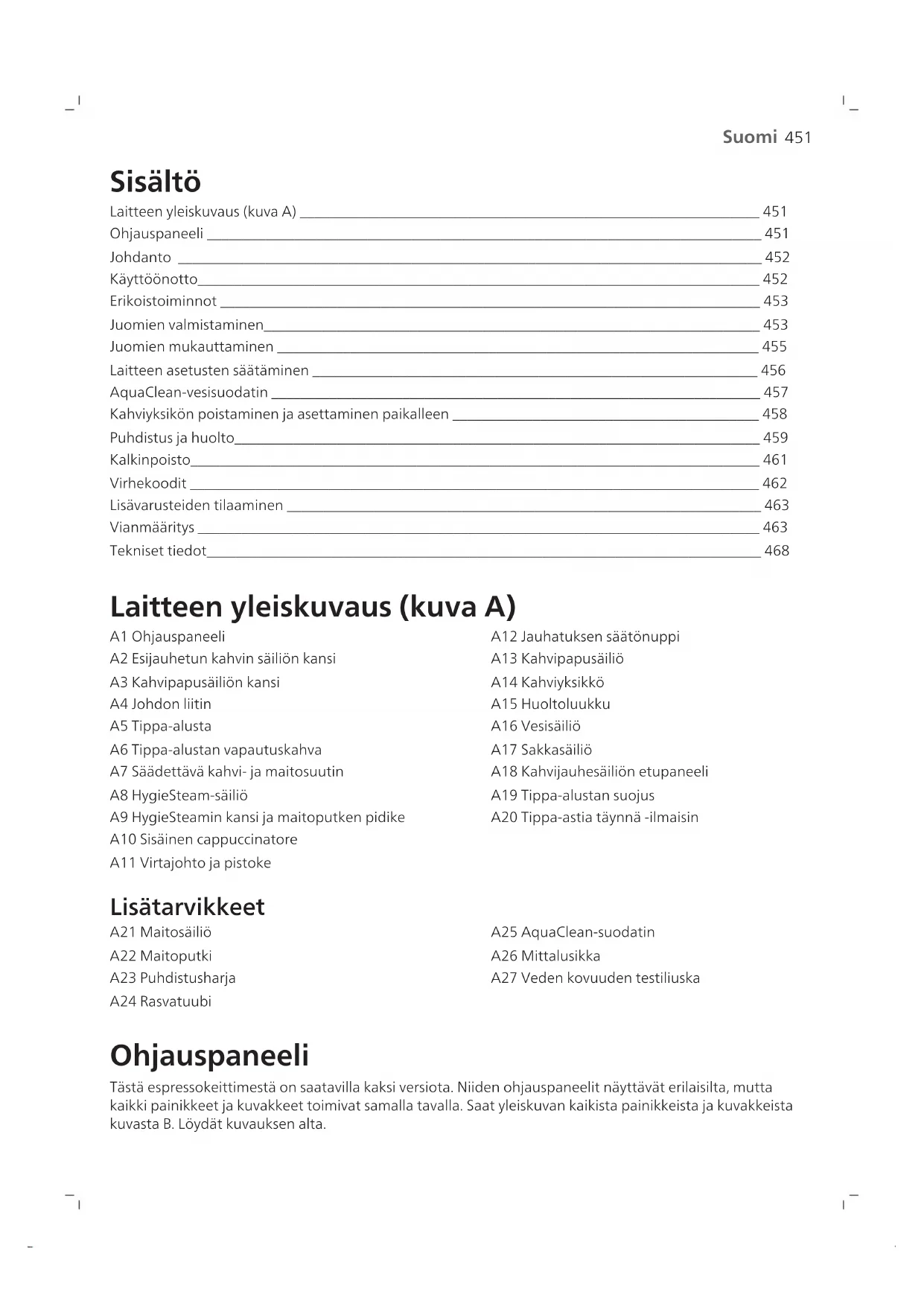 Suomi Sisältö Laitteen yleiskuvaus (kuva A) _______________________________________________________________ 451 Ohjauspaneeli ____________________________________________________________________________ 451 Johdanto ________________________________________________________________________________ 452 Käyttöönotto_____________________________________________________________________________ 452 Erikoistoiminnot __________________________________________________________________________ 453 Juomien valmistaminen____________________________________________________________________ 453 Juomien mukauttaminen __________________________________________________________________ 455 Laitteen asetusten säätäminen _____________________________________________________________ 456 AquaClean-vesisuodatin ___________________________________________________________________ 457 Kahviyksikön poistaminen ja asettaminen paikalleen __________________________________________ 458 Puhdistus ja huolto________________________________________________________________________ 459 Kalkinpoisto______________________________________________________________________________ 461 Virhekoodit ______________________________________________________________________________ 462 Lisävarusteiden tilaaminen _________________________________________________________________ 463 Vianmääritys _____________________________________________________________________________ 463 Tekniset tiedot____________________________________________________________________________ 468 Laitteen yleiskuvaus (kuva A) A1 Ohjauspaneeli A2 Esijauhetun kahvin säiliön kansi A3 Kahvipapusäiliön kansi A4 Johdon liitin A5 Tippa-alusta A6 Tippa-alustan vapautuskahva A7 Säädettävä kahvi- ja maitosuutin A8 HygieSteam-säiliö A9 HygieSteamin kansi ja maitoputken pidike A10 Sisäinen cappuccinatore A11 Virtajohto ja pistoke A12 Jauhatuksen säätönuppi A13 Kahvipapusäiliö A14 Kahviyksikkö A15 Huoltoluukku A16 Vesisäiliö A17 Sakkasäiliö A18 Kahvijauhesäiliön etupaneeli A19 Tippa-alustan suojus A20 Tippa-astia täynnä -ilmaisin Lisätarvikkeet A21 Maitosäiliö A22 Maitoputki A23 Puhdistusharja A24 Rasvatuubi A25 AquaClean-suodatin A26 Mittalusikka A27 Veden kovuuden testiliuska Ohjauspaneeli Tästä espressokeittimestä on saatavilla kaksi versiota. Niiden ohjauspaneelit näyttävät erilaisilta, mutta kaikki painikkeet ja kuvakkeet toimivat samalla tavalla. Saat yleiskuvan kaikista painikkeista ja kuvakkeista kuvasta B. Löydät kuvauksen alta.452 Suomi Voit vierittää näytössä ylä- ja alanuolikuvakkeilla ja tehdä valintoja tai vahvistaa valinnat napauttamalla OK- kuvaketta. B1 Virtapainike B2 Yhden kosketuksen juomakuvakkeet B3 CoffeeMaestro-kuvake B4 Valikko, jossa on muita juomia B5 Käynnistyspainike B6 Siirtymiskuvakkeet (ylös, alas, takaisin, OK) B7 Näyttö B8 Laitteen asetukset B9 Puhdistusvalikko B10 Henkilökohtaiset profiilit Johdanto Kiitos, että ostit Saecon täysin automaattisen kahvinkeittimen. Siirry osoitteeseen www.saeco.com/MyCoffeeMachine ja rekisteröi tuotteesi, jotta voit hyödyntää Saecon verkkotukea parhaalla mahdollisella tavalla. Huomautus: Laitteen testauksessa on käytetty kahvia. Vaikka se on puhdistettu huolellisesti, laitteeseen on voinut jäädä kahvijäämiä. Takaamme kuitenkin, että laite on täysin uusi. Käyttöönotto