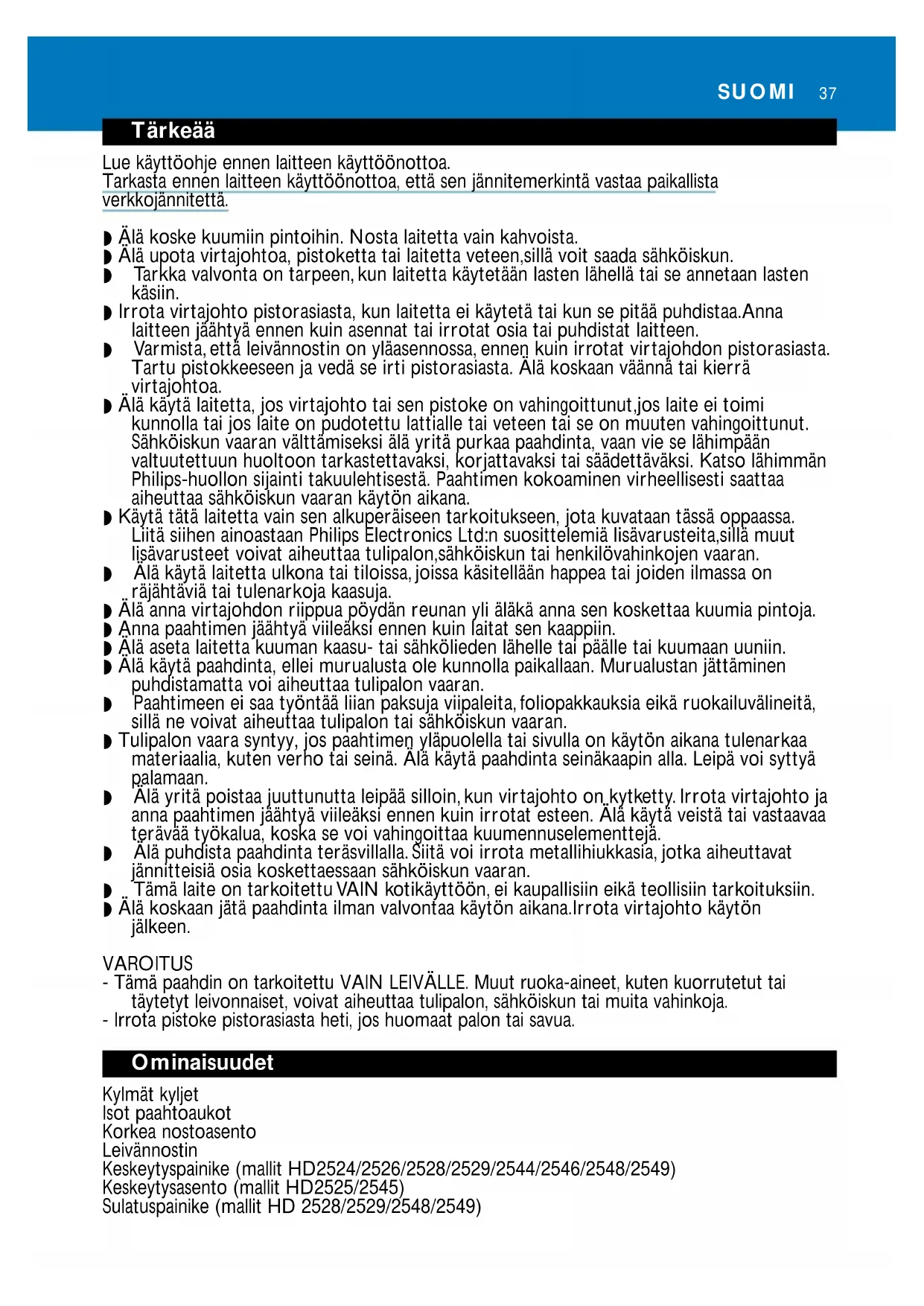 Tärkeää Lue käyttöohje ennen laitteen käyttöönottoa. Tarkasta ennen laitteen käyttöönottoa, että sen jännitemerkintä vastaa paikallista verkkojännitettä. ◗ Älä koske kuumiin pintoihin. Nosta laitetta vain kahvoista. ◗ Älä upota virtajohtoa, pistoketta tai laitetta veteen,sillä voit saada sähköiskun. ◗ Tarkka valvonta on tarpeen,kun laitetta käytetään lasten lähellä tai se annetaan lasten käsiin. ◗ Irrota virtajohto pistorasiasta, kun laitetta ei käytetä tai kun se pitää puhdistaa.Anna laitteen jäähtyä ennen kuin asennat tai irrotat osia tai puhdistat laitteen. ◗ Varmista, että leivännostin on yläasennossa, ennen kuin irrotat virtajohdon pistorasiasta. Tartu pistokkeeseen ja vedä se irti pistorasiasta. Älä koskaan väännä tai kierrä virtajohtoa. ◗ Älä käytä laitetta, jos virtajohto tai sen pistoke on vahingoittunut,jos laite ei toimi kunnolla tai jos laite on pudotettu lattialle tai veteen tai se on muuten vahingoittunut. Sähköiskun vaaran välttämiseksi älä yritä purkaa paahdinta, vaan vie se lähimpään valtuutettuun huoltoon tarkastettavaksi, korjattavaksi tai säädettäväksi. Katso lähimmän Philips-huollon sijainti takuulehtisestä. Paahtimen kokoaminen virheellisesti saattaa aiheuttaa sähköiskun vaaran käytön aikana. ◗ Käytä tätä laitetta vain sen alkuperäiseen tarkoitukseen, jota kuvataan tässä oppaassa. Liitä siihen ainoastaan Philips Electronics Ltd:n suosittelemiä lisävarusteita,sillä muut lisävarusteet voivat aiheuttaa tulipalon,sähköiskun tai henkilövahinkojen vaaran. ◗ Älä käytä laitetta ulkona tai tiloissa, joissa käsitellään happea tai joiden ilmassa on räjähtäviä tai tulenarkoja kaasuja. ◗ Älä anna virtajohdon riippua pöydän reunan yli äläkä anna sen koskettaa kuumia pintoja. ◗ Anna paahtimen jäähtyä viileäksi ennen kuin laitat sen kaappiin. ◗ Älä aseta laitetta kuuman kaasu- tai sähkölieden lähelle tai päälle tai kuumaan uuniin. ◗ Älä käytä paahdinta, ellei murualusta ole kunnolla paikallaan. Murualustan jättäminen puhdistamatta voi aiheuttaa tulipalon vaaran. ◗ Paahtimeen ei saa työntää liian paksuja viipaleita, foliopakkauksia eikä ruokailuvälineitä, sillä ne voivat aiheuttaa tulipalon tai sähköiskun vaaran. ◗ Tulipalon vaara syntyy, jos paahtimen yläpuolella tai sivulla on käytön aikana tulenarkaa materiaalia, kuten verho tai seinä. Älä käytä paahdinta seinäkaapin alla. Leipä voi syttyä palamaan. ◗ Älä yritä poistaa juuttunutta leipää silloin,kun virtajohto on kytketty. Irrota virtajohto ja anna paahtimen jäähtyä viileäksi ennen kuin irrotat esteen. Älä käytä veistä tai vastaavaa terävää työkalua, koska se voi vahingoittaa kuumennuselementtejä. ◗ Älä puhdista paahdinta teräsvillalla. Siitä voi irrota metallihiukkasia, jotka aiheuttavat jännitteisiä osia koskettaessaan sähköiskun vaaran. ◗ Tämä laite on tarkoitettu VAIN kotikäyttöön, ei kaupallisiin eikä teollisiin tarkoituksiin. ◗ Älä koskaan jätä paahdinta ilman valvontaa käytön aikana.Irrota virtajohto käytön jälkeen. VAROITUS - Tämä paahdin on tarkoitettu VAIN LEIVÄLLE. Muut ruoka-aineet, kuten kuorrutetut tai täytetyt leivonnaiset, voivat aiheuttaa tulipalon, sähköiskun tai muita vahinkoja. - Irrota pistoke pistorasiasta heti, jos huomaat palon tai savua. Ominaisuudet Kylmät kyljet Isot paahtoaukot Korkea nostoasento Leivännostin Keskeytyspainike (mallit HD2524/2526/2528/2529/2544/2546/2548/2549) Keskeytysasento (mallit HD2525/2545) Sulatuspainike (mallit HD 2528/2529/2548/2549) SUOMI38 Sulatusasento (mallit HD2524/2528/2544/2548) Rinkiläpainike (mallit HD2525/2528/2529/2545/2548/2549) Uudelleenlämmitysasento Paahtoasteenvalitsin Irrotettava murualusta Sämpylänlämmitin (mallit HD 2526/2529/2546/2549) Virtajohdon lokero Automaattinen virrankatkaisu Leivän paahtaminen