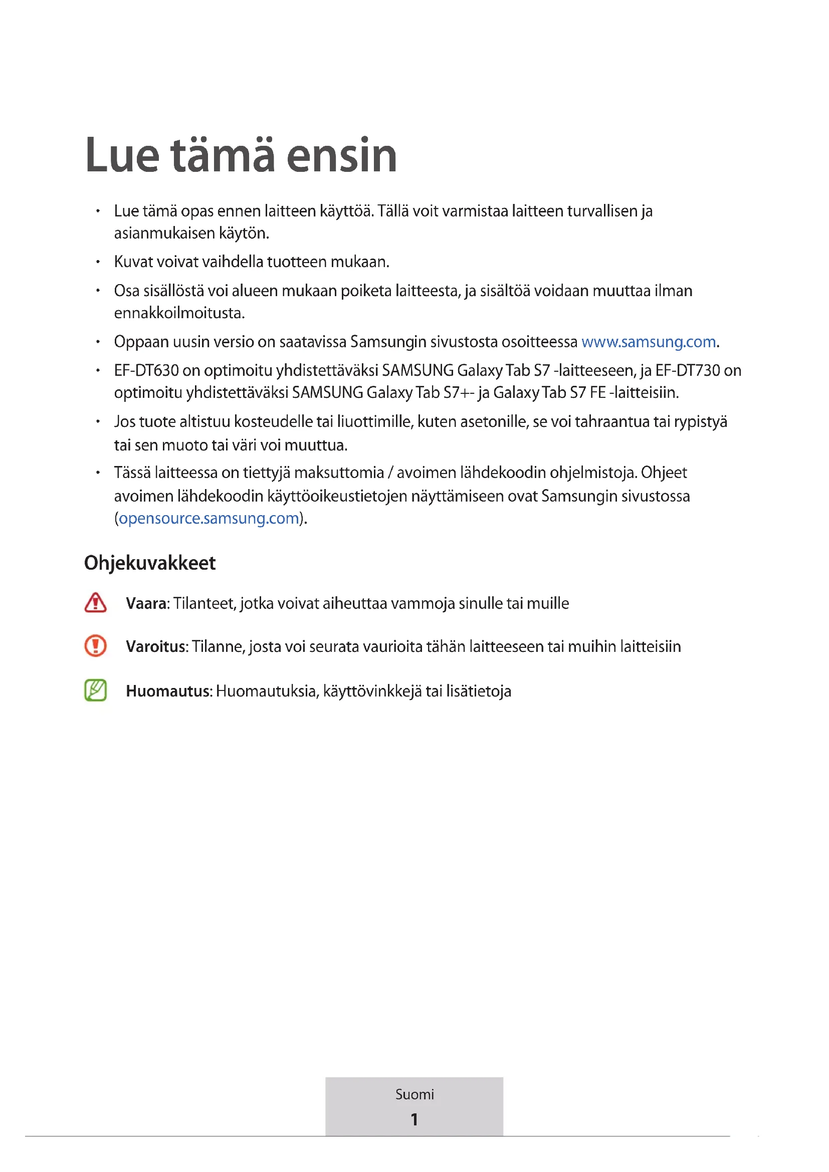 Tässä laitteessa on tiettyjä maksuttomia / avoimen lähdekoodin ohjelmistoja. Ohjeet avoimen lähdekoodin käyttöoikeustietojen näyttämiseen ovat Samsungin sivustossa (opensource.samsung.com). Ohjekuvakkeet Vaara: Tilanteet, jotka voivat aiheuttaa vammoja sinulle tai muille Varoitus: Tilanne, josta voi seurata vaurioita tähän laitteeseen tai muihin laitteisiin Huomautus: Huomautuksia, käyttövinkkejä tai lisätietoja2 Suomi Aloittaminen Pakkauksen sisältö