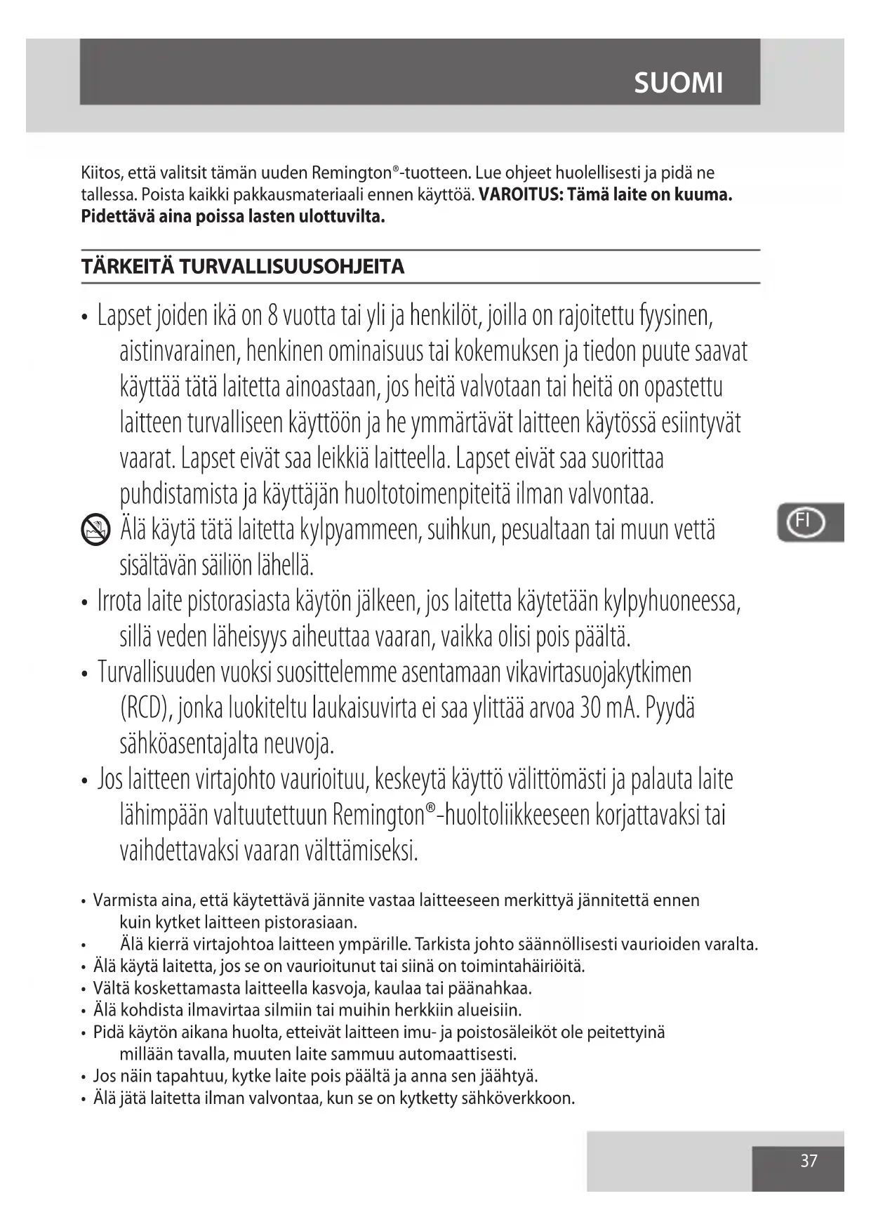- Jos laitteen virtajohto vaurioituu, keskeytä käyttö välittömästi ja palauta laite lähimpään valtuutettuun Remington®-huoltoliikkeeseen korjattavaksi tai vaihdettavaksi vaaran välttämiseksi.
