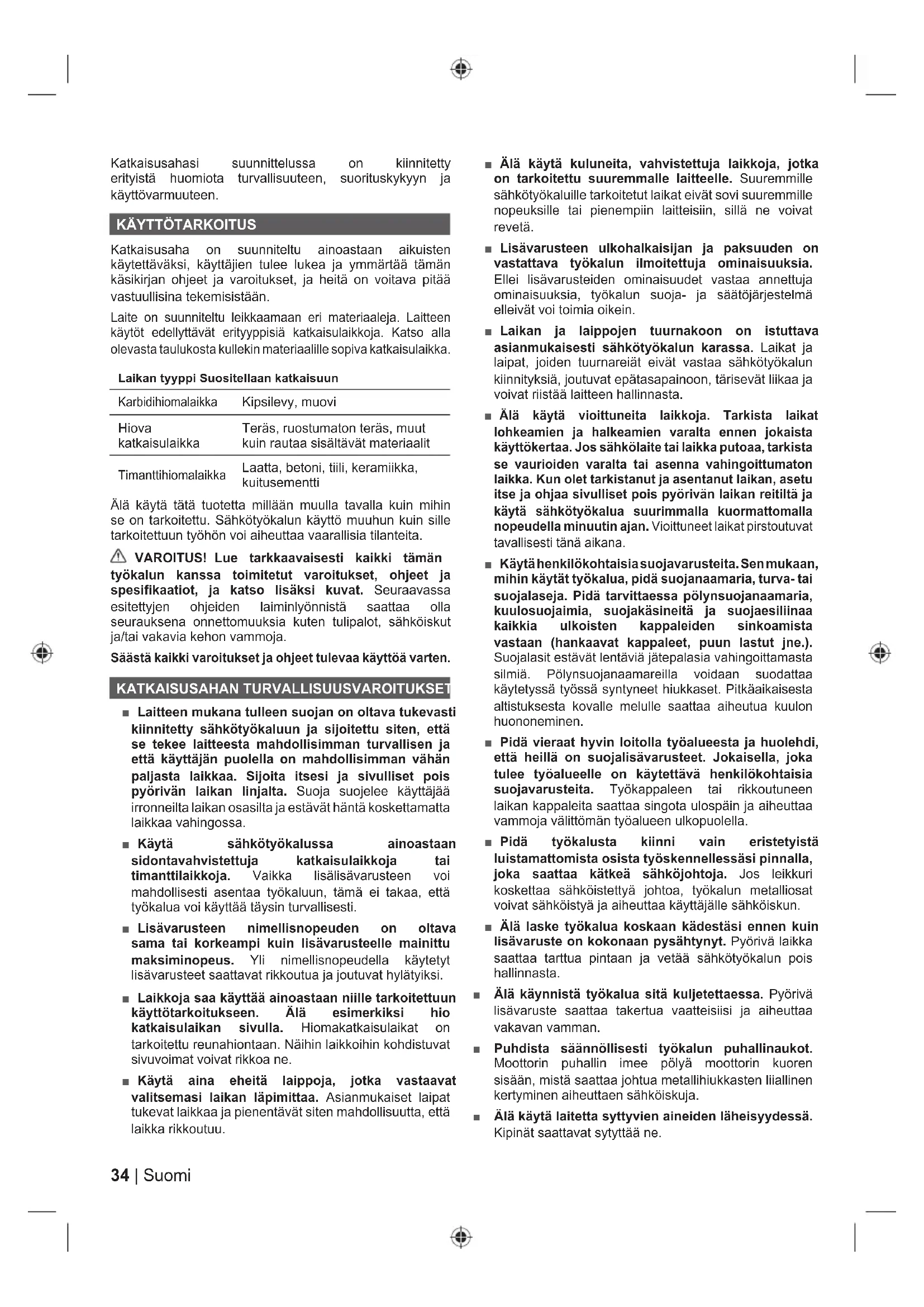 Katkaisusaha on suunniteltu ainoastaan aikuisten käytettäväksi, käyttäjien tulee lukea ja ymmärtää tämän käsikirjan ohjeet ja varoitukset, ja heitä on voitava pitää vastuullisina tekemisistään. Laite on suunniteltu leikkaamaan eri materiaaleja. Laitteen käytöt edellyttävät erityyppisiä katkaisulaikkoja. Katso alla olevasta taulukosta kullekin materiaalille sopiva katkaisulaikka. Laikan tyyppi Suositellaan katkaisuun Karbidihiomalaikka Kipsilevy, muovi Hiova katkaisulaikka Teräs, ruostumaton teräs, muut kuin rautaa sisältävät materiaalit Timanttihiomalaikka Laatta, betoni, tiili, keramiikka, kuitusementti Älä käytä tätä tuotetta millään muulla tavalla kuin mihin se on tarkoitettu. Sähkötyökalun käyttö muuhun kuin sille tarkoitettuun työhön voi aiheuttaa vaarallisia tilanteita. VAROITUS! Lue tarkkaavaisesti kaikki tämän työkalun kanssa toimitetut varoitukset, ohjeet ja spesifikaatiot, ja katso lisäksi kuvat. Seuraavassa esitettyjen ohjeiden laiminlyönnistä saattaa olla seurauksena onnettomuuksia kuten tulipalot, sähköiskut ja/tai vakavia kehon vammoja. Säästä kaikki varoitukset ja ohjeet tulevaa käyttöä varten. KATKAISUSAHAN TURVALLISUUSVAROITUKSET ■ Laitteen mukana tulleen suojan on oltava tukevasti kiinnitetty sähkötyökaluun ja sijoitettu siten, että se tekee laitteesta mahdollisimman turvallisen ja että käyttäjän puolella on mahdollisimman vähän paljasta laikkaa. Sijoita itsesi ja sivulliset pois pyörivän laikan linjalta. Suoja suojelee käyttäjää irronneilta laikan osasilta ja estävät häntä koskettamatta laikkaa vahingossa. ■ Käytä sähkötyökalussa ainoastaan sidontavahvistettuja katkaisulaikkoja tai timanttilaikkoja. Vaikka lisälisävarusteen voi mahdollisesti asentaa työkaluun, tämä ei takaa, että työkalua voi käyttää täysin turvallisesti. ■ Lisävarusteen nimellisnopeuden on oltava sama tai korkeampi kuin lisävarusteelle mainittu maksiminopeus. Yli nimellisnopeudella käytetyt lisävarusteet saattavat rikkoutua ja joutuvat hylätyiksi. ■ Laikkoja saa käyttää ainoastaan niille tarkoitettuun käyttötarkoitukseen. Älä esimerkiksi hio katkaisulaikan sivulla. Hiomakatkaisulaikat on tarkoitettu reunahiontaan. Näihin laikkoihin kohdistuvat sivuvoimat voivat rikkoa ne. ■ Käytä aina eheitä laippoja, jotka vastaavat valitsemasi laikan läpimittaa. Asianmukaiset laipat tukevat laikkaa ja pienentävät siten mahdollisuutta, että laikka rikkoutuu. ■ Älä käytä kuluneita, vahvistettuja laikkoja, jotka on tarkoitettu suuremmalle laitteelle. Suuremmille sähkötyökaluille tarkoitetut laikat eivät sovi suuremmille nopeuksille tai pienempiin laitteisiin, sillä ne voivat revetä. ■ Lisävarusteen ulkohalkaisijan ja paksuuden on vastattava työkalun ilmoitettuja ominaisuuksia. Ellei lisävarusteiden ominaisuudet vastaa annettuja ominaisuuksia, työkalun suoja- ja säätöjärjestelmä elleivät voi toimia oikein. ■ Laikan ja laippojen tuurnakoon on istuttava asianmukaisesti sähkötyökalun karassa. Laikat ja laipat, joiden tuurnareiät eivät vastaa sähkötyökalun kiinnityksiä, joutuvat epätasapainoon, tärisevät liikaa ja voivat riistää laitteen hallinnasta. ■ Älä käytä vioittuneita laikkoja. Tarkista laikat lohkeamien ja halkeamien varalta ennen jokaista käyttökertaa. Jos sähkölaite tai laikka putoaa, tarkista se vaurioiden varalta tai asenna vahingoittumaton laikka. Kun olet tarkistanut ja asentanut laikan, asetu itse ja ohjaa sivulliset pois pyörivän laikan reitiltä ja käytä sähkötyökalua suurimmalla kuormattomalla nopeudella minuutin ajan. Vioittuneet laikat pirstoutuvat tavallisesti tänä aikana. ■ Käytä henkilökohtaisia suojavarusteita. Sen mukaan, mihin käytät työkalua, pidä suojanaamaria, turva- tai suojalaseja. Pidä tarvittaessa pölynsuojanaamaria, kuulosuojaimia, suojakäsineitä ja suojaesiliinaa kaikkia ulkoisten kappaleiden sinkoamista vastaan (hankaavat kappaleet, puun lastut jne.). Suojalasit estävät lentäviä jätepalasia vahingoittamasta silmiä. Pölynsuojanaamareilla voidaan suodattaa käytetyssä työssä syntyneet hiukkaset. Pitkäaikaisesta altistuksesta kovalle melulle saattaa aiheutua kuulon huononeminen. ■ Pidä vieraat hyvin loitolla työalueesta ja huolehdi, että heillä on suojalisävarusteet. Jokaisella, joka tulee työalueelle on käytettävä henkilökohtaisia suojavarusteita. Työkappaleen tai rikkoutuneen laikan kappaleita saattaa singota ulospäin ja aiheuttaa vammoja välittömän työalueen ulkopuolella. ■ Pidä työkalusta kiinni vain eristetyistä luistamattomista osista työskennellessäsi pinnalla, joka saattaa kätkeä sähköjohtoja. Jos leikkuri koskettaa sähköistettyä johtoa, työkalun metalliosat voivat sähköistyä ja aiheuttaa käyttäjälle sähköiskun. ■ Älä laske työkalua koskaan kädestäsi ennen kuin lisävaruste on kokonaan pysähtynyt. Pyörivä laikka saattaa tarttua pintaan ja vetää sähkötyökalun pois hallinnasta. ■ Älä käynnistä työkalua sitä kuljetettaessa. Pyörivä lisävaruste saattaa takertua vaatteisiisi ja aiheuttaa vakavan vamman. ■ Puhdista säännöllisesti työkalun puhallinaukot. Moottorin puhallin imee pölyä moottorin kuoren sisään, mistä saattaa johtua metallihiukkasten liiallinen kertyminen aiheuttaen sähköiskuja. ■ Älä käytä laitetta syttyvien aineiden läheisyydessä. Kipinät saattavat sytyttää ne.35 Suomi |