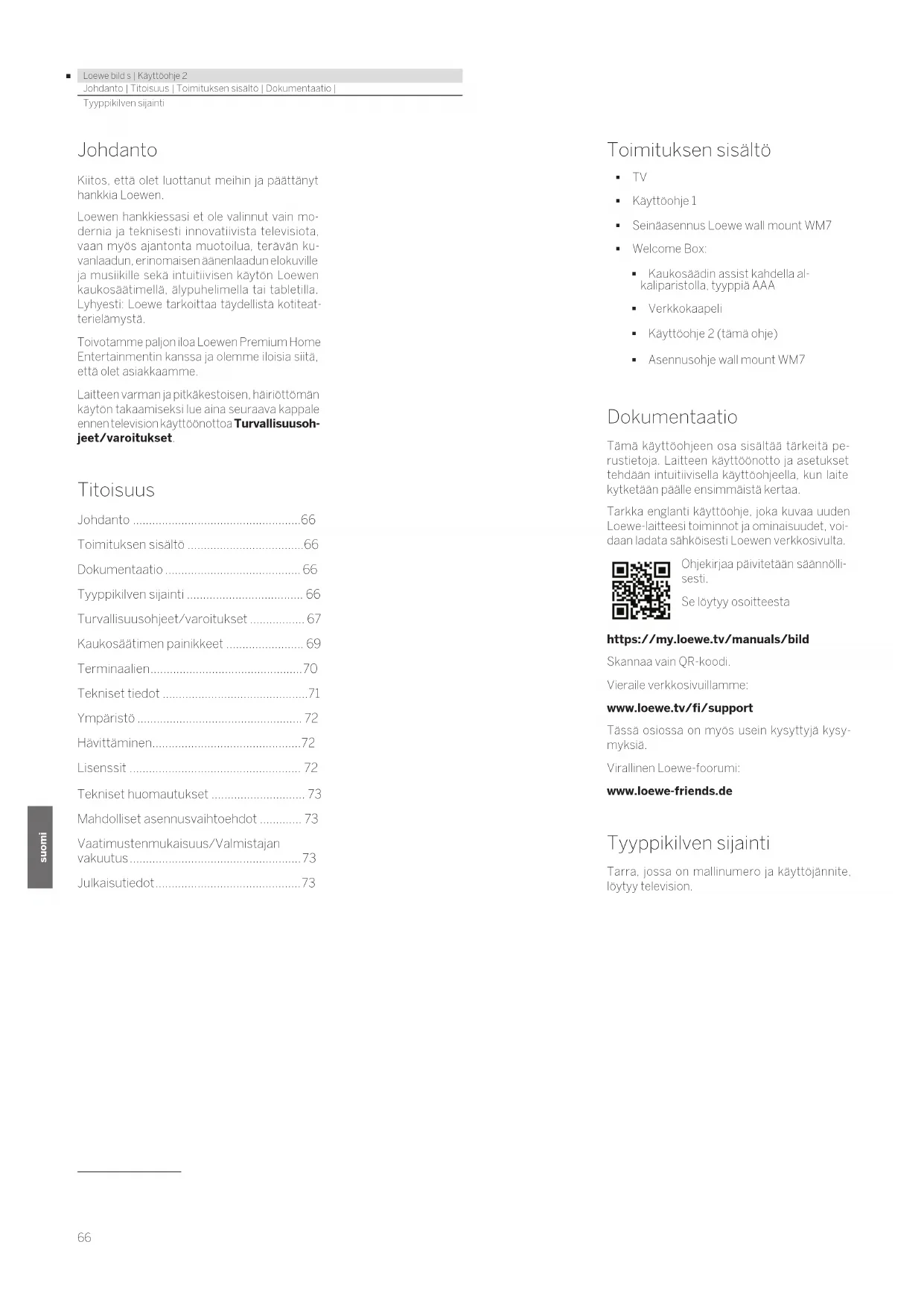 Käyttöohje 1 Seinäasennus Loewe wall mount WM7 Welcome Box: Kaukosäädin assist kahdella al- kaliparistolla, tyyppiä AAA Verkkokaapeli Käyttöohje 2 (tämä ohje) Asennusohje wall mount WM7 Dokumentaatio Tämä käyttöohjeen osa sisältää tärkeitä pe- rustietoja. Laitteen käyttöönotto ja asetukset tehdään intuitiivisella käyttöohjeella, kun laite kytketään päälle ensimmäistä kertaa. Tarkka englanti käyttöohje, joka kuvaa uuden Loewe-laitteesi toiminnot ja ominaisuudet, voi- daan ladata sähköisesti Loewen verkkosivulta. Ohjekirjaa päivitetään säännölli- sesti. Se löytyy osoitteesta https://my.loewe.tv/manuals/bild Skannaa vain QR-koodi. Vieraile verkkosivuillamme: www.loewe.tv/fi/support Tässä osiossa on myös usein kysyttyjä kysy- myksiä. Virallinen Loewe-foorumi: www.loewe-friends.de Tyyppikilven sijainti Tarra, jossa on mallinumero ja käyttöjännite, löytyy television.67 deutsch suomi