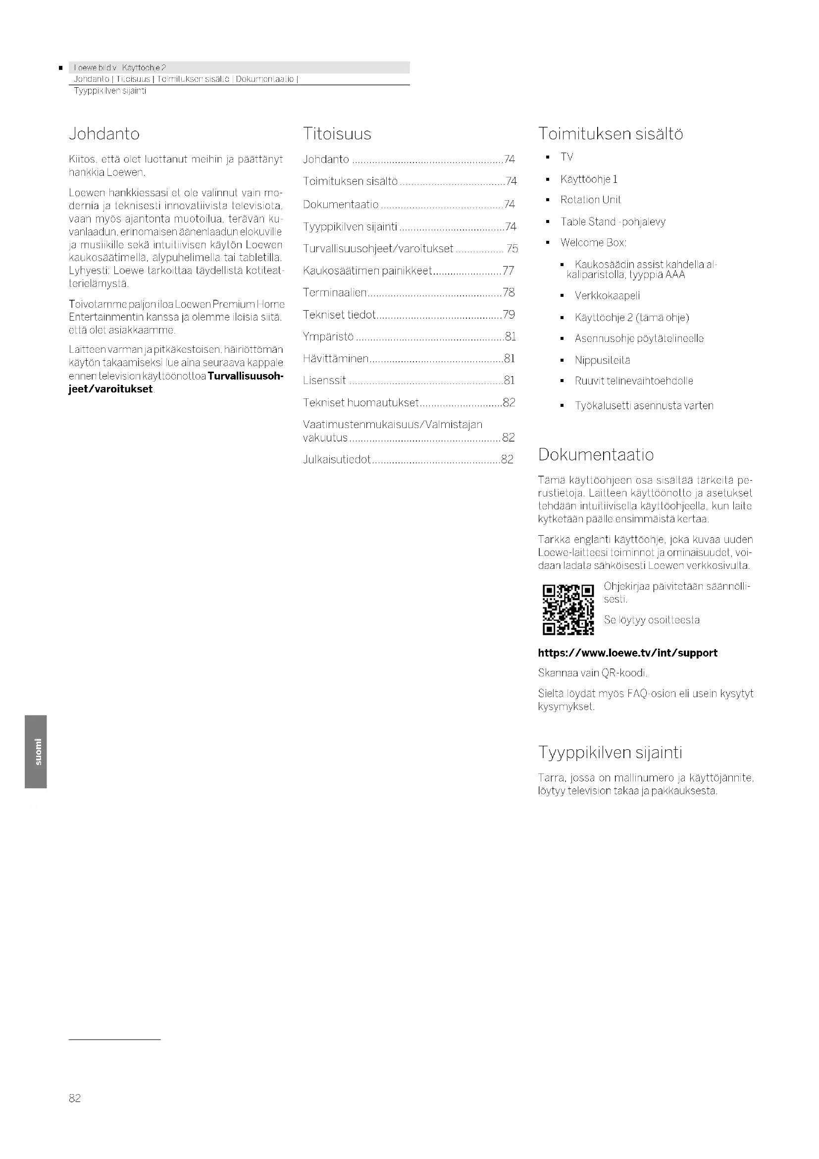 Käyttöohje 1 Rotation Unit Table Stand -pohjalevy Welcome Box: Kaukosäädin assist kahdella al- kaliparistolla, tyyppiä AAA Verkkokaapeli Käyttöohje 2 (tämä ohje) Asennusohje pöytätelineelle Nippusiteitä Ruuvit telinevaihtoehdolle Työkalusetti asennusta varten Dokumentaatio Tämä käyttöohjeen osa sisältää tärkeitä pe- rustietoja. Laitteen käyttöönotto ja asetukset tehdään intuitiivisella käyttöohjeella, kun laite kytketään päälle ensimmäistä kertaa. Tarkka englanti käyttöohje, joka kuvaa uuden Loewe-laitteesi toiminnot ja ominaisuudet, voi- daan ladata sähköisesti Loewen verkkosivulta. Ohjekirjaa päivitetään säännölli- sesti. Se löytyy osoitteesta https://www.loewe.tv/int/support Skannaa vain QR-koodi. Sieltä löydät myös FAQ-osion eli usein kysytyt kysymykset. Tyyppikilven sijainti Tarra, jossa on mallinumero ja käyttöjännite, löytyy television takaa ja pakkauksesta.83 deutsch suomi