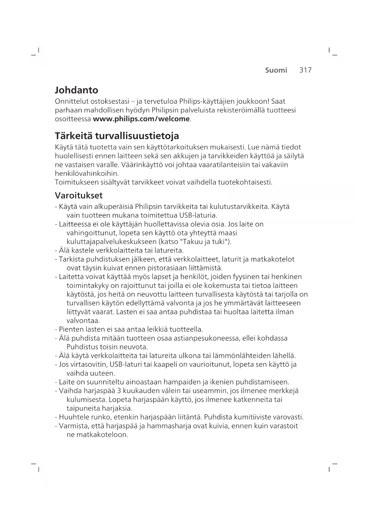 Suomi Johdanto Onnittelut ostoksestasi – ja tervetuloa Philips-käyttäjien joukkoon! Saat parhaan mahdollisen hyödyn Philipsin palveluista rekisteröimällä tuotteesi osoitteessa www.philips.com/welcome. Tärkeitä turvallisuustietoja Käytä tätä tuotetta vain sen käyttötarkoituksen mukaisesti. Lue nämä tiedot huolellisesti ennen laitteen sekä sen akkujen ja tarvikkeiden käyttöä ja säilytä ne vastaisen varalle. Väärinkäyttö voi johtaa vaaratilanteisiin tai vakaviin henkilövahinkoihin. Toimitukseen sisältyvät tarvikkeet voivat vaihdella tuotekohtaisesti. Varoitukset - Käytä vain alkuperäisiä Philipsin tarvikkeita tai kulutustarvikkeita. Käytä vain tuotteen mukana toimitettua USB-laturia. - Laitteessa ei ole käyttäjän huollettavissa olevia osia. Jos laite on vahingoittunut, lopeta sen käyttö ota yhteyttä maasi kuluttajapalvelukeskukseen (katso "Takuu ja tuki"). - Älä kastele verkkolaitteita tai latureita. - Tarkista puhdistuksen jälkeen, että verkkolaitteet, laturit ja matkakotelot ovat täysin kuivat ennen pistorasiaan liittämistä. - Laitetta voivat käyttää myös lapset ja henkilöt, joiden fyysinen tai henkinen toimintakyky on rajoittunut tai joilla ei ole kokemusta tai tietoa laitteen käytöstä, jos heitä on neuvottu laitteen turvallisesta käytöstä tai tarjolla on turvallisen käytön edellyttämä valvonta ja jos he ymmärtävät laitteeseen liittyvät vaarat. Lasten ei saa antaa puhdistaa tai huoltaa laitetta ilman valvontaa. - Pienten lasten ei saa antaa leikkiä tuotteella. - Älä puhdista mitään tuotteen osaa astianpesukoneessa, ellei kohdassa Puhdistus toisin neuvota. - Älä käytä verkkolaitteita tai latureita ulkona tai lämmönlähteiden lähellä. - Jos virtasovitin, USB-laturi tai kaapeli on vaurioitunut, lopeta sen käyttö ja vaihda uuteen. - Laite on suunniteltu ainoastaan hampaiden ja ikenien puhdistamiseen. - Vaihda harjaspää 3 kuukauden välein tai useammin, jos ilmenee merkkejä kulumisesta. Lopeta harjaspään käyttö, jos ilmenee katkenneita tai taipuneita harjaksia. - Huuhtele runko, etenkin harjaspään liitäntä. Puhdista kumitiiviste varovasti. - Varmista, että harjaspää ja hammasharja ovat kuivia, ennen kuin varastoit ne matkakoteloon.318 Suomi - Vältä suoraa kosketusta tuotteisiin, jotka sisältävät eteerisiä öljyjä tai kookosöljyä. Niiden koskettaminen voi johtaa harjasten irtoamiseen. - Enimmäiskäyttökorkeus on 4500 metriä. - Tietoa Philipsin tuotteissa olevista REACH-aineista on osoitteessa www.philips.com/REACH Lääketieteelliset varoitukset - Lopeta laitteen käyttö ja kysy neuvoa hammaslääkäriltä tai lääkäriltä, jos käytön jälkeen ilmenee voimakasta tai pitkittynyttä verenvuotoa tai jos laitteen käyttö tuntuu epämukavalta tai aiheuttaa kipua. - Jos sinulla on sydämentahdistin tai muu kehonsisäinen laite, kysy neuvoa lääkäriltä tai kyseisen laitteen valmistajalta ennen käyttöä. - Laite on tarkoitettu henkilökohtaiseen käyttöön, ei useiden käyttäjien jaettavaksi. Paristoja koskevat turvallisuusohjeet - Tässä laitteessa on akkuja, jotka voi poistaa vain ammattilainen. - Pidä tuote ja paristot poissa tulen läheltä äläkä altista niitä suoralle auringonvalolle tai korkeille lämpötiloille. - Jos tuote kuumenee epätavallisen paljon, siitä tulee hajua, se muuttaa väriä tai jos lataaminen kestää tavallista pidempään, lopeta tuotteen käyttö ja lataaminen ja ota yhteyttä Philipsiin. - Älä laita tuotetta ja sen paristoja mikroaaltouuniin tai induktioliedelle. - Älä avaa, muokkaa, lävistä, vahingoita ja tai pura laitetta tai paristoja, jotta paristot eivät kuumene tai vuoda myrkyllisiä tai vaarallisia aineita. Älä aiheuta paristoihin oikosulkua äläkä ylilataa tai lataa niitä käänteisesti. - Tämän laitteen akkuja ei voi vaihtaa. Kun akku on kulunut loppuun, laite on hävitettävä asianmukaisesti. Perehdy kierrätystä käsittelevään osioon. - Lataa vain Philips WAA1001- tai WAA2001-laturilla tai turvahyväksytyillä IPX4-verkkolaitteilla, joiden tulo on 100‑240V~; 50/60Hz; 3,5W ja lähtö on 5Vdc; 2,5W. Verkkolaitteiden luettelon löydät osoitteesta www.philips.com/support. - Lataa ja käytä tuotetta 0–40 °C:n lämpötilassa. Säilytys ja kuljetus Lämpötila -20–60 °C. Sähkömagneettiset kentät (EMF) Tämä Philips-laite vastaa kaikkia sähkömagneettisia kenttiä (EMF) koskevia standardeja ja säännöksiä.319 Suomi SYMBOLIEN LUETTELO Tuotteessa voi olla seuraavanlaisia merkkejä: Symbolin merkitys: lue käyttöohjeet ennen laitteen käyttöä. Tämä symboli osoittaa käyttämään osoitettua virtalähdettä. Käyttötarkoitus Tämä Sonicare‑sähköhammasharja on tarkoitettu hampaisiin kertyneen plakin ja ruokajäämien poistamiseen hammasmädän ilmenemisen vähentämiseksi sekä suuterveyden parantamiseksi ja ylläpitämiseksi. Sonicare- sähköhammasharja on tarkoitettu kuluttajien kotikäyttöön. Aikuisen on valvottava lasten hammasharjan käyttöä. Philips Sonicare -hammasharja (kuva 1) 1 Harjaspään suojus 2 Harjaspää(t) 3 Runko 4 Virtapainike 5 Akun merkkivalo 6 USB-laturi (sovitin ei sisälly pakkaukseen) 7 Matkakotelo Huomautus: Mukana toimitettavat tarvikkeet voivat vaihdella ostetun mallin mukaan.320 Suomi Käyttöönotto Harjaspään kiinnittäminen