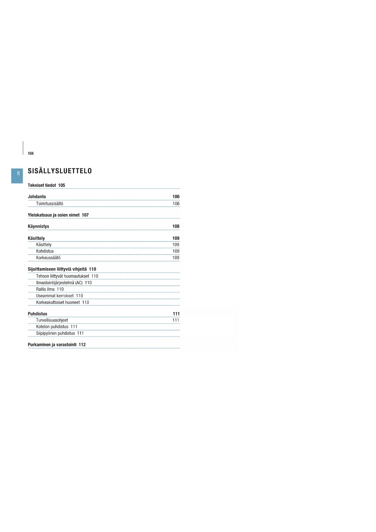 SISÄLLYSLUETTELO Tekniset tiedot 105 Johdanto 106 Toimitussisältö 106 Yleiskatsaus ja osien nimet 107 Käynnistys 108 Käsittely 109 Käsittely 109 Kohdistus 109 Korkeussäätö 109 Sijoittamiseen liittyviä vihjeitä 110 Tehoon liittyvät huomautukset 110 Ilmastointijärjestelmä (AC) 110 Raitis ilma 110 Useammat kerrokset 110 Korkeakattoiset huoneet 110 Puhdistus 111 Turvallisuusohjeet 111 Kotelon puhdistus 111 Siipipyörien puhdistus 111 Purkaminen ja varastointi 112105