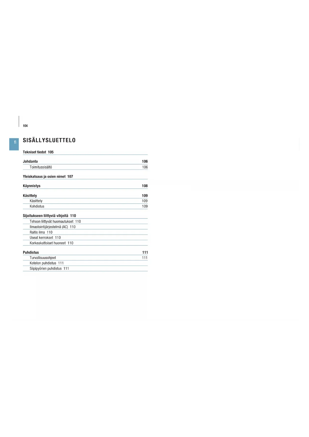 SISÄLLYSLUETTELO Tekniset tiedot 105 Johdanto 106 Toimitussisältö 106 Yleiskatsaus ja osien nimet 107 Käynnistys 108 Käsittely 109 Käsittely 109 Kohdistus 109 Sijoitukseen liittyviä vihjeitä 110 Tehoon liittyvät huomautukset 110 Ilmastointijärjestelmä (AC) 110 Raitis ilma 110 Useat kerrokset 110 Korkeakattoiset huoneet 110 Puhdistus 111 Turvallisuusohjeet 111 Kotelon puhdistus 111 Siipipyörien puhdistus 111105