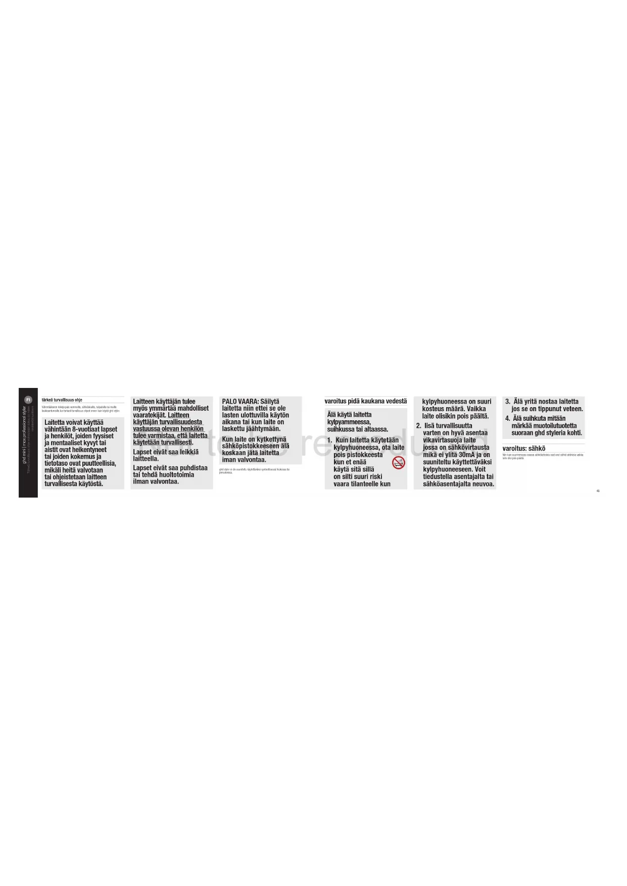 ghd mini | max professional styler Tärkeä turvallisuus ohje valmistajan takuu ja miten rekisteröit tuotteen tärkeä turvallisuus ohje Vähentääkseen riskeja palo vammoilta, sähköiskuilta, tulipaloilta tai muilta loukkaantumisilta lue tarkasti turvallisuus ohjeet ennen kuin käytät ghd styler. Laitetta voivat käyttää vähintään 8-vuotiaat lapset ja henkilöt, joiden fyysiset ja mentaaliset kyvyt tai aistit ovat heikentyneet tai joiden kokemus ja tietotaso ovat puutteellisia, mikäli heitä valvotaan tai ohjeistetaan laitteen turvallisesta käytöstä. Laitteen käyttäjän tulee myös ymmärtää mahdolliset vaaratekijät. Laitteen käyttäjän turvallisuudesta vastuussa olevan henkilön tulee varmistaa, että laitetta käytetään turvallisesti. Lapset eivät saa leikkiä laitteella. Lapset eivät saa puhdistaa tai tehdä huoltotoimia ilman valvontaa. PALO VAARA: Säilytä laitetta niin ettei se ole lasten ulottuvilla käytön aikana tai kun laite on laskettu jäähtymään. Kun laite on kytkettynä sähköpistokkeeseen älä koskaan jätä laitetta iman valvontaa. ghd styler ei ole suuniteltu käytettäväksi synteettisessä hiuksissa tai peruukeissa. varoitus pidä kaukana vedestä Älä käytä laitetta kylpyammeessa, suihkussa tai altaassa.