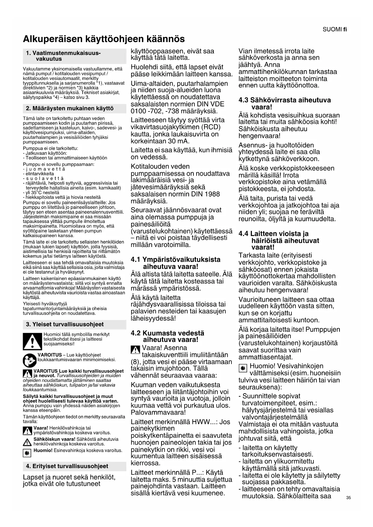 Alkuperäisen käyttöohjeen käännös Vakuutamme yksinomaisella vastuullamme, että nämä pumput / kotitalouden vesipumput / kotitalouden vesiautomaatit, merkitty tyyppitunnuksella ja sarjanumerolla *1), vastaavat direktiivien *2) ja normien *3) kaikkia asiaankuuluvia määräyksiä. Tekniset asiakirjat, säilytyspaikka *4) – katso sivu 3. Tämä laite on tarkoitettu puhtaan veden pumppaamiseen kodin ja puutarhan piirissä, sadettamiseen ja kasteluun, kaivo-, sadevesi- ja käyttövesipumpuksi, uima-altaiden, puutarhalampien ja vesisäiliöiden tyhjäksi pumppaamiseen. Pumppua ei ole tarkoitettu: - Jatkuvaan käyttöön: - Teolliseen tai ammattimaiseen käyttöön Pumppu ei sovellu pumppaamaan: -juomavettä - elintarvikkeita -suolavettä - räjähtäviä, helposti syttyviä, aggressiivisia tai terveydelle haitallisia aineita (esim. kamikaalit) - yli 35°C nesteitä - hiekkapitoista vettä ja hiovia nesteitä Pumppu ei sovellu paineenlisäyslaitteille: Jos pumppu on liitettävä jo paineelliseen johtoon, täytyy sen eteen asentaa paineenalennusventtiili. Järjestelmän maksimipaine ei saa missään tapauksessa ylittää pumpulle ilmoitettua maksimipainetta. Huomioitava on myös, että syöttöpaine lasketaan yhteen pumpun katkaisupaineen kanssa. Tämä laite ei ole tarkoitettu sellaisten henkilöiden (mukaan lukien lapset) käyttöön, joilla fyysisiä, aistimellisia tai henkisiä rajoitteita tai riittämätön kokemus ja/tai tietämys laitteen käytöstä. Laitteeseen ei saa tehdä omavaltaisia muutoksia eikä siinä saa käyttää sellaisia osia, joita valmistaja ei ole testannut ja hyväksynyt. Laitteen kaikenlainen epäasianmukainen käyttö on määräystenvastaista; siitä voi syntyä ennalta arvaamattomia vahinkoja! Määräysten vastaisesta käytöstä aiheutuvista vaurioista vastaa ainoastaan käyttäjä. Yleisesti hyväksyttyjä tapaturmantorjuntamääräyksiä ja oheisia turvallisuusohjeita on noudatettava. Huomioi tällä symbolilla merkityt tekstikohdat itsesi ja laitteesi suojaamiseksi! VAROITUS – Lue käyttöohjeet loukkaantumisvaaran minimoimiseksi. VAROITUS Lue kaikki turvallisuusohjeet ja neuvot. Turvallisuusohjeiden ja muiden ohjeiden noudattamatta jättäminen saattaa aiheuttaa sähköiskun, tulipalon ja/tai vakavia loukkaantumisia. Säilytä kaikki turvallisuusohjeet ja muut ohjeet huolellisesti tulevaa käyttöä varten. Anna pumppu vain yhdessä näiden asiakirjojen kanssa eteenpäin. Tämän käyttöohjeen tiedot on merkitty seuraavalla tavalla: Vaara! Henkilövahinkoja tai ympäristövahinkoja koskeva varoitus. Sähköiskun vaara! Sähköstä aiheutuvia henkilövahinkoja koskeva varoitus. Huomio! Esinevahinkoja koskeva varoitus. Lapset ja nuoret sekä henkilöt, jotka eivät ole tutustuneet käyttöoppaaseen, eivät saa käyttää tätä laitetta. Huolehdi siitä, että lapset eivät pääse leikkimään laitteen kanssa. Uima-altaiden, puutarhalampien ja niiden suoja-alueiden luona käytettäessä on noudatettava saksalaisten normien DIN VDE 0100 -702, -738 määräyksiä. Laitteeseen täytyy syöttää virta vikavirtasuojakytkimen (RCD) kautta, jonka laukaisuvirta on korkeintaan 30 mA. Laitetta ei saa käyttää, kun ihmisiä on vedessä. Kotitalouden veden pumppaamisessa on noudattava lakimääräisiä vesi- ja jätevesimääräyksiä sekä saksalaisen normin DIN 1988 määräyksiä. Seuraavat jäännösvaarat ovat aina olemassa pumppuja ja painesäiliöitä (varustelukohtainen) käytettäessä – niitä ei voi poistaa täydellisesti millään varotoimilla.