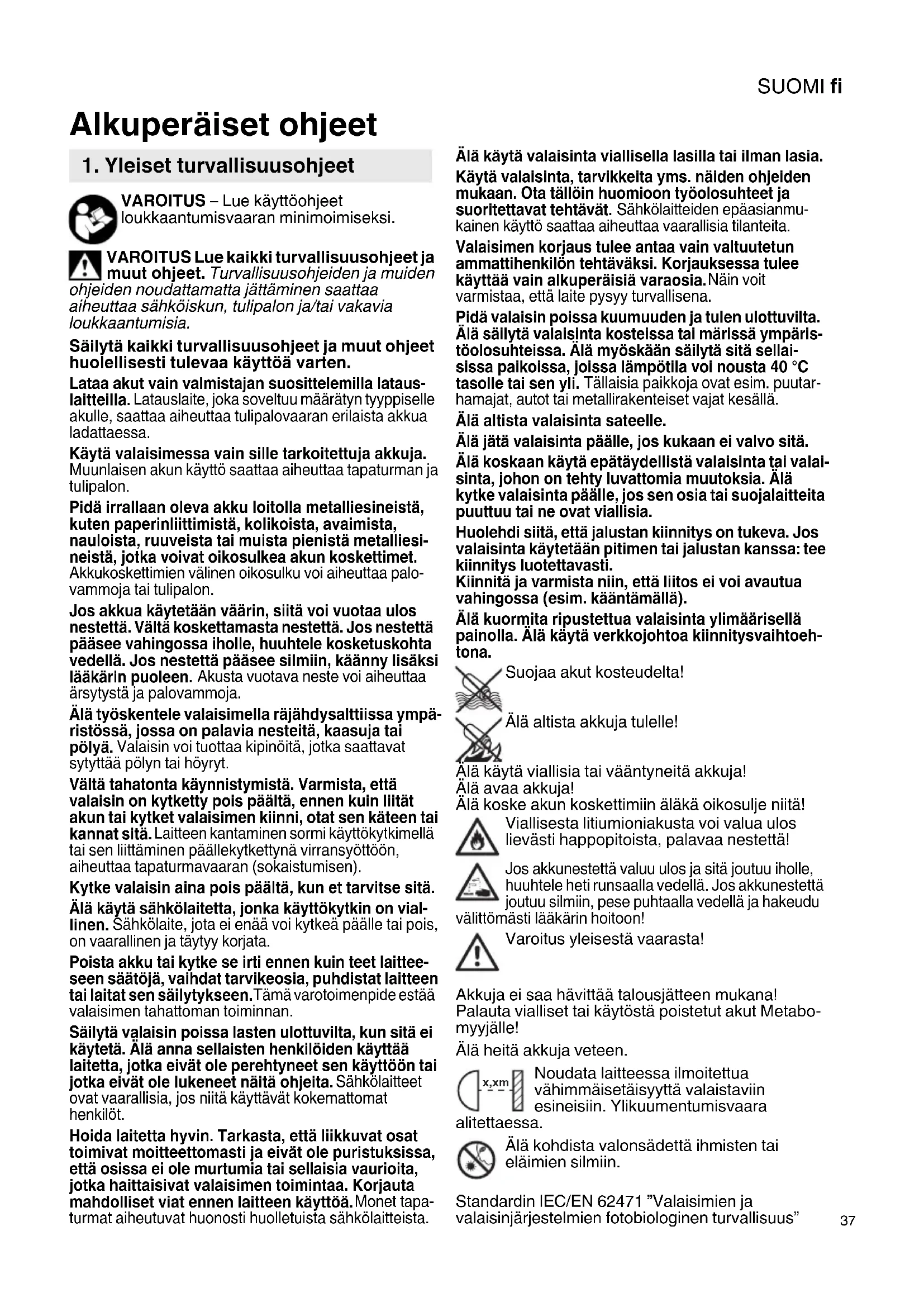 VAROITUS – Lue käyttöohjeet loukkaantumisvaaran minimoimiseksi. VAROITUS Lue kaikki turvallisuusohjeet ja muut ohjeet. Turvallisuusohjeiden ja muiden ohjeiden noudattamatta jättäminen saattaa aiheuttaa sähköiskun, tulipalon ja/tai vakavia loukkaantumisia. Säilytä kaikki turvallisuusohjeet ja muut ohjeet huolellisesti tulevaa käyttöä varten. Lataa akut vain valmistajan suosittelemilla lataus- laitteilla. Latauslaite, joka soveltuu määrätyn tyyppiselle akulle, saattaa aiheuttaa tulipalovaaran erilaista akkua ladattaessa. Käytä valaisimessa vain sille tarkoitettuja akkuja. Muunlaisen akun käyttö saattaa aiheuttaa tapaturman ja tulipalon. Pidä irrallaan oleva akku loitolla metalliesineistä, kuten paperinliittimistä, kolikoista, avaimista, nauloista, ruuveista tai muista pienistä metalliesi- neistä, jotka voivat oikosulkea akun koskettimet. Akkukoskettimien välinen oikosulku voi aiheuttaa palo- vammoja tai tulipalon. Jos akkua käytetään väärin, siitä voi vuotaa ulos nestettä. Vältä koskettamasta nestettä. Jos nestettä pääsee vahingossa iholle, huuhtele kosketuskohta vedellä. Jos nestettä pääsee silmiin, käänny lisäksi lääkärin puoleen. Akusta vuotava neste voi aiheuttaa ärsytystä ja palovammoja. Älä työskentele valaisimella räjähdysalttiissa ympä- ristössä, jossa on palavia nesteitä, kaasuja tai pölyä. Valaisin voi tuottaa kipinöitä, jotka saattavat sytyttää pölyn tai höyryt. Vältä tahatonta käynnistymistä. Varmista, että valaisin on kytketty pois päältä, ennen kuin liität akun tai kytket valaisimen kiinni, otat sen käteen tai kannat sitä. Laitteen kantaminen sormi käyttökytkimellä tai sen liittäminen päällekytkettynä virransyöttöön, aiheuttaa tapaturmavaaran (sokaistumisen). Kytke valaisin aina pois päältä, kun et tarvitse sitä. Älä käytä sähkölaitetta, jonka käyttökytkin on vial- linen. Sähkölaite, jota ei enää voi kytkeä päälle tai pois, on vaarallinen ja täytyy korjata. Poista akku tai kytke se irti ennen kuin teet laittee- seen säätöjä, vaihdat tarvikeosia, puhdistat laitteen tai laitat sen säilytykseen. Tämä varotoimenpide estää valaisimen tahattoman toiminnan. Säilytä valaisin poissa lasten ulottuvilta, kun sitä ei käytetä. Älä anna sellaisten henkilöiden käyttää laitetta, jotka eivät ole perehtyneet sen käyttöön tai jotka eivät ole lukeneet näitä ohjeita. Sähkölaitteet ovat vaarallisia, jos niitä käyttävät kokemattomat henkilöt. Hoida laitetta hyvin. Tarkasta, että liikkuvat osat toimivat moitteettomasti ja eivät ole puristuksissa, että osissa ei ole murtumia tai sellaisia vaurioita, jotka haittaisivat valaisimen toimintaa. Korjauta mahdolliset viat ennen laitteen käyttöä. Monet tapa- turmat aiheutuvat huonosti huolletuista sähkölaitteista. Älä käytä valaisinta viallisella lasilla tai ilman lasia. Käytä valaisinta, tarvikkeita yms. näiden ohjeiden mukaan. Ota tällöin huomioon työolosuhteet ja suoritettavat tehtävät. Sähkölaitteiden epäasianmu- kainen käyttö saattaa aiheuttaa vaarallisia tilanteita. Valaisimen korjaus tulee antaa vain valtuutetun ammattihenkilön tehtäväksi. Korjauksessa tulee käyttää vain alkuperäisiä varaosia. Näin voit varmistaa, että laite pysyy turvallisena. Pidä valaisin poissa kuumuuden ja tulen ulottuvilta. Älä säilytä valaisinta kosteissa tai märissä ympäris- töolosuhteissa. Älä myöskään säilytä sitä sellai- sissa paikoissa, joissa lämpötila voi nousta 40 °C tasolle tai sen yli. Tällaisia paikkoja ovat esim. puutar- hamajat, autot tai metallirakenteiset vajat kesällä. Älä altista valaisinta sateelle. Älä jätä valaisinta päälle, jos kukaan ei valvo sitä. Älä koskaan käytä epätäydellistä valaisinta tai valai- sinta, johon on tehty luvattomia muutoksia. Älä kytke valaisinta päälle, jos sen osia tai suojalaitteita puuttuu tai ne ovat viallisia. Huolehdi siitä, että jalustan kiinnitys on tukeva. Jos valaisinta käytetään pitimen tai jalustan kanssa: tee kiinnitys luotettavasti. Kiinnitä ja varmista niin, että liitos ei voi avautua vahingossa (esim. kääntämällä). Älä kuormita ripustettua valaisinta ylimäärisellä painolla. Älä käytä verkkojohtoa kiinnitysvaihtoeh- tona. Suojaa akut kosteudelta! Älä altista akkuja tulelle! Älä käytä viallisia tai vääntyneitä akkuja! Älä avaa akkuja! Älä koske akun koskettimiin äläkä oikosulje niitä! Viallisesta litiumioniakusta voi valua ulos lievästi happopitoista, palavaa nestettä! Jos akkunestettä valuu ulos ja sitä joutuu iholle, huuhtele heti runsaalla vedellä. Jos akkunestettä joutuu silmiin, pese puhtaalla vedellä ja hakeudu välittömästi lääkärin hoitoon! Varoitus yleisestä vaarasta! Akkuja ei saa hävittää talousjätteen mukana! Palauta vialliset tai käytöstä poistetut akut Metabo- myyjälle! Älä heitä akkuja veteen. Noudata laitteessa ilmoitettua vähimmäisetäisyyttä valaistaviin esineisiin. Ylikuumentumisvaara alitettaessa. Älä kohdista valonsädettä ihmisten tai eläimien silmiin. Standardin IEC/EN 62471 ”Valaisimien ja valaisinjärjestelmien fotobiologinen turvallisuus” Alkuperäiset ohjeet