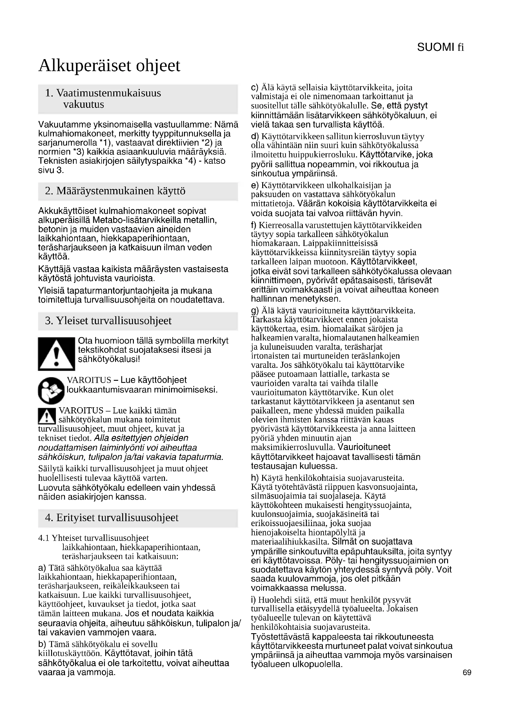 Alkuperäiset ohjeet Vakuutamme yksinomaisella vastuullamme: Nämä kulmahiomakoneet, merkitty tyyppitunnuksella ja sarjanumerolla *1), vastaavat direktiivien *2) ja normien *3) kaikkia asiaankuuluvia määräyksiä. Teknisten asiakirjojen säilytyspaikka *4) - katso sivu 3. Akkukäyttöiset kulmahiomakoneet sopivat alkuperäisillä Metabo-lisätarvikkeilla metallin, betonin ja muiden vastaavien aineiden laikkahiontaan, hiekkapaperihiontaan, teräsharjaukseen ja katkaisuun ilman veden käyttöä. Käyttäjä vastaa kaikista määräysten vastaisesta käytöstä johtuvista vaurioista. Yleisiä tapaturmantorjuntaohjeita ja mukana toimitettuja turvallisuusohjeita on noudatettava. Ota huomioon tällä symbolilla merkityt tekstikohdat suojataksesi itsesi ja sähkötyökalusi! VAROITUS – Lue käyttöohjeet loukkaantumisvaaran minimoimiseksi. VAROITUS – Lue kaikki tämän sähkötyökalun mukana toimitetut turvallisuusohjeet, muut ohjeet, kuvat ja tekniset tiedot. Alla esitettyjen ohjeiden noudattamisen laiminlyönti voi aiheuttaa sähköiskun, tulipalon ja/tai vakavia tapaturmia. Säilytä kaikki turvallisuusohjeet ja muut ohjeet huolellisesti tulevaa käyttöä varten. Luovuta sähkötyökalu edelleen vain yhdessä näiden asiakirjojen kanssa.