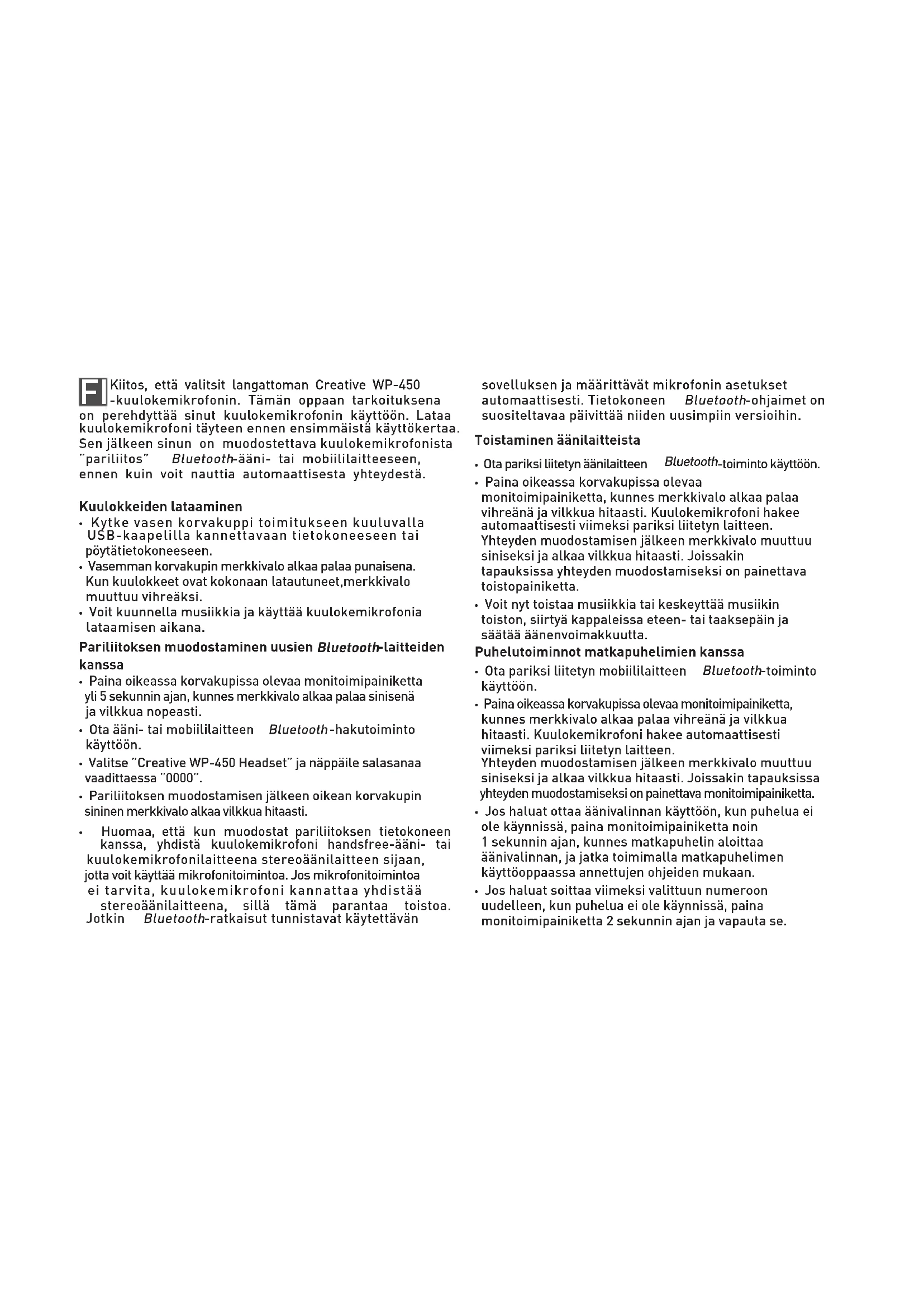 mikrofon Ljudisolerad mikrofon för kristallklart ljud vid kommunikationFI Kiitos, että valitsit langattoman Creative WP-450 -kuulokemikrofonin. Tämän oppaan tarkoituksena on perehdyttää sinut kuulokemikrofonin käyttöön. Lataa kuulokemikrofoni täyteen ennen ensimmäistä käyttökertaa. Sen jälkeen sinun on muodostettava kuulokemikrofonista ”pariliitos” Bluetooth -ääni- tai mobiililaitteeseen, ennen kuin voit nauttia automaattisesta yhteydestä. Kuulokkeiden lataaminen