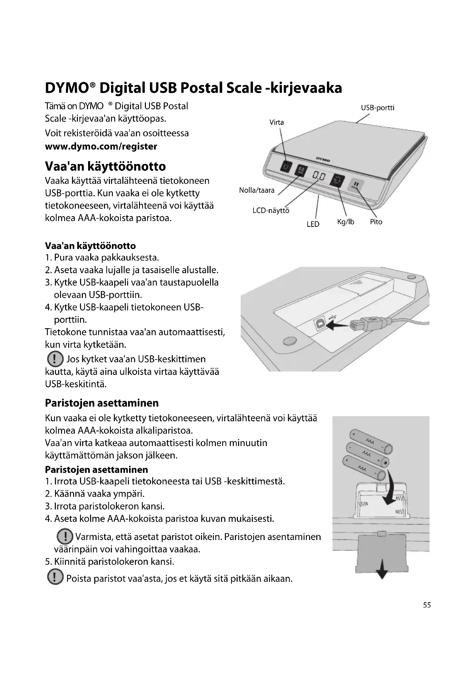 Digital USB Postal Scale -kirjevaa'an käyttöopas. Voit rekisteröidä vaa'an osoitteessa www.dymo.com/register