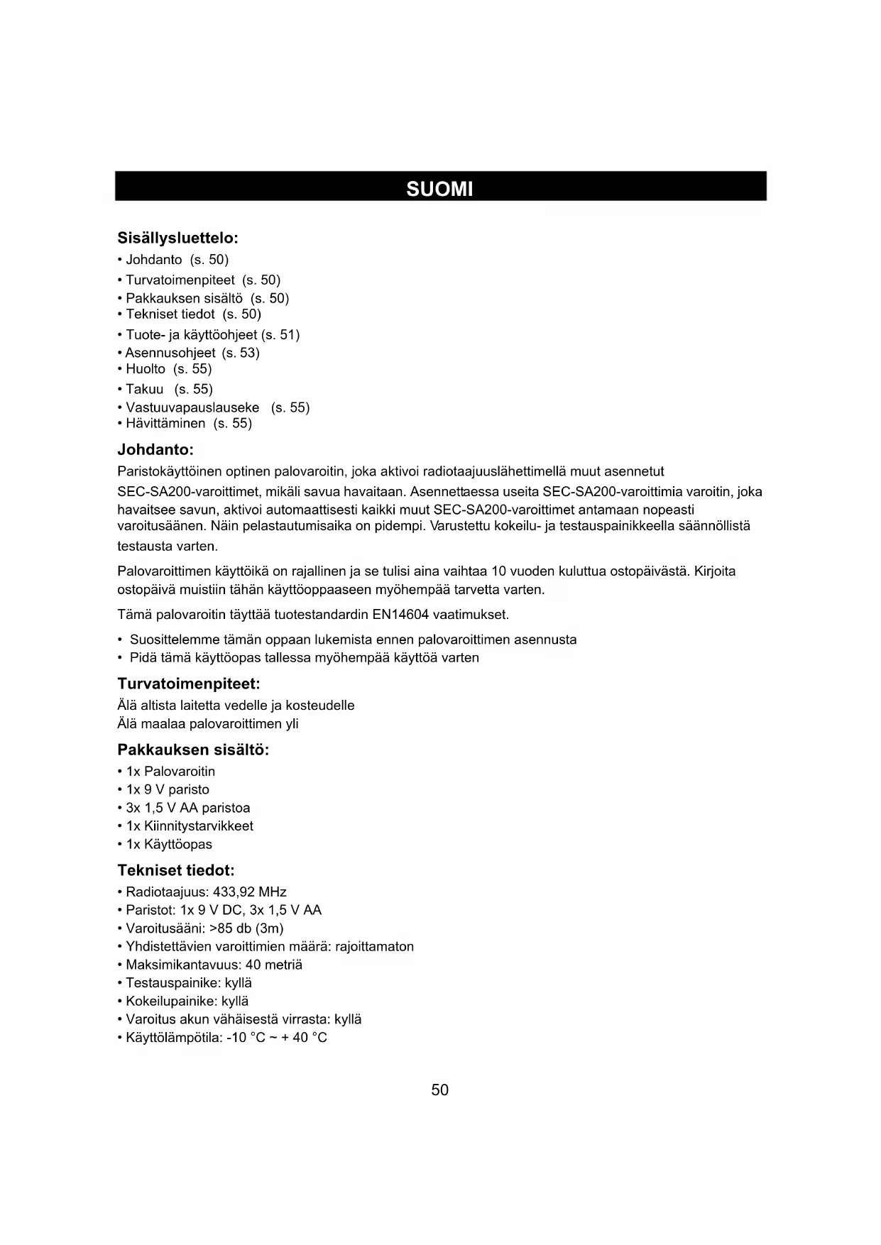 - Hävittäminen (s. 55) Johdanto: Paristokäyttöinen optinen palovaroitin, joka aktivoi radiotaajuuslähettimellä muut asennetut SEC-SA200-varoittimet, mikäli savua havaitaan. Asennettaessa useita SEC-SA200-varoittimia varoitin, joka havaitsee savun, aktivoi automaattisesti kaikki muut SEC-SA200-varoittimet antamaan nopeasti varoitusäänen. Näin pelastautumisaika on pidempi. Varustettu kokeilu- ja testauspainikkeella säännöllistä testausta varten. Palovaroittimen käyttöikä on rajallinen ja se tulisi aina vaihtaa 10 vuoden kuluttua ostopäivästä. Kirjoita ostopäivä muistiin tähän käyttöoppaaseen myöhempää tarvetta varten. Tämä palovaroitin täyttää tuotestandardin EN14604 vaatimukset.