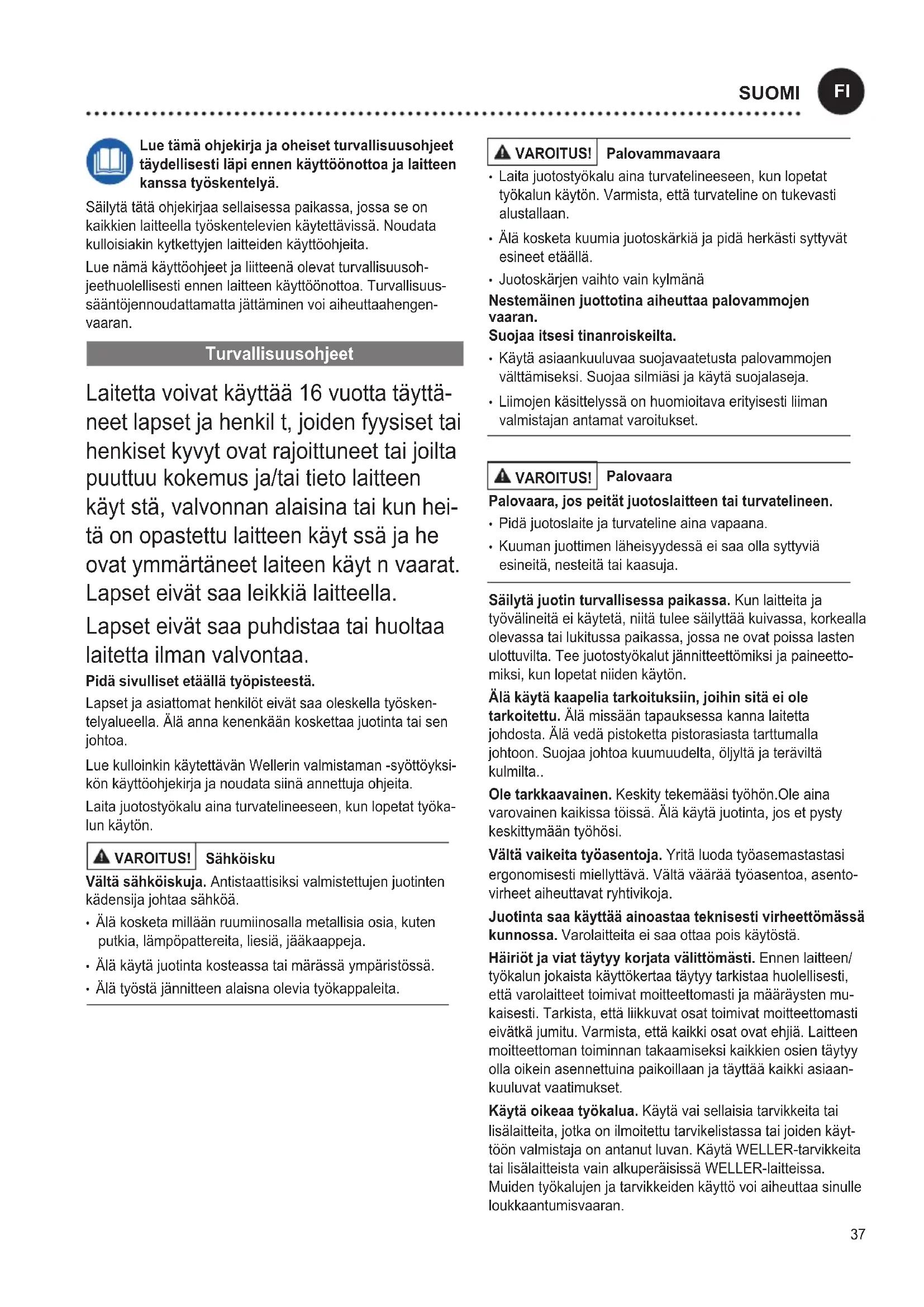 - Kuuman juottimen läheisyydessä ei saa olla syttyviä esineitä, nesteitä tai kaasuja. Säilytä juotin turvallisessa paikassa. Kun laitteita ja työvälineitä ei käytetä, niitä tulee säilyttää kuivassa, korkealla olevassa tai lukitussa paikassa, jossa ne ovat poissa lasten ulottuvilta. Tee juotostyökalut jännitteettömiksi ja paineetto- miksi, kun lopetat niiden käytön. Älä käytä kaapelia tarkoituksiin, joihin sitä ei ole tarkoitettu. Älä missään tapauksessa kanna laitetta johdosta. Älä vedä pistoketta pistorasiasta tarttumalla johtoon. Suojaa johtoa kuumuudelta, öljyltä ja teräviltä kulmilta.. Ole tarkkaavainen. Keskity tekemääsi työhön.Ole aina varovainen kaikissa töissä. lä käytä juotinta, jos et pysty keskittymään työhösi. Vältä vaikeita työasentoja. Yritä luoda työasemastastasi ergonomisesti miellyttävä. Vältä väärää työasentoa, asento- virheet aiheuttavat ryhtivikoja. Juotinta saa käyttää ainoastaa teknisesti virheettömässä kunnossa. Varolaitteita ei saa ottaa pois käytöstä. Häiriöt ja viat täytyy korjata välittömästi. Ennen laitteen/ työkalun jokaista käyttökertaa täytyy tarkistaa huolellisesti, että varolaitteet toimivat moitteettomasti ja määräysten mu- kaisesti. Tarkista, että liikkuvat osat toimivat moitteettomasti eivätkä jumitu. Varmista, että kaikki osat ovat ehjiä. Laitteen moitteettoman toiminnan takaamiseksi kaikkien osien täytyy olla oikein asennettuina paikoillaan ja täyttää kaikki asiaan- kuuluvat vaatimukset. Käytä oikeaa työkalua. Käytä vai sellaisia tarvikkeita tai lisälaitteita, jotka on ilmoitettu tarvikelistassa tai joiden käyt- töön valmistaja on antanut luvan. Käytä WELLER-tarvikkeita tai lisälaitteista vain alkuperäisissä WELLER-laitteissa. Muiden työkalujen ja tarvikkeiden käyttö voi aiheuttaa sinulle loukkaantumisvaaran.