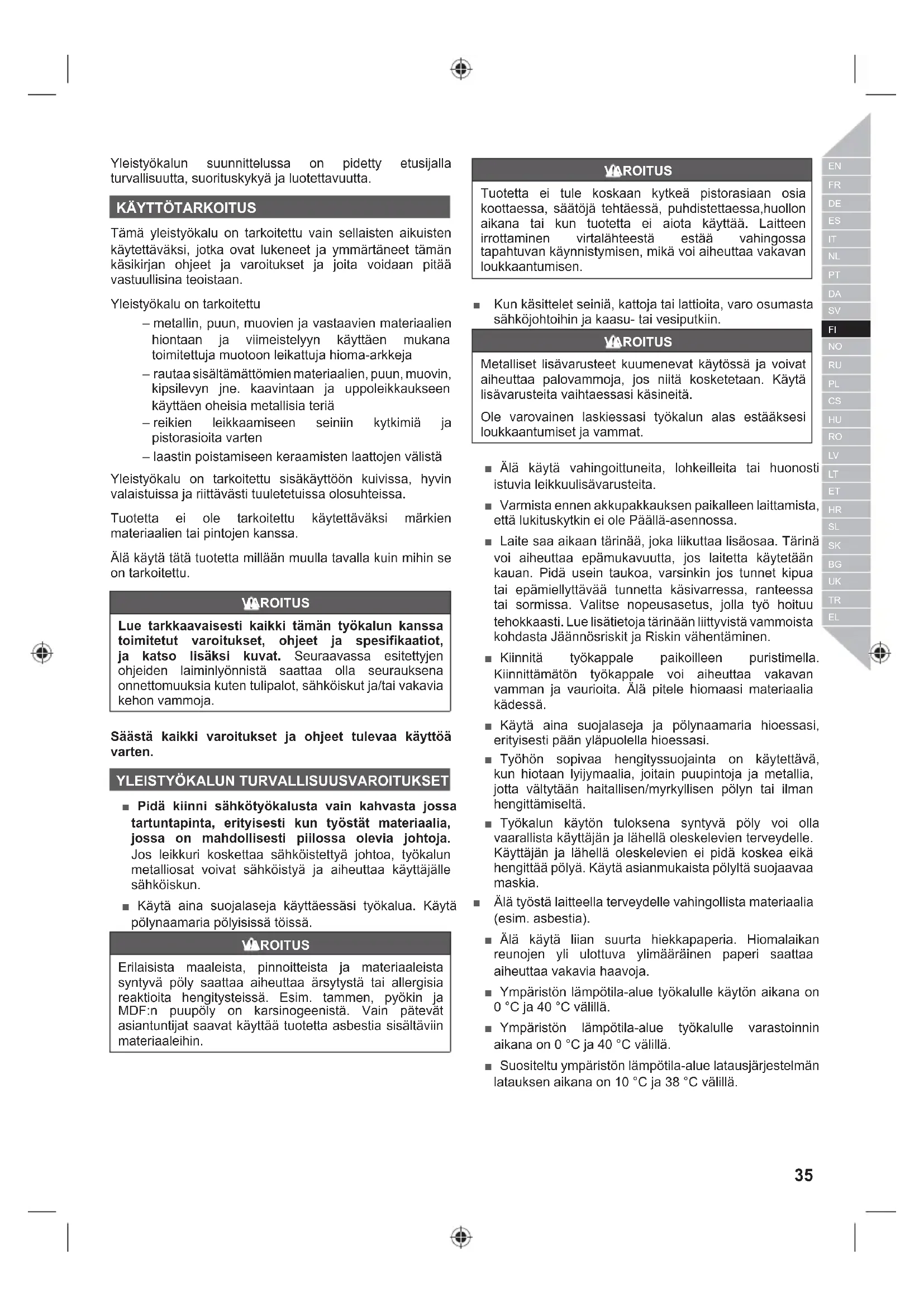 Tämä yleistyökalu on tarkoitettu vain sellaisten aikuisten käytettäväksi, jotka ovat lukeneet ja ymmärtäneet tämän käsikirjan ohjeet ja varoitukset ja joita voidaan pitää vastuullisina teoistaan. Yleistyökalu on tarkoitettu – metallin, puun, muovien ja vastaavien materiaalien hiontaan ja viimeistelyyn käyttäen mukana toimitettuja muotoon leikattuja hioma-arkkeja – rautaa sisältämättömien materiaalien, puun, muovin, kipsilevyn jne. kaavintaan ja uppoleikkaukseen käyttäen oheisia metallisia teriä – reikien leikkaamiseen seiniin kytkimiä ja pistorasioita varten – laastin poistamiseen keraamisten laattojen välistä Yleistyökalu on tarkoitettu sisäkäyttöön kuivissa, hyvin valaistuissa ja riittävästi tuuletetuissa olosuhteissa. Tuotetta ei ole tarkoitettu käytettäväksi märkien materiaalien tai pintojen kanssa. Älä käytä tätä tuotetta millään muulla tavalla kuin mihin se on tarkoitettu. VAROITUS Lue tarkkaavaisesti kaikki tämän työkalun kanssa toimitetut varoitukset, ohjeet ja spesifikaatiot, ja katso lisäksi kuvat. Seuraavassa esitettyjen ohjeiden laiminlyönnistä saattaa olla seurauksena onnettomuuksia kuten tulipalot, sähköiskut ja/tai vakavia kehon vammoja. Säästä kaikki varoitukset ja ohjeet tulevaa käyttöä varten.