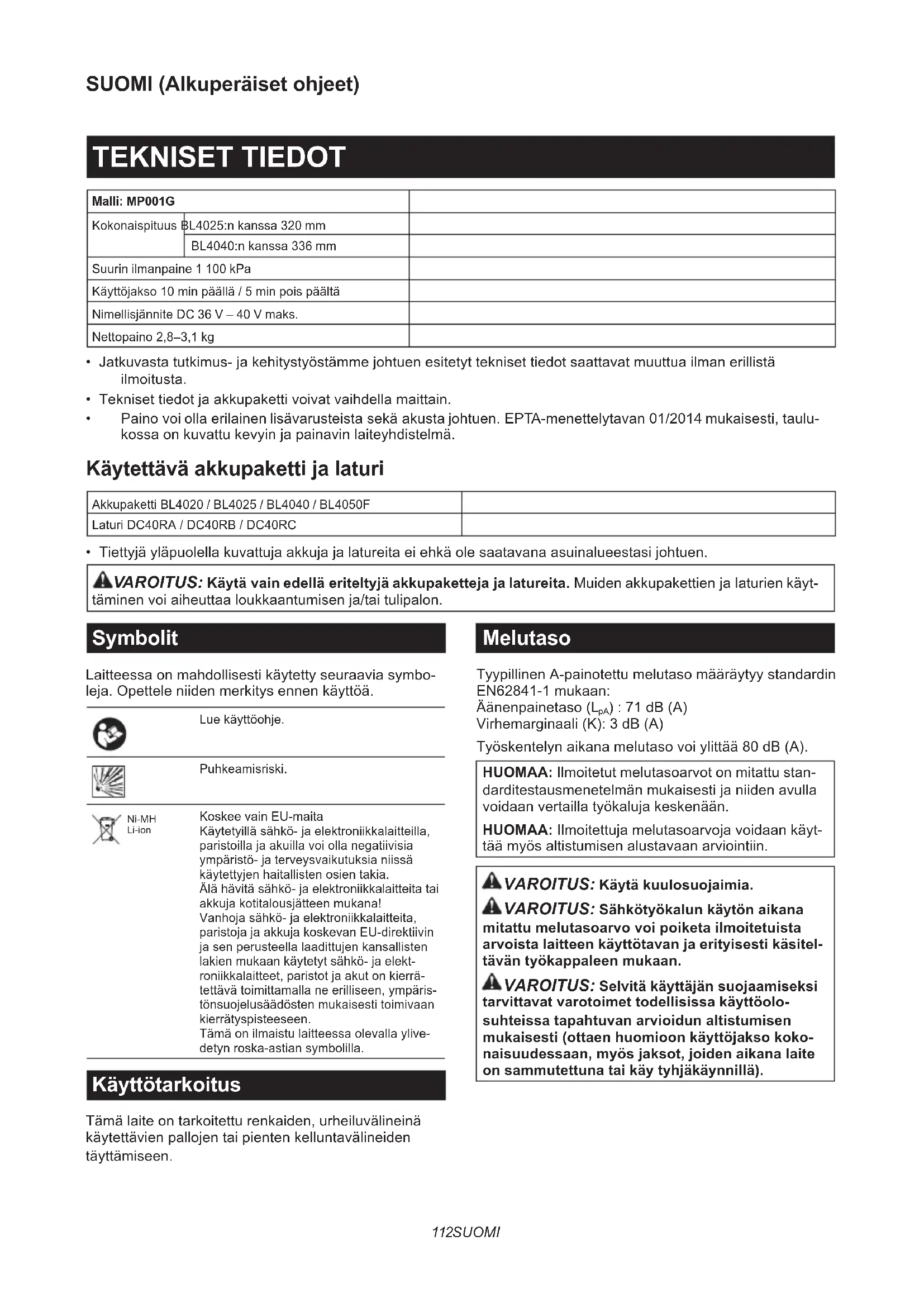 - Makita originalbatteri og lader MERK: Enkelte elementer i listen kan være inkludert som standardtilbehør i verktøypakken. Elementene kan variere fra land til land.112 SUOMI SUOMI (Alkuperäiset ohjeet) TEKNISET TIEDOT Malli: MP001G Kokonaispituus BL4025:n kanssa 320 mm BL4040:n kanssa 336 mm Suurin ilmanpaine 1 100 kPa Käyttöjakso 10 min päällä / 5 min pois päältä Nimellisjännite DC 36 V – 40 V maks. Nettopaino 2,8–3,1 kg