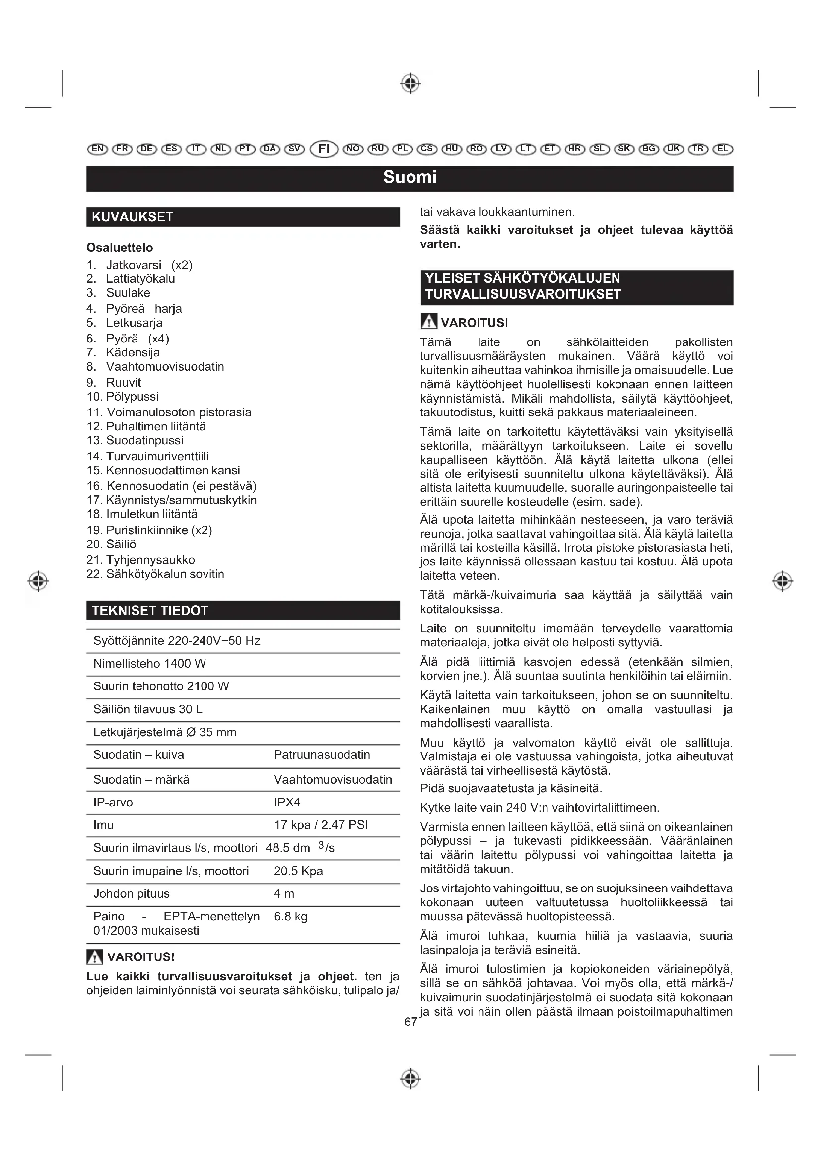 TEKNISET TIEDOT Syöttöjännite 220-240V~50 Hz Nimellisteho 1400 W Suurin tehonotto 2100 W Säiliön tilavuus 30 L Letkujärjestelmä Ø 35 mm Suodatin – kuiva Patruunasuodatin Suodatin – märkä Vaahtomuovisuodatin IP-arvo IPX4 Imu 17 kpa / 2.47 PSI Suurin ilmavirtaus l/s, moottori 48.5 dm
