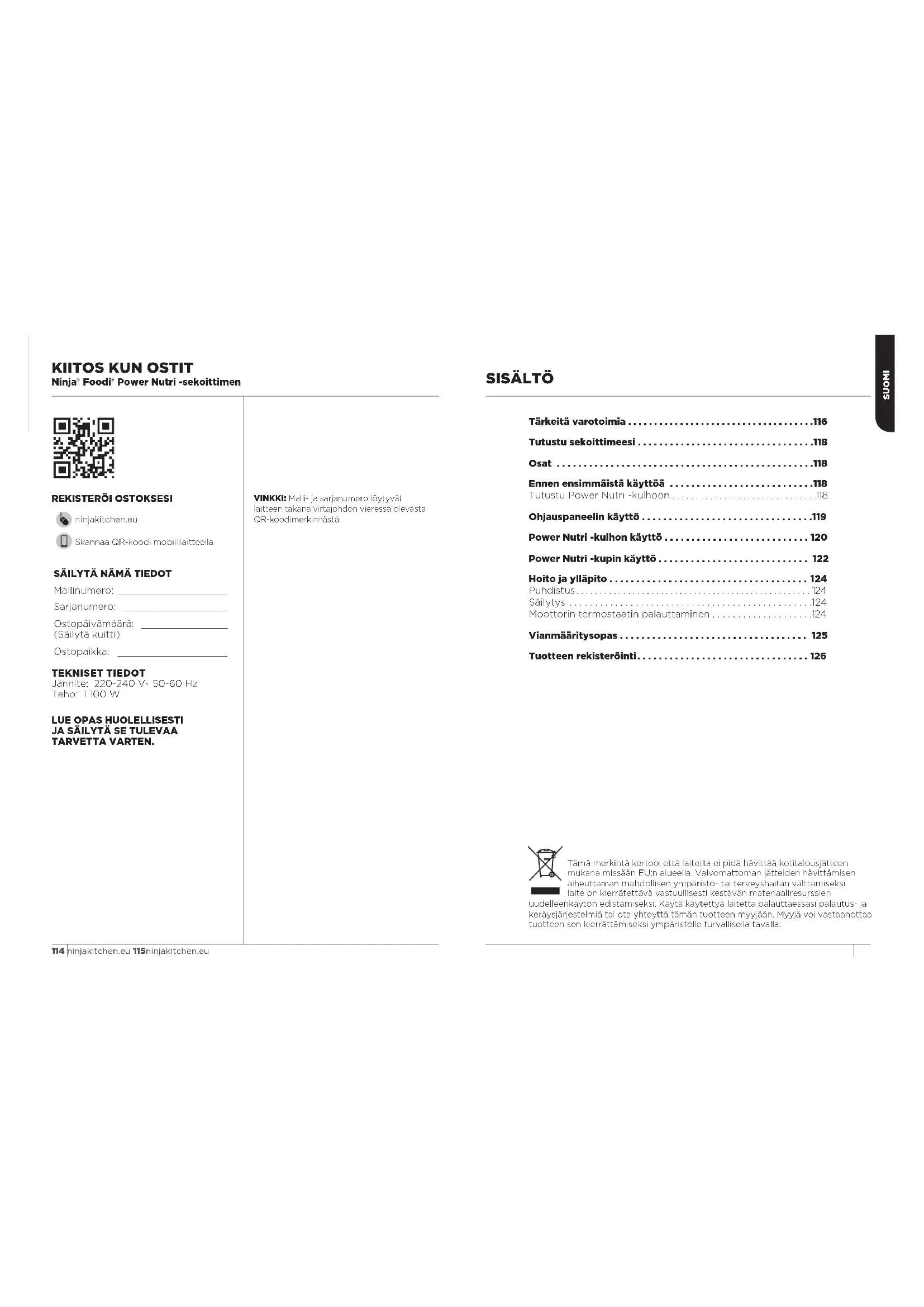 - Tuotteen ostopäivämäärä (kuitista tai lähetysilmoituksesta) Rekisteröi verkossa osoitteessa www.ninjakitchen.eu TÄRKEÄÄ