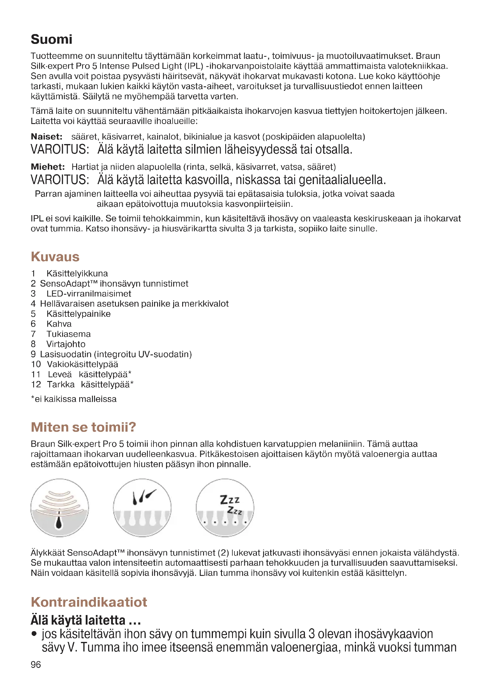 Lapsia tulisi valvoa ja varmistaa, että he eivät leiki laitteella. Säilytä laite aina lasten ulottumattomissa. Sähkö - ja Paloturvallisuus Tarkista säännöllisesti, ettei laitteessa ja johdoissa ole näkyviä vahingoittumisen merkkejä. Mikäli laitteessa näkyy vaurioita tai murtumia, lopeta laitteen käyttö. Vaurioituneen laitteen käyttö voi aiheuttaa sähköiskun. Mikäli ilmenee vikoja, tarkis- tuta ja korjauta laite valtuutetussa huoltokeskuksessa. Valtuuttamaton huoltotyö voi aiheuttaa vakavia vaaratilanteita käyttäjälle. Irrota laitteen virtajohto pistorasiasta aina käytön jälkeen. VAARA Älä yritä korjata tai avata laitetta, sillä voit joutua alttiiksi vaarallisille sähkökom- ponenteille tai valoimpulssille, jotka voivat aiheuttaa vakavan loukkaantumisen tai pysyvän silmävamman. Älä käytä veden lähellä tai märillä pinnoilla, kuten kylpyammeessa, suihkussa, altaassa tai muissa vettä sisältävissä paikoissa. Älä käytä laitetta, jos se kastuu. Märän laitteen käyttö voi aiheuttaa sähköiskun. Älä käytä, jos laite on vaurioitunut (esim. rikkoutunut kotelo, vaurioitunut johto jne.). Sisäiset osat sisältävät vaarallisia sähkölatauksia. Tarkista käsittelyikkuna (1) säännöllisesti vaurioiden varalta: Älä käytä, jos lasisuodatin (9) on rikkoutunut tai se puuttuu. 91590833_Victoria2_PL5_Euro1.indd 9891590833_Victoria2_PL5_Euro1.indd 98 30.10.20 13:4330.10.20 13:4399 Älä käytä, jos sisäänrakennettu heijastin puuttuu tai se ei ole oikeassa paikassa. Älä koske lasisuodattimeen käytön aikana tai heti sen jälkeen, koska suodatin kuumenee. Älä käytä öljypohjaisia tai syttyviä puhdistusaineita (alkoholi, asetonit), sillä ne voivat aiheuttaa tulipalon vaaran. Älä käytä hankaavia puhdistusaineita. Ne voivat vahingoittaa laitetta tai naarmuttaa lasisuodatinta. Älä yritä käyttää laitetta muuhun kuin ihokarvojen poistamiseen. Älä käytä laitetta millään muulla pinnalla kuin iholla. Älä paina käsittelypainiketta, jos käsittelyikkuna (1) ei ole asetettuna kokonaan ihoa vasten. Älä tuki ilmanvaihtoaukkoja. Laite saattaa ylikuumentua ja aiheuttaa sähköiskun tai tulipalon vaaran. Käyttö Käsiteltävän alueen valmistelu Poista näkyvät ihokarvat iholta ennen laitteen käyttämistä. Voit käyttää haluamaasi karvanpoistomenetelmää. Jotta käsittelyikkuna pysyisi puhtaana ja ehjänä, varmista, ettei ihon pinnalla ole enää karvoja. Puhdista käsiteltävä alue ja taputtele kuivaksi. Virran kytkeminen laitteeseen: Liitä tukiasema pistorasiaan virtajohdon (8) avulla. Aktivoi laite painamalla mitä tahansa painiketta (4 tai 5). LED-virtapalkit (3) valaistuvat kerran, ja puhallin käy. Tämä tarkoittaa, että laite on VALMIUStilassa. Käytön aikana laite kuumenee hiukan. Valon automaattinen mukauttaminen Kun molemmat ihonsävyn tunnistimet (2) koskettavat ihoa, laite lukee ihonsävysi ja valitsee sopivan valon intensiteetin. Sitä ilmaisevat virtapalkkien (3) valkoiset LED-valot. Ne vahvistavat, että laite on käyttövalmis. vaalea ihonsävy U korkea valon voimakkuus tumma ihonsävy U matala valon voimakkuus ja ei valoja ei ihokosketusta U Laitteen valo ei vilku. punainen valo ihonsävy virheellinen U Laitteen valo ei vilku. Hellävarainen tila Vähennä valon voimakkuutta painamalla hellävaraisen asetuksen painiketta (4). Voit valita seuraavista kolmesta asetuksesta: Normaali: 3 merkkivaloa Hellävarainen: 2 merkkivaloa Erityisen hellävarainen: 1 merkkivalo (matalin valon voimakkuus ja nopea vilkkuminen) Asetukset «Hellävarainen» ja «Erityisen hellävarainen» on tarkoitettu herkille ihoalueille ja henkilöille, jotka käyttävät laitetta ensimmäistä kertaa. Käyttäessäsi laitetta vähäisemmällä valonvoimakkuudella saatat tarvita useamman käsittelykerran toivotun tuloksen saavuttamiseksi. Tehonilmaisinpalkit vilkkuvat merkiksi valonvoimakkuusasetuksen muutoksesta. Kun hellävaraisen asetuksen painiketta (4) pidetään pohjassa yli kolmen sekunnin ajan, laite kytkeytyy pois päältä. 91590833_Victoria2_PL5_Euro1.indd 9991590833_Victoria2_PL5_Euro1.indd 99 30.10.20 13:4330.10.20 13:43100 Jos laitetta ei käytetä 10 minuuttiin, se kytkeytyy automaattisesti pois päältä. Aktivoi se uudelleen painamalla mitä tahansa painiketta. Kokeilu pienellä alueella Ennen ensimmäistä käsittelykertaa on suositeltavaa kokeilla Braun Silk·expert -laitetta pienellä alueella siihen kehon osaan, jota aiot käsitellä (kooltaan noin 2 x 3 cm, vastaa kahta vierekkäin tehtyä käsittelyä). Suorita aluetesti luvussa «Käsittelytavat» osiossa Tarkkuustila kuvatulla tavalla «TARKKUUSKÄSITTELY». Tarkista testialue 48 tunnin kuluttua. Jos iho vaikuttaa normaalilta, aloita ensimmäinen käsittely. Jos ilmenee ihoreaktioita, lopeta laitteen käyttö ja ota yhteyttä lääkäriin. Älä käsittele testialuetta uudelleen vähintään viikkoon testin jälkeen. Käsittelytavat Käsiteltävän alueen on oltava karvaton, puhdas ja kuiva. Ennen kuin painat käsittelypainiketta, katso poispäin laitteesta, jotta vältät kirkkaan valon. Harvinaisissa tapauksissa käyttäjä saattaa kokea, että välähdykset ovat liian kirkkaita. Se ei kuitenkaan ole haitallista silmille. Valo ei tunnu yhtä kirkkaalta, jos käsittely suoritetaan hyvin valaistussa tilassa. LIUKUMINEN suurten alueiden (esim. säärten) nopeaan ja tehokkaaseen käsittelyyn TARKKUUSKÄSITTELY pienten, vaikeasti saavutettavien alueiden käsittelyyn (esim. naisten kasvot, bikinirajat, kainalot, polvet, leuka, nilkat)