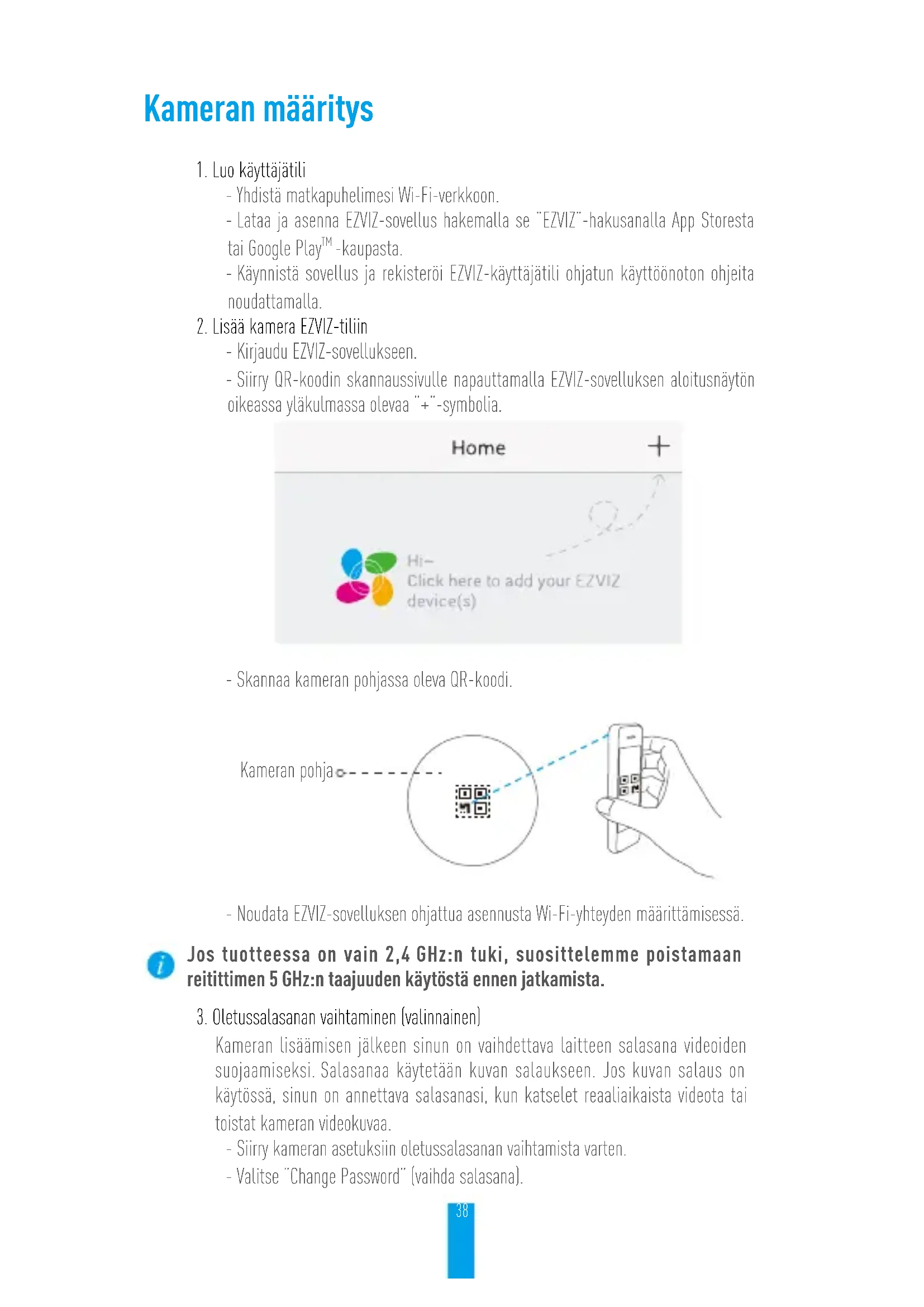 - Kirjaudu EZVIZ-sovellukseen. - Siirry QR-koodin skannaussivulle napauttamalla EZVIZ-sovelluksen aloitusnäytön oikeassa yläkulmassa olevaa ”+”-symbolia. - Skannaa kameran pohjassa oleva QR-koodi. Kameran pohja - Noudata EZVIZ-sovelluksen ohjattua asennusta Wi-Fi-yhteyden määrittämisessä.