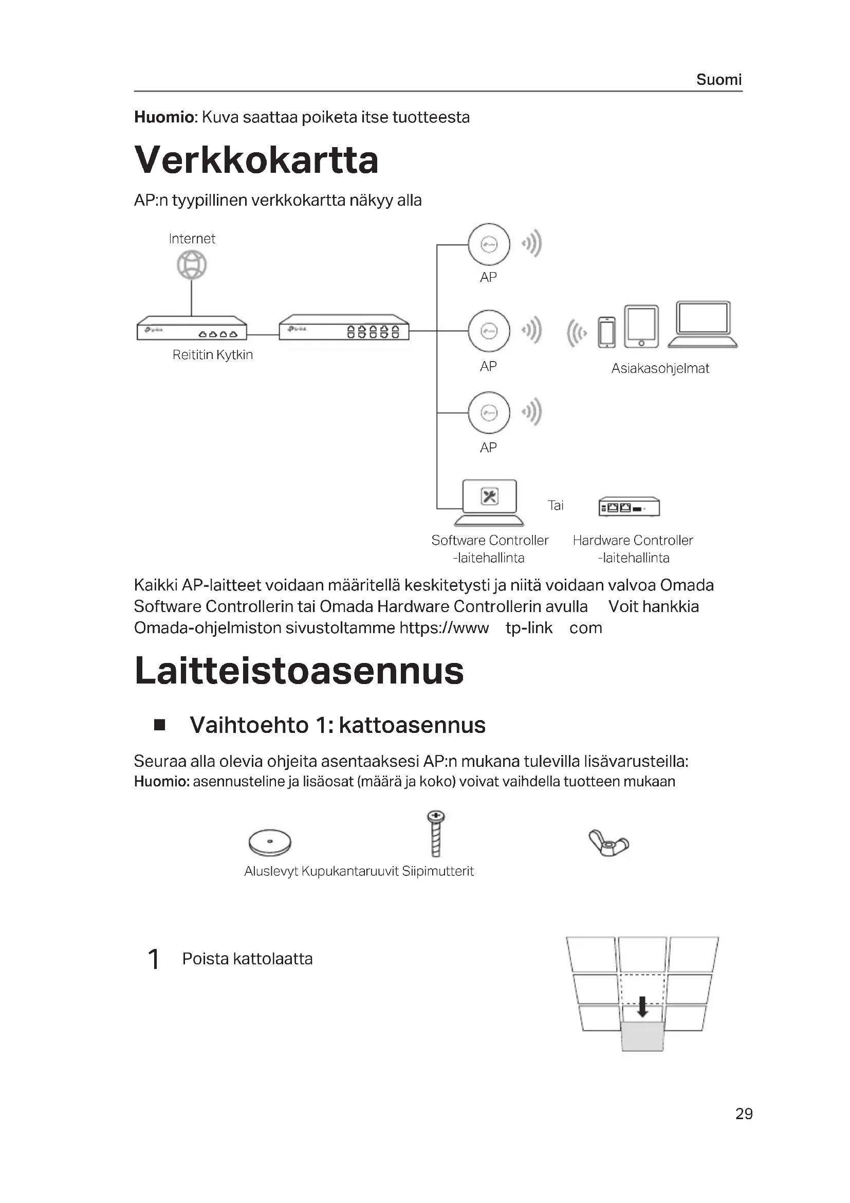 PoE LAN PoE AdapterSwitch29 Suomi Huomio: Kuva saattaa poiketa itse tuotteesta Verkkokartta AP:n tyypillinen verkkokartta näkyy alla Kaikki AP-laitteet voidaan määritellä keskitetysti ja niitä voidaan valvoa Omada Software Controllerin tai Omada Hardware Controllerin avulla Voit hankkia Omada-ohjelmiston sivustoltamme https://wwwtp-linkcom Laitteistoasennus ■ Vaihtoehto 1: kattoasennus Seuraa alla olevia ohjeita asentaaksesi AP:n mukana tulevilla lisävarusteilla: Huomio: asennusteline ja lisäosat (määrä ja koko) voivat vaihdella tuotteen mukaanAluslevyt Kupukantaruuvit Siipimutterit