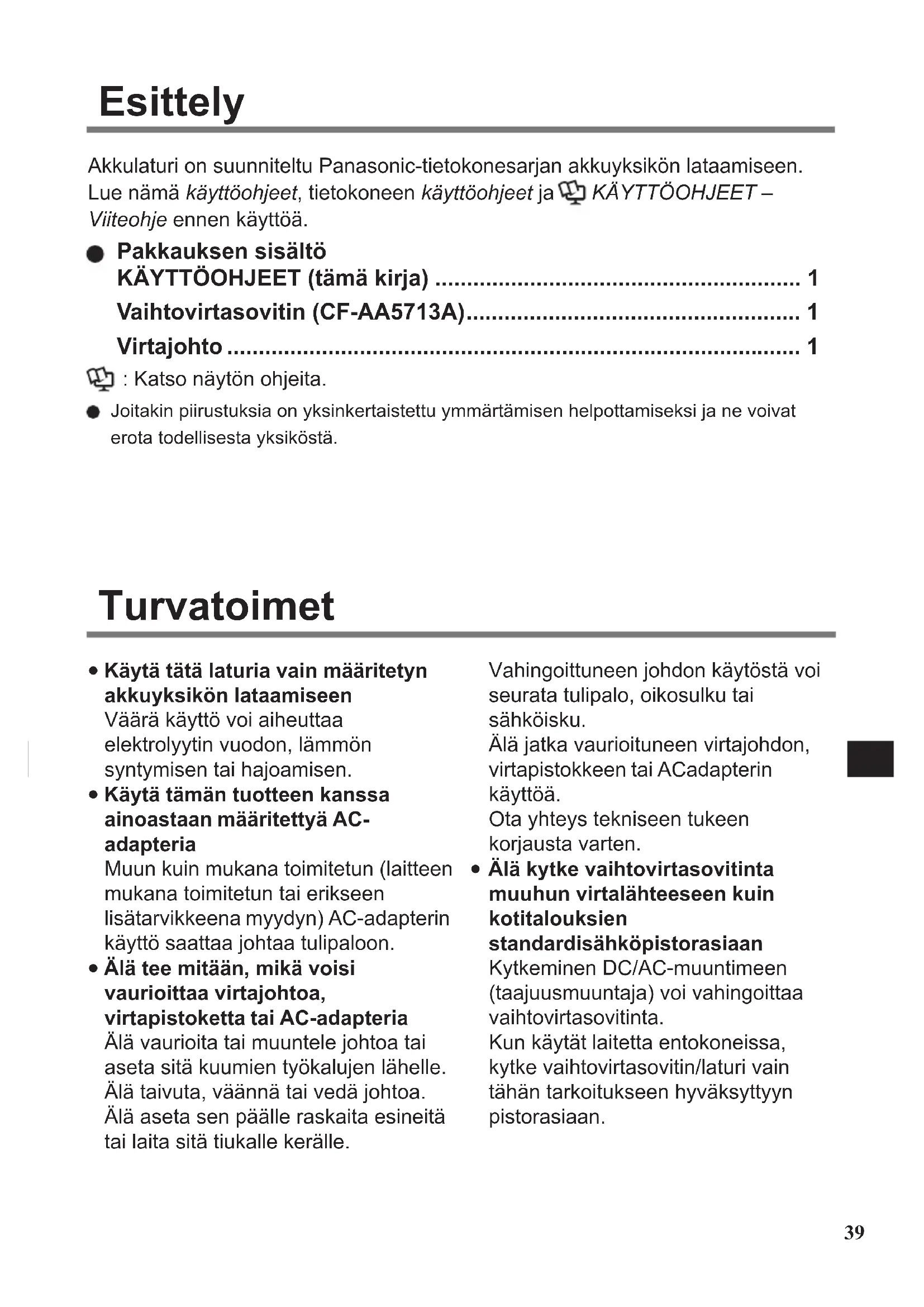 Älä kytke vaihtovirtasovitinta muuhun virtalähteeseen kuin kotitalouksien standardisähköpistorasiaan Kytkeminen DC/AC-muuntimeen (taajuusmuuntaja) voi vahingoittaa vaihtovirtasovitinta. Kun käytät laitetta entokoneissa, kytke vaihtovirtasovitin/laturi vain tähän tarkoitukseen hyväksyttyyn pistorasiaan. Akkulaturi on suunniteltu Panasonic-tietokonesarjan akkuyksikön lataamiseen. Lue nämä käyttöohjeet, tietokoneen käyttöohjeet ja