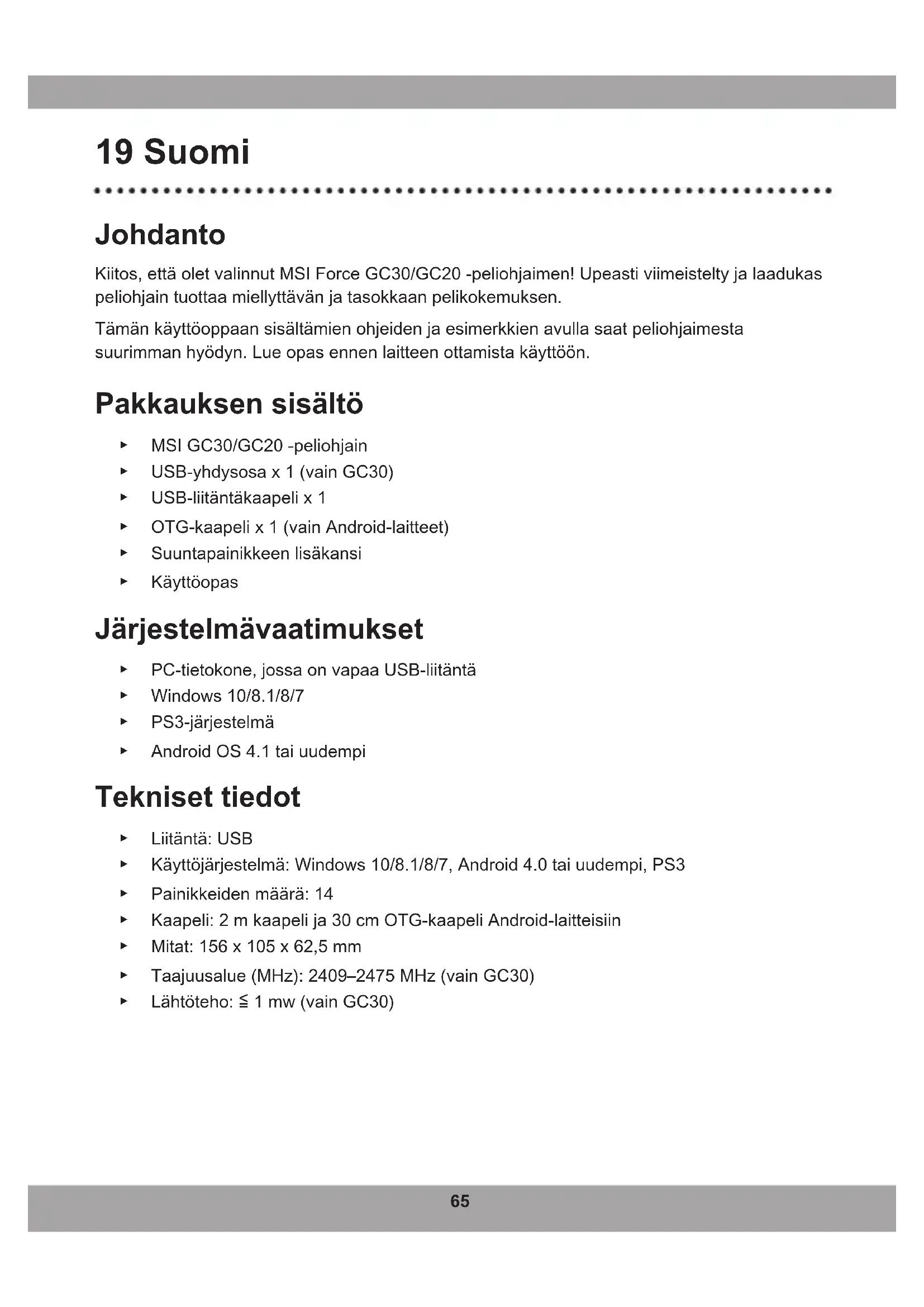 - Den 3. og 4. tilstands-lysdiodeindikator lyser, når denne tilstand er valgt.65 19 Suomi Johdanto Kiitos, että olet valinnut MSI Force GC30/GC20 -peliohjaimen! Upeasti viimeistelty ja laadukas peliohjain tuottaa miellyttävän ja tasokkaan pelikokemuksen. Tämänkäyttöoppaansisältämienohjeidenjaesimerkkienavullasaatpeliohjaimesta suurimmanhyödyn.Lueopasennenlaitteenottamistakäyttöön. Pakkauksen sisältö ▶ MSI GC30/GC20 -peliohjain ▶ USB-yhdysosa x 1 (vain GC30) ▶ USB-liitäntäkaapeli x 1 ▶ OTG-kaapeli x 1 (vain Android-laitteet) ▶ Suuntapainikkeen lisäkansi ▶ Käyttöopas Järjestelmävaatimukset ▶ PC-tietokone, jossa on vapaa USB-liitäntä ▶ Windows 10/8.1/8/7 ▶ PS3-järjestelmä ▶ Android OS 4.1 tai uudempi Tekniset tiedot ▶ Liitäntä: USB ▶ Käyttöjärjestelmä:Windows10/8.1/8/7,Android4.0taiuudempi,PS3 ▶ Painikkeiden määrä: 14 ▶ Kaapeli: 2 m kaapeli ja 30 cm OTG-kaapeli Android-laitteisiin ▶ Mitat: 156 x 105 x 62,5 mm ▶ Taajuusalue (MHz): 2409–2475 MHz (vain GC30) ▶ Lähtöteho:≦1mw(vainGC30)66 Yleistä
