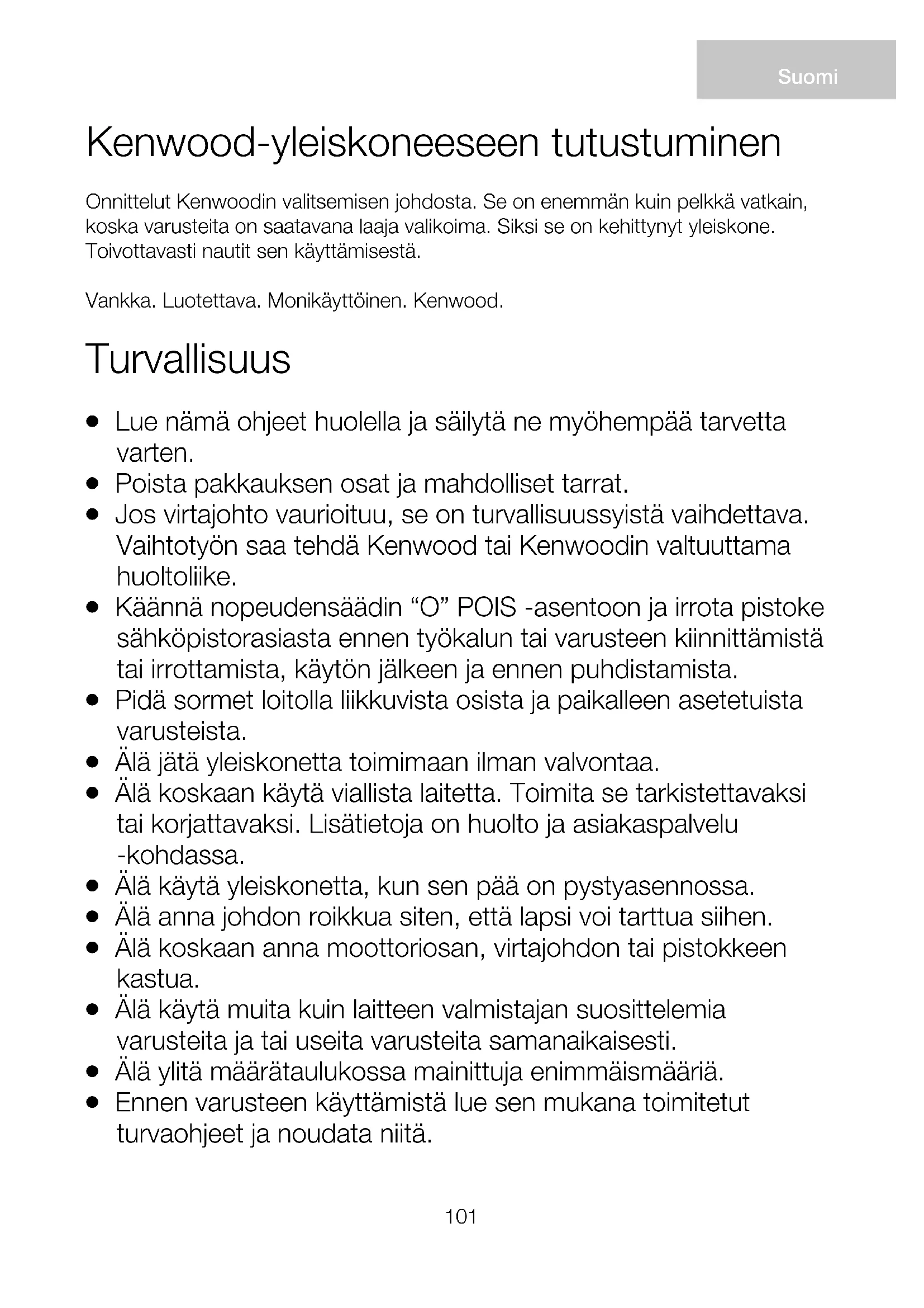 (WEEE) Tuotetta ei saa hävittää yhdessä tavallisten kotitalousjätteiden kanssa sen lopullisen käytöstä poiston yhteydessä. Vie se paikallisten viranomaisten hyväksymään kierrätyskeskukseen tai anna se jälleenmyyjän hävitettäväksi, mikäli kyseinen palvelu kuuluu jälleenmyyjän toimialaan. Suojelet luontoa ja vältyt virheellisen tai väärän romutuksen aiheuttamilta terveysriskeiltä, mikäli hävität kodinkoneen erillään muista jätteistä. Näin myös kodinkoneen sisältämät kierrätettävät materiaalit voidaan kerätä talteen, jolloin säästät energiaa ja luonnonvaroja. Tuotteessa on ristillä peitetty roskasäiliön merkki, jonka tarkoituksena on muistuttaa että kodinkoneet on hävitettävä erikseen muista kotitalousjätteistä.111 Kenwood Mutfak Robotunuzu Tanıyın Bir Kenwood satın aldığınız için tebrik ederiz. Sahip olduğu çok çeşitli eklentiler ile sadece bir mikserden çok daha fazlasıdır. En son teknoloji Mutfak Robotudur. Umarız keyif alırsınız. Sağlam. Güvenilir, Çok yönlü, Kenwood. Güvenlik