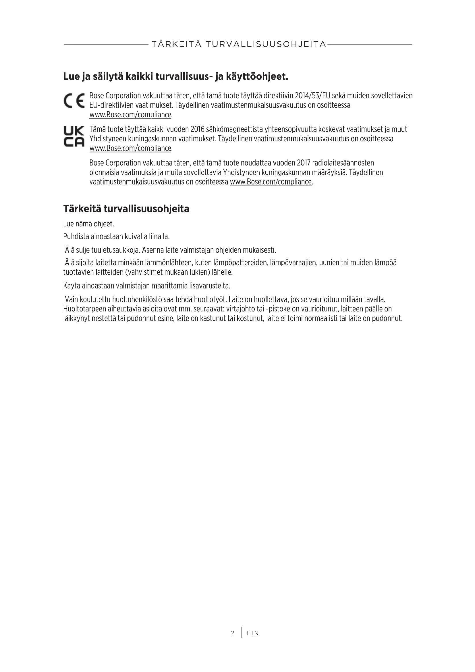 FIN Lue ja säilytä kaikki turvallisuus- ja käyttöohjeet. Bose Corporation vakuuttaa täten, että tämä tuote täyttää direktiivin 2014/53/EU sekä muiden sovellettavien EU-direktiivien vaatimukset. Täydellinen vaatimustenmukaisuusvakuutus on osoitteessa www.Bose.com/compliancewww.Bose.com/compliance.. Tämä tuote täyttää kaikki vuoden2016 sähkömagneettista yhteensopivuutta koskevat vaatimukset ja muut Yhdistyneen kuningaskunnan vaatimukset. Täydellinen vaatimustenmukaisuusvakuutus on osoitteessa www.Bose.com/compliancewww.Bose.com/compliance.. Bose Corporation vakuuttaa täten, että tämä tuote noudattaa vuoden2017 radiolaitesäännösten olennaisia vaatimuksia ja muita sovellettavia Yhdistyneen kuningaskunnan määräyksiä. Täydellinen vaatimustenmukaisuusvakuutus on osoitteessa www.Bose.com/compliancewww.Bose.com/compliance.. Tärkeitä turvallisuusohjeita Lue nämä ohjeet. Puhdista ainoastaan kuivalla liinalla. Älä sulje tuuletusaukkoja. Asenna laite valmistajan ohjeiden mukaisesti. Älä sijoita laitetta minkään lämmönlähteen, kuten lämpöpattereiden, lämpövaraajien, uunien tai muiden lämpöä tuottavien laitteiden (vahvistimet mukaan lukien) lähelle. Käytä ainoastaan valmistajan määrittämiä lisävarusteita. Vain koulutettu huoltohenkilöstö saa tehdä huoltotyöt. Laite on huollettava, jos se vaurioituu millään tavalla. Huoltotarpeen aiheuttavia asioita ovat mm. seuraavat: virtajohto tai -pistoke on vaurioitunut, laitteen päälle on läikkynyt nestettä tai pudonnut esine, laite on kastunut tai kostunut, laite ei toimi normaalisti tai laite on pudonnut.TÄRKEITÄ TURVALLISUUSOHJEITA
