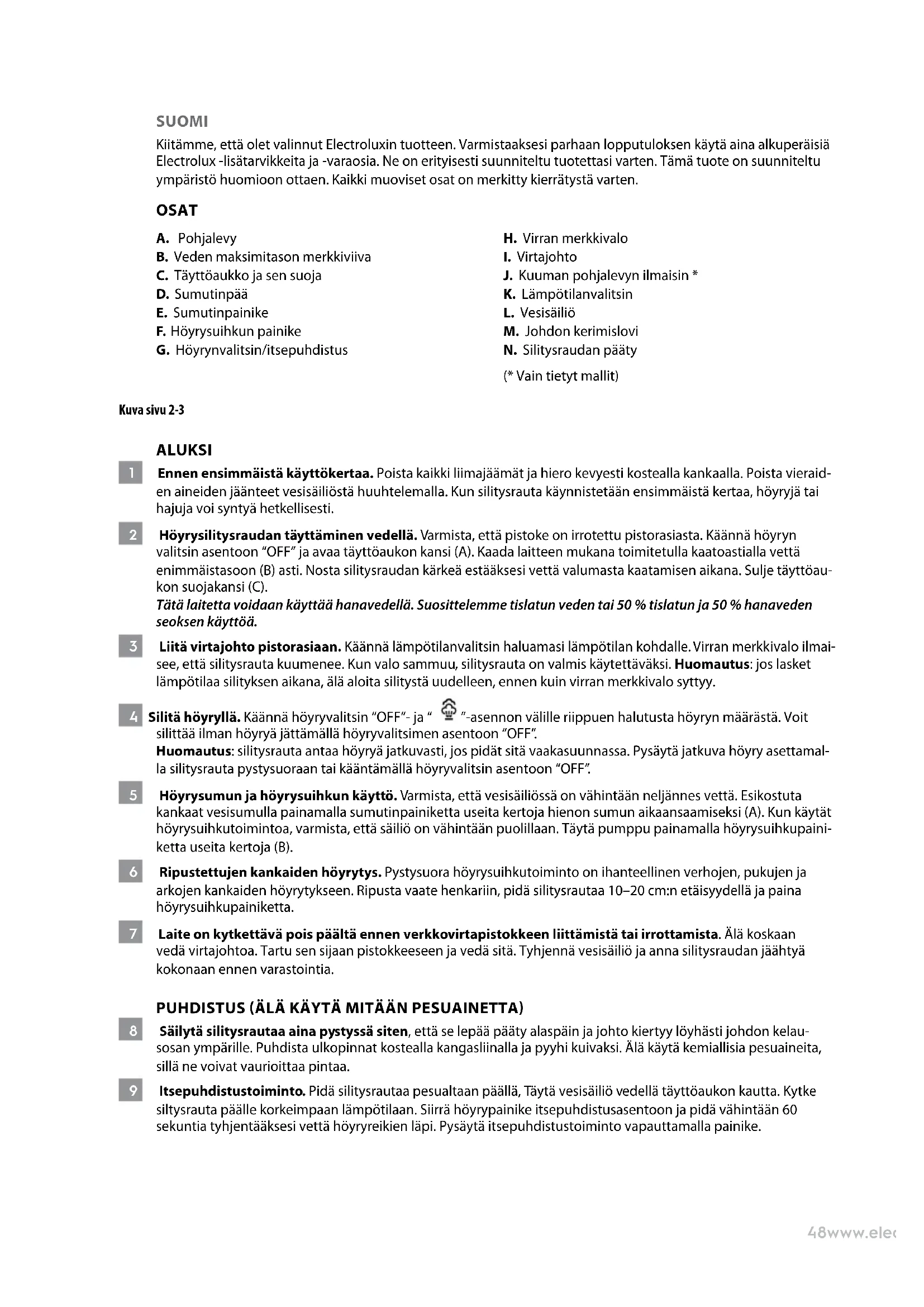 J. Kuuman pohjalevyn ilmaisin * K. Lämpötilanvalitsin L. Vesisäiliö M. Johdon kerimislovi N. Silitysraudan pääty (* Vain tietyt mallit) Kuva sivu 2-3 ALUKSI 1 Ennen ensimmäistä käyttökertaa. Poista kaikki liimajäämät ja hiero kevyesti kostealla kankaalla. Poista vieraid- en aineiden jäänteet vesisäiliöstä huuhtelemalla. Kun silitysrauta käynnistetään ensimmäistä kertaa, höyryjä tai hajuja voi syntyä hetkellisesti. 2 Höyrysilitysraudan täyttäminen vedellä. Varmista, että pistoke on irrotettu pistorasiasta. Käännä höyryn valitsin asentoon “OFF” ja avaa täyttöaukon kansi (A). Kaada laitteen mukana toimitetulla kaatoastialla vettä enimmäistasoon (B) asti. Nosta silitysraudan kärkeä estääksesi vettä valumasta kaatamisen aikana. Sulje täyttöau- konsuojakansi (C). Tätä laitetta voidaan käyttää hanavedellä. Suosittelemme tislatun veden tai 50 % tislatun ja 50 % hanaveden seoksen käyttöä. 3 Liitä virtajohto pistorasiaan. Käännä lämpötilanvalitsin haluamasi lämpötilan kohdalle. Virran merkkivalo ilmai- see, että silitysrauta kuumenee. Kun valo sammuu, silitysrauta on valmis käytettäväksi. Huomautus: jos lasket lämpötilaa silityksen aikana, älä aloita silitystä uudelleen, ennen kuin virran merkkivalo syttyy. 4 Silitä höyryllä. Käännä höyryvalitsin “OFF”- ja “ ”-asennon välille riippuen halutusta höyryn määrästä. Voit silittää ilman höyryä jättämällä höyryvalitsimen asentoon “OFF”. Huomautus: silitysrauta antaa höyryä jatkuvasti, jos pidät sitä vaakasuunnassa. Pysäytä jatkuva höyry asettamal- la silitysrauta pystysuoraan tai kääntämällä höyryvalitsin asentoon “OFF”. 5 Höyrysumun ja höyrysuihkun käyttö. Varmista, että vesisäiliössä on vähintään neljännes vettä. Esikostuta kankaat vesisumulla painamalla sumutinpainiketta useita kertoja hienon sumun aikaansaamiseksi (A). Kun käytät höyrysuihkutoimintoa, varmista, että säiliö on vähintään puolillaan. Täytä pumppu painamalla höyrysuihkupaini- ketta useita kertoja (B). 6 Ripustettujen kankaiden höyrytys. Pystysuora höyrysuihkutoiminto on ihanteellinen verhojen, pukujen ja arkojen kankaiden höyrytykseen. Ripusta vaate henkariin, pidä silitysrautaa 10–20 cm:n etäisyydellä ja paina höyrysuihkupainiketta. 7 Laite on kytkettävä pois päältä ennen verkkovirtapistokkeen liittämistä tai irrottamista. Älä koskaan vedä virtajohtoa. Tartu sen sijaan pistokkeeseen ja vedä sitä. Tyhjennä vesisäiliö ja anna silitysraudan jäähtyä kokonaan ennen varastointia. PUHDISTUS (ÄLÄ KÄYTÄ MITÄÄN PESUAINETTA) 8 Säilytä silitysrautaa aina pystyssäsiten, että se lepää pääty alaspäin ja johto kiertyy löyhästi johdon kelau- sosan ympärille. Puhdista ulkopinnat kostealla kangasliinalla ja pyyhi kuivaksi. Älä käytä kemiallisia pesuaineita, sillä ne voivat vaurioittaa pintaa. 9 Itsepuhdistustoiminto. Pidä silitysrautaa pesualtaan päällä, Täytä vesisäiliö vedellä täyttöaukon kautta. Kytke siltysrauta päälle korkeimpaan lämpötilaan. Siirrä höyrypainike itsepuhdistusasentoon ja pidä vähintään 60 sekuntia tyhjentääksesi vettä höyryreikien läpi. Pysäytä itsepuhdistustoiminto vapauttamalla painike.49www.electrolux.com