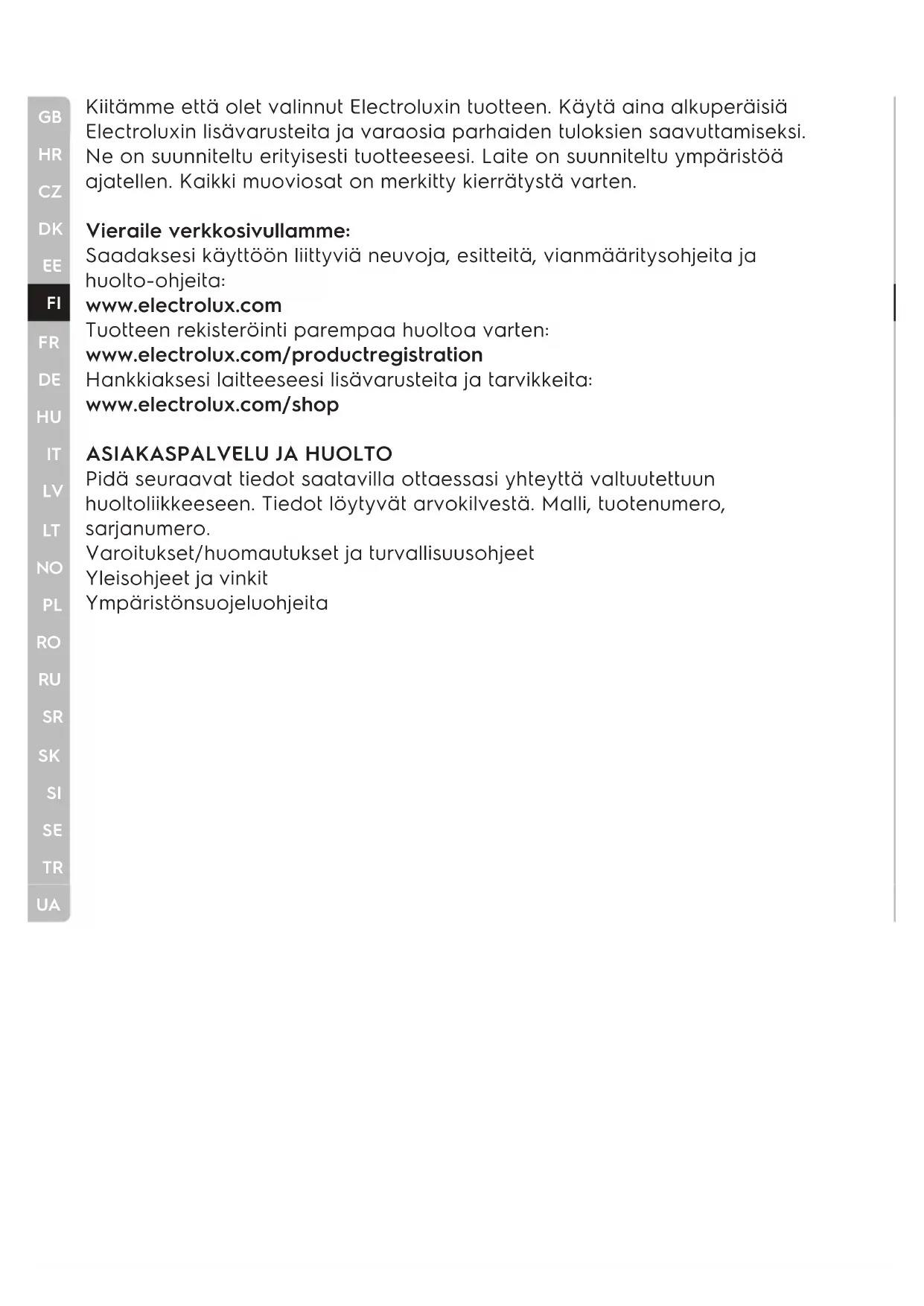 Kiitämme että olet valinnut Electroluxin tuotteen. Käytä aina alkuperäisiä Electroluxin lisävarusteita ja varaosia parhaiden tuloksien saavuttamiseksi. Ne on suunniteltu erityisesti tuotteeseesi. Laite on suunniteltu ympäristöä ajatellen. Kaikki muoviosat on merkitty kierrätystä varten. Vieraile verkkosivullamme: Saadaksesi käyttöön liittyviä neuvoja, esitteitä, vianmääritysohjeita ja huolto-ohjeita: www.electrolux.com Tuotteen rekisteröinti parempaa huoltoa varten: www.electrolux.com/productregistration Hankkiaksesi laitteeseesi lisävarusteita ja tarvikkeita: www.electrolux.com/shop