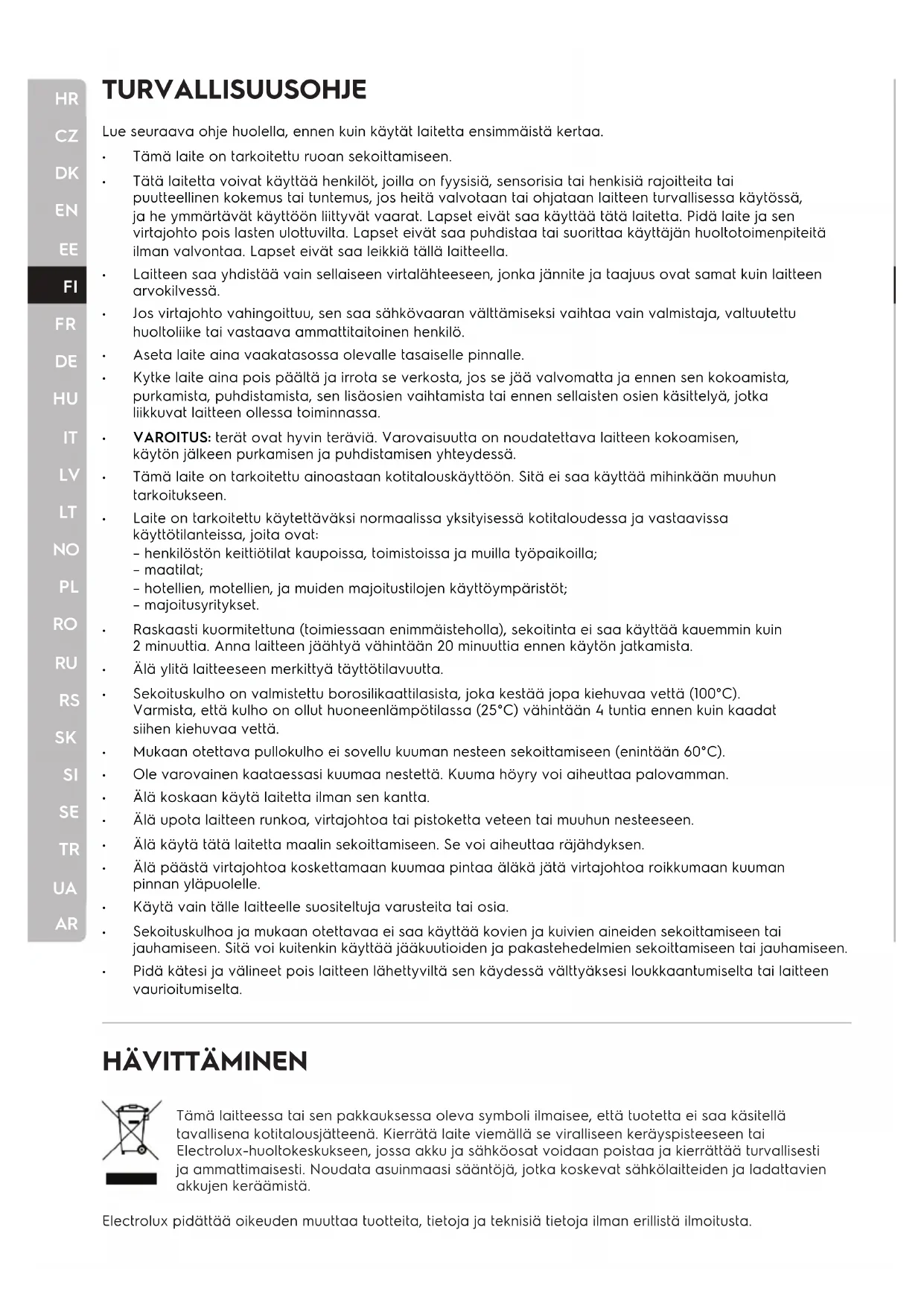 Tämä laitteessa tai sen pakkauksessa oleva symboli ilmaisee, että tuotetta ei saa käsitellä tavallisena kotitalousjätteenä. Kierrätä laite viemällä se viralliseen keräyspisteeseen tai Electrolux-huoltokeskukseen, jossa akku ja sähköosat voidaan poistaa ja kierrättää turvallisesti ja ammattimaisesti. Noudata asuinmaasi sääntöjä, jotka koskevat sähkölaitteiden ja ladattavien akkujen keräämistä. Electrolux pidättää oikeuden muuttaa tuotteita, tietoja ja teknisiä tietoja ilman erillistä ilmoitusta. Lue seuraava ohje huolella, ennen kuin käytät laitetta ensimmäistä kertaa.