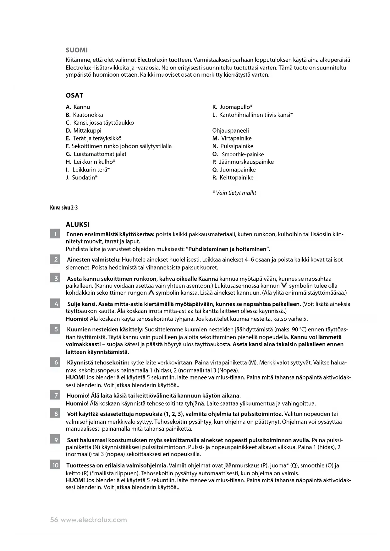 - Vain tietyt mallit Kuva sivu 2-3 ALUKSI 1 Ennen ensimmäistä käyttökertaa: poista kaikki pakkausmateriaali, kuten runkoon, kulhoihin tai lisäosiin kiin- nitetyt muovit, tarrat ja laput. Puhdista laite ja varusteet ohjeiden mukaisesti: “Puhdistaminen ja hoitaminen”. 2 Ainesten valmistelu: Huuhtele ainekset huolellisesti. Leikkaa ainekset 4–6 osaan ja poista kaikki kovat tai isot siemenet. Poista hedelmistä tai vihanneksista paksut kuoret. 3 Aseta kannu sekoittimen runkoon, kahva oikealle Käännä kannua myötäpäivään, kunnes se napsahtaa paikalleen. (Kannu voidaan asettaa vain yhteen asentoon.) Lukitusasennossa kannun -symbolin tulee olla kohdakkain sekoittimen rungon -symbolin kanssa. Lisää ainekset kannuun. (Älä ylitä enimmäistäyttömäärää.) 4 Sulje kansi. Aseta mitta-astia kiertämällä myötäpäivään, kunnes se napsahtaa paikalleen. (Voit lisätä aineksia täyttöaukon kautta. Älä koskaan irrota mitta-astiaa tai kantta laitteen ollessakäynnissä.) Huomio! Älä koskaan käytä tehosekoitinta tyhjänä. Jos käsittelet kuumia nesteitä, katso vaihe 5. 5 Kuumien nesteiden käsittely: Suosittelemme kuumien nesteiden jäähdyttämistä (maks. 90 °C) ennen täyttöas- tian täyttämistä. Täytä kannu vain puolilleen ja aloita sekoittaminen pienellä nopeudella. Kannu voi lämmetä voimakkaasti – suojaa kätesi ja päästä höyryä ulos täyttöaukosta. Aseta kansi aina takaisin paikalleen ennen laitteen käynnistämistä. 6 Käynnistä tehosekoitin: kytke laite verkkovirtaan. Paina virtapainiketta (M). Merkkivalot syttyvät. Valitse halua- masi sekoitusnopeus painamalla 1 (hidas), 2 (normaali) tai 3 (Nopea). HUOM! Jos blenderiä ei käytetä 5 sekuntiin, laite menee valmius-tilaan. Paina mitä tahansa näppäintä aktivoidak- sesi blenderin. Voit jatkaa blenderin käyttöä.. 7 Huomio! Älä laita käsiä tai keittiövälineitä kannuun käytön aikana. Huomio! Älä koskaan käynnistä tehosekoitinta tyhjänä. Laite saattaa ylikuumentua ja vahingoittua. 8 Voit käyttää esiasetettuja nopeuksia (1, 2, 3), valmiita ohjelmia tai pulssitoimintoa. Valitun nopeuden tai valmisohjelman merkkivalo syttyy. Tehosekoitin pysähtyy, kun ohjelma on päättynyt. Ohjelman voi pysäyttää manuaalisesti painamalla mitä tahansa painiketta. 9 Saat haluamasi koostumuksenmyös sekoittamalla ainekset nopeasti pulssitoiminnon avulla. Paina pulssi- painiketta (N)käynnistääksesi pulssitoimintoon. Pulssi- ja nopeuspainikkeet alkavat vilkkua. Paina 1 (hidas), 2 (normaali) tai 3 (nopea) sekoittaaksesi eri nopeuksilla. 10 Tuotteessa on erilaisia valmisohjelmia. Valmiit ohjelmat ovat jäänmurskaus (P), juoma* (Q), smoothie (O) ja keitto (R) (*mallista riippuen). Tehosekoitin pysähtyy automaattisesti, kun ohjelma on valmis. HUOM! Jos blenderiä ei käytetä 5 sekuntiin, laite menee valmius-tilaan. Paina mitä tahansa näppäintä aktivoidak- sesi blenderin. Voit jatkaa blenderin käyttöä..57www.electrolux.com