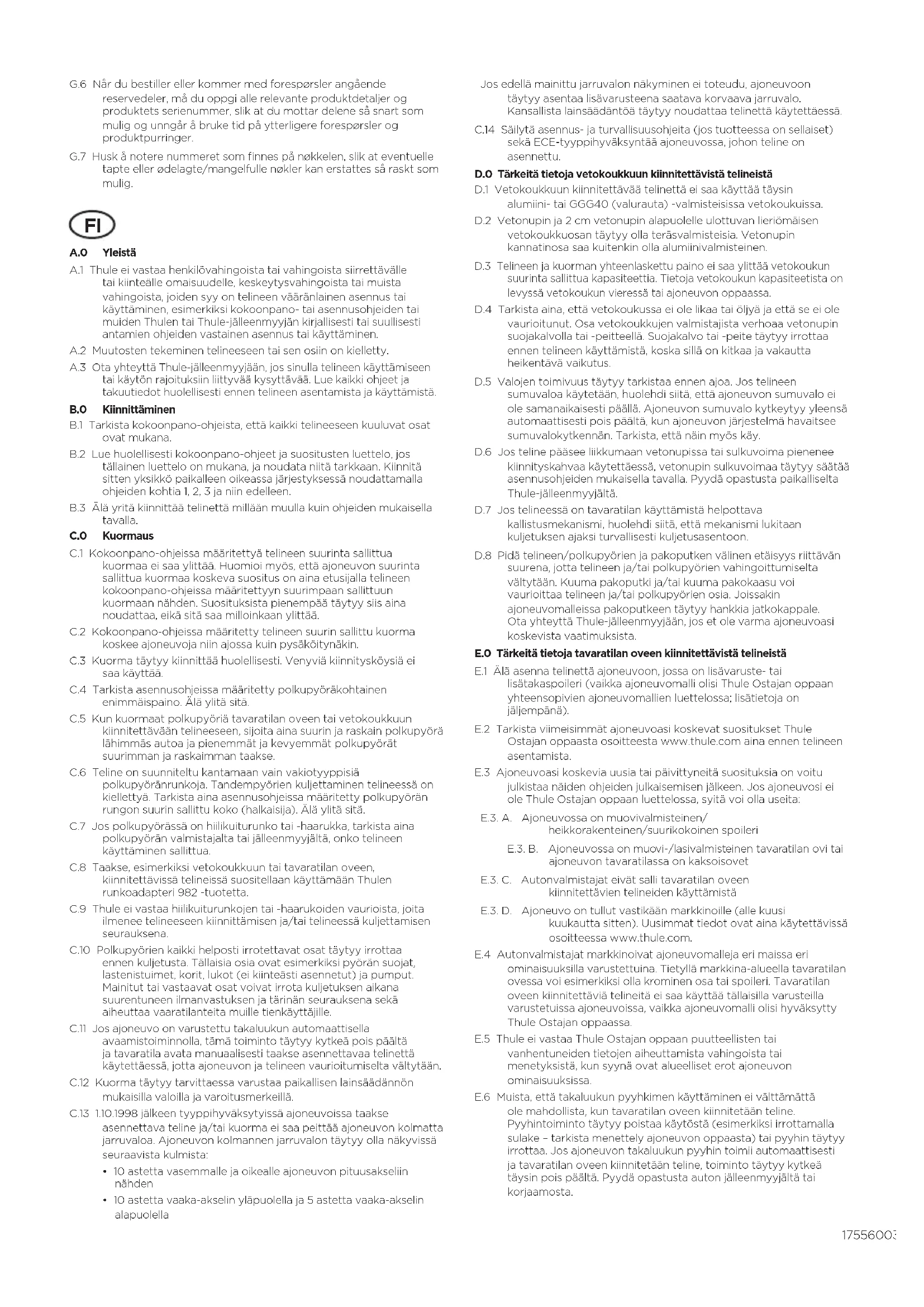 A.0 Yleistä A.1 Thule ei vastaa henkilövahingoista tai vahingoista siirrettävälle tai kiinteälle omaisuudelle, keskeytysvahingoista tai muista vahingoista, joiden syy on telineen vääränlainen asennus tai käyttäminen, esimerkiksi kokoonpano- tai asennusohjeiden tai muiden Thulen tai Thule-jälleenmyyjän kirjallisesti tai suullisesti antamien ohjeiden vastainen asennus tai käyttäminen. A.2 Muutosten tekeminen telineeseen tai sen osiin on kielletty. A.3 Ota yhteyttä Thule-jälleenmyyjään, jos sinulla telineen käyttämiseen tai käytön rajoituksiin liittyvää kysyttävää. Lue kaikki ohjeet ja takuutiedot huolellisesti ennen telineen asentamista ja käyttämistä. B.0 Kiinnittäminen B.1 Tarkista kokoonpano-ohjeista, että kaikki telineeseen kuuluvat osat ovat mukana. B.2 Lue huolellisesti kokoonpano-ohjeet ja suositusten luettelo, jos tällainen luettelo on mukana, ja noudata niitä tarkkaan. Kiinnitä sitten yksikkö paikalleen oikeassa järjestyksessä noudattamalla ohjeiden kohtia 1, 2, 3 ja niin edelleen. B.3 Älä yritä kiinnittää telinettä millään muulla kuin ohjeiden mukaisella tavalla. C.0 Kuormaus C.1 Kokoonpano-ohjeissa määritettyä telineen suurinta sallittua kuormaa ei saa ylittää. Huomioi myös, että ajoneuvon suurinta sallittua kuormaa koskeva suositus on aina etusijalla telineen kokoonpano-ohjeissa määritettyyn suurimpaan sallittuun kuormaan nähden. Suosituksista pienempää täytyy siis aina noudattaa, eikä sitä saa milloinkaan ylittää. C.2 Kokoonpano-ohjeissa määritetty telineen suurin sallittu kuorma koskee ajoneuvoja niin ajossa kuin pysäköitynäkin. C.3 Kuorma täytyy kiinnittää huolellisesti. Venyviä kiinnitysköysiä ei saa käyttää. C.4 Tarkista asennusohjeissa määritetty polkupyöräkohtainen enimmäispaino. Älä ylitä sitä. C.5 Kun kuormaat polkupyöriä tavaratilan oveen tai vetokoukkuun kiinnitettävään telineeseen, sijoita aina suurin ja raskain polkupyörä lähimmäs autoa ja pienemmät ja kevyemmät polkupyörät suurimman ja raskaimman taakse. C.6 Teline on suunniteltu kantamaan vain vakiotyyppisiä polkupyöränrunkoja. Tandempyörien kuljettaminen telineessä on kiellettyä. Tarkista aina asennusohjeissa määritetty polkupyörän rungon suurin sallittu koko (halkaisija). Älä ylitä sitä. C.7 Jos polkupyörässä on hiilikuiturunko tai -haarukka, tarkista aina polkupyörän valmistajalta tai jälleenmyyjältä, onko telineen käyttäminen sallittua. C.8 Taakse, esimerkiksi vetokoukkuun tai tavaratilan oveen, kiinnitettävissä telineissä suositellaan käyttämään Thulen runkoadapteri 982 -tuotetta. C.9 Thule ei vastaa hiilikuiturunkojen tai -haarukoiden vaurioista, joita ilmenee telineeseen kiinnittämisen ja/tai telineessä kuljettamisen seurauksena. C.10 Polkupyörien kaikki helposti irrotettavat osat täytyy irrottaa ennen kuljetusta. Tällaisia osia ovat esimerkiksi pyörän suojat, lastenistuimet, korit, lukot (ei kiinteästi asennetut) ja pumput. Mainitut tai vastaavat osat voivat irrota kuljetuksen aikana suurentuneen ilmanvastuksen ja tärinän seurauksena sekä aiheuttaa vaaratilanteita muille tienkäyttäjille. C.11 Jos ajoneuvo on varustettu takaluukun automaattisella avaamistoiminnolla, tämä toiminto täytyy kytkeä pois päältä ja tavaratila avata manuaalisesti taakse asennettavaa telinettä käytettäessä, jotta ajoneuvon ja telineen vaurioitumiselta vältytään. C.12 Kuorma täytyy tarvittaessa varustaa paikallisen lainsäädännön mukaisilla valoilla ja varoitusmerkeillä. C.13 1.10.1998 jälkeen tyyppihyväksytyissä ajoneuvoissa taakse asennettava teline ja/tai kuorma ei saa peittää ajoneuvon kolmatta jarruvaloa. Ajoneuvon kolmannen jarruvalon täytyy olla näkyvissä seuraavista kulmista:
