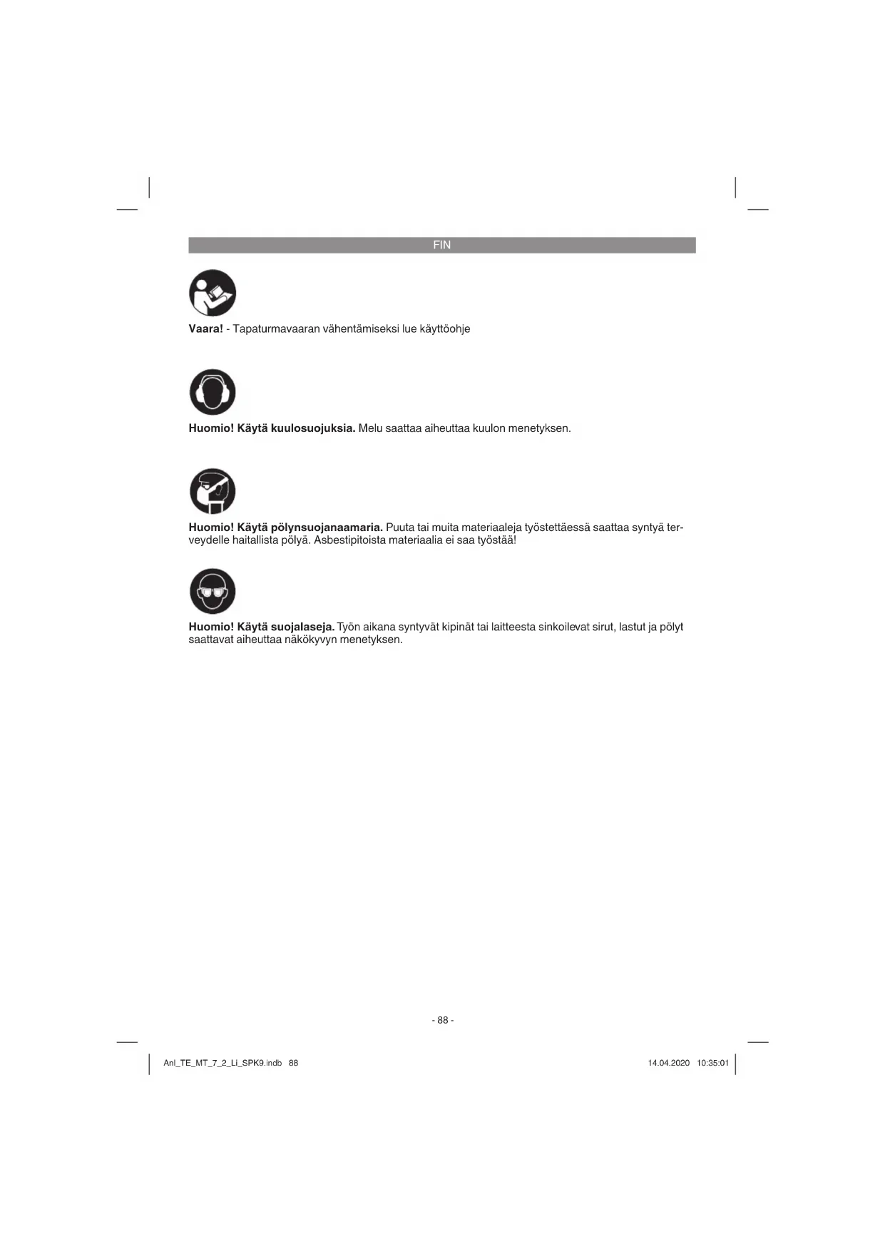 Vaara! - Tapaturmavaaran vähentämiseksi lue käyttöohje Huomio! Käytä kuulosuojuksia. Melu saattaa aiheuttaa kuulon menetyksen. Huomio! Käytä suojalaseja. Työn aikana syntyvät kipinät tai laitteesta sinkoilevat sirut, lastut ja pölyt saattavat aiheuttaa näkökyvyn menetyksen. Huomio! Käytä pölynsuojanaamaria. Puuta tai muita materiaaleja työstettäessä saattaa syntyä ter- veydelle haitallista pölyä. Asbestipitoista materiaalia ei saa työstää! Anl_TE_MT_7_2_Li_SPK9.indb 88Anl_TE_MT_7_2_Li_SPK9.indb 88 14.04.2020 10:35:0114.04.2020 10:35:01FIN