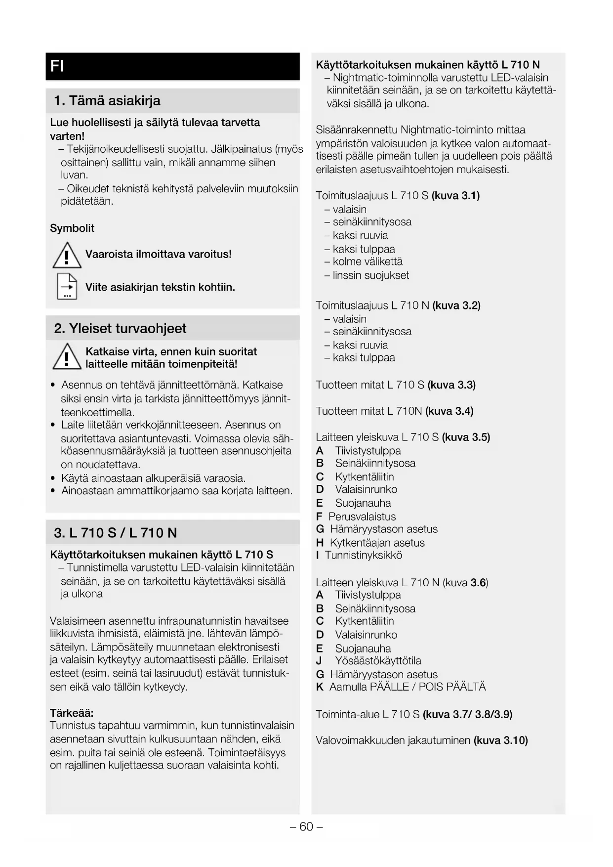 Käyttötarkoituksen mukainen käyttö L 710 S – Tunnistimella varustettu LED-valaisin kiinnitetään seinään, ja se on tarkoitettu käytettäväksi sisällä ja ulkona Valaisimeen asennettu infrapunatunnistin havaitsee liikkuvista ihmisistä, eläimistä jne. lähtevän lämpö- säteilyn. Lämpösäteily muunnetaan elektronisesti ja valaisin kytkeytyy automaattisesti päälle. Erilaiset esteet (esim. seinä tai lasiruudut) estävät tunnistuk- sen eikä valo tällöin kytkeydy. Tärkeää: Tunnistus tapahtuu varmimmin, kun tunnistinvalaisin asennetaan sivuttain kulkusuuntaan nähden, eikä esim. puita tai seiniä ole esteenä. Toimintaetäisyys on rajallinen kuljettaessa suoraan valaisinta kohti. Käyttötarkoituksen mukainen käyttö L 710 N – Nightmatic-toiminnolla varustettu LED-valaisin kiinnitetään seinään, ja se on tarkoitettu käytettä- väksi sisällä ja ulkona. Sisäänrakennettu Nightmatic-toiminto mittaa ympäristön valoisuuden ja kytkee valon automaat- tisesti päälle pimeän tullen ja uudelleen pois päältä erilaisten asetusvaihtoehtojen mukaisesti. Toimituslaajuus L 710 S (kuva3.1) – valaisin – seinäkiinnitysosa – kaksi ruuvia – kaksi tulppaa – kolme välikettä – linssin suojukset Toimituslaajuus L 710 N (kuva3.2) – valaisin – seinäkiinnitysosa – kaksi ruuvia – kaksi tulppaa Tuotteen mitat L 710 S (kuva3.3) Tuotteen mitat L 710N (kuva3.4) Laitteen yleiskuva L 710 S (kuva3.5) A Tiivistystulppa B Seinäkiinnitysosa C Kytkentäliitin D Valaisinrunko E Suojanauha F Perusvalaistus G Hämäryystason asetus H Kytkentäajan asetus I Tunnistinyksikkö Laitteen yleiskuva L 710 N (kuva3.6) A Tiivistystulppa B Seinäkiinnitysosa C Kytkentäliitin D Valaisinrunko E Suojanauha J Yösäästökäyttötila G Hämäryystason asetus K Aamulla PÄÄLLE / POIS PÄÄLTÄ Toiminta-alue L 710 S (kuva3.7/ 3.8/3.9) Valovoimakkuuden jakautuminen (kuva3.10)– 61 –