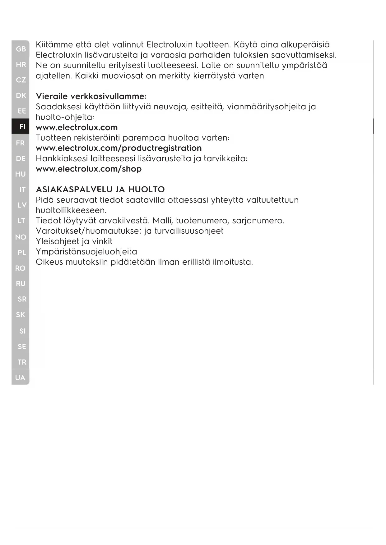 Kiitämme että olet valinnut Electroluxin tuotteen. Käytä aina alkuperäisiä Electroluxin lisävarusteita ja varaosia parhaiden tuloksien saavuttamiseksi. Ne on suunniteltu erityisesti tuotteeseesi. Laite on suunniteltu ympäristöä ajatellen. Kaikki muoviosat on merkitty kierrätystä varten. Vieraile verkkosivullamme: Saadaksesi käyttöön liittyviä neuvoja, esitteitä, vianmääritysohjeita ja huolto-ohjeita: www.electrolux.com Tuotteen rekisteröinti parempaa huoltoa varten: www.electrolux.com/productregistration Hankkiaksesi laitteeseesi lisävarusteita ja tarvikkeita: www.electrolux.com/shop