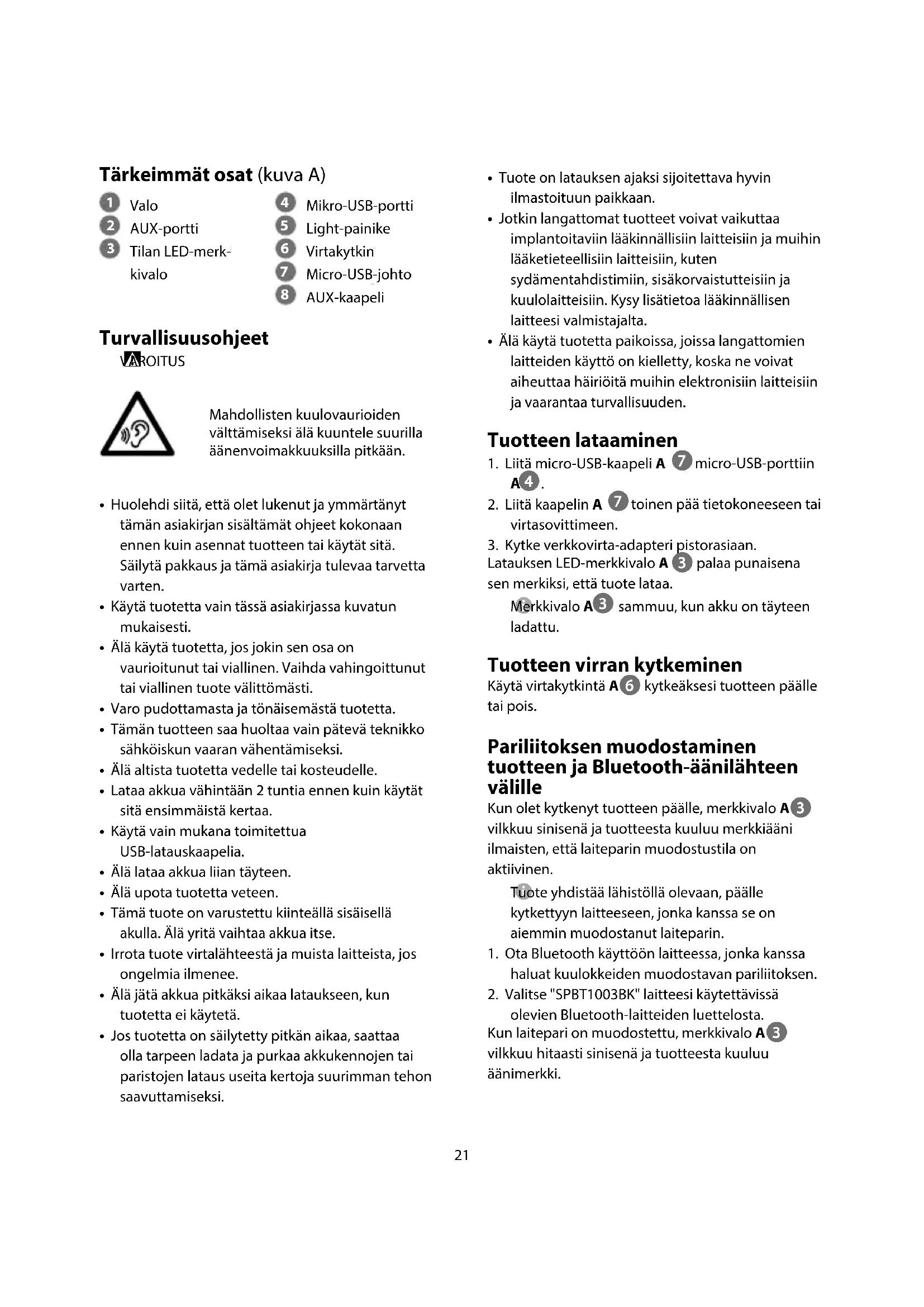 sammuu, kun akku on täyteen ladattu. Tuotteen virran kytkeminen Käytä virtakytkintä A6 kytkeäksesi tuotteen päälle tai pois. Pariliitoksen muodostaminen tuotteen ja Bluetooth-äänilähteen välille Kun olet kytkenyt tuotteen päälle, merkkivalo A3 vilkkuu sinisenä ja tuotteesta kuuluu merkkiääni ilmaisten, että laiteparin muodostustila on aktiivinen.