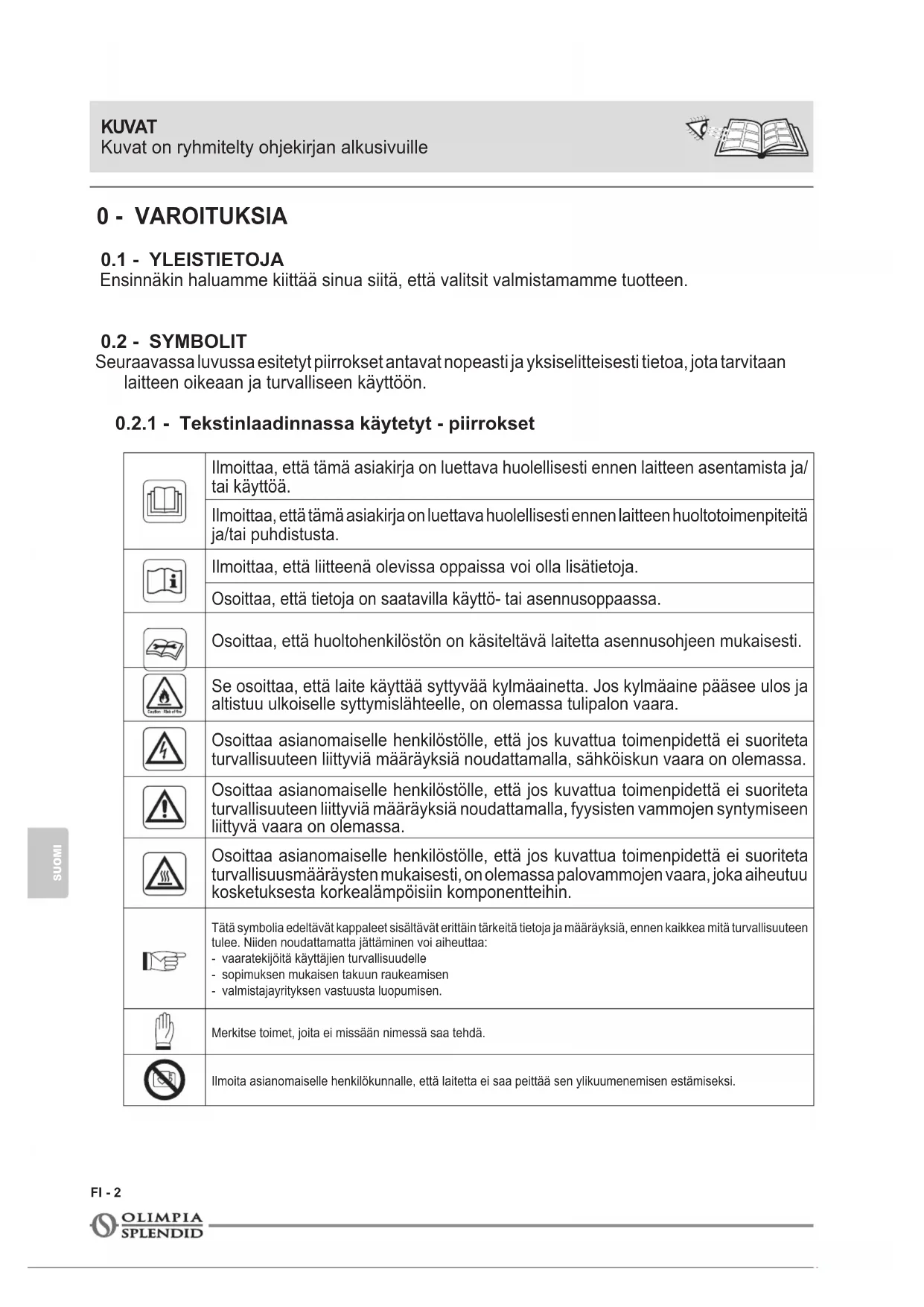 kolmansille osapuolille ilman OLIMPIA SPLENDID -yhtiön nimenomaista lupaa. Laitteita saatetaan päivittää, joten niiden yksityiskohdat voivat poiketa kuvatuista, sanotun kuitenkaan rajoittamatta tämän oppaan tekstien soveltamista.