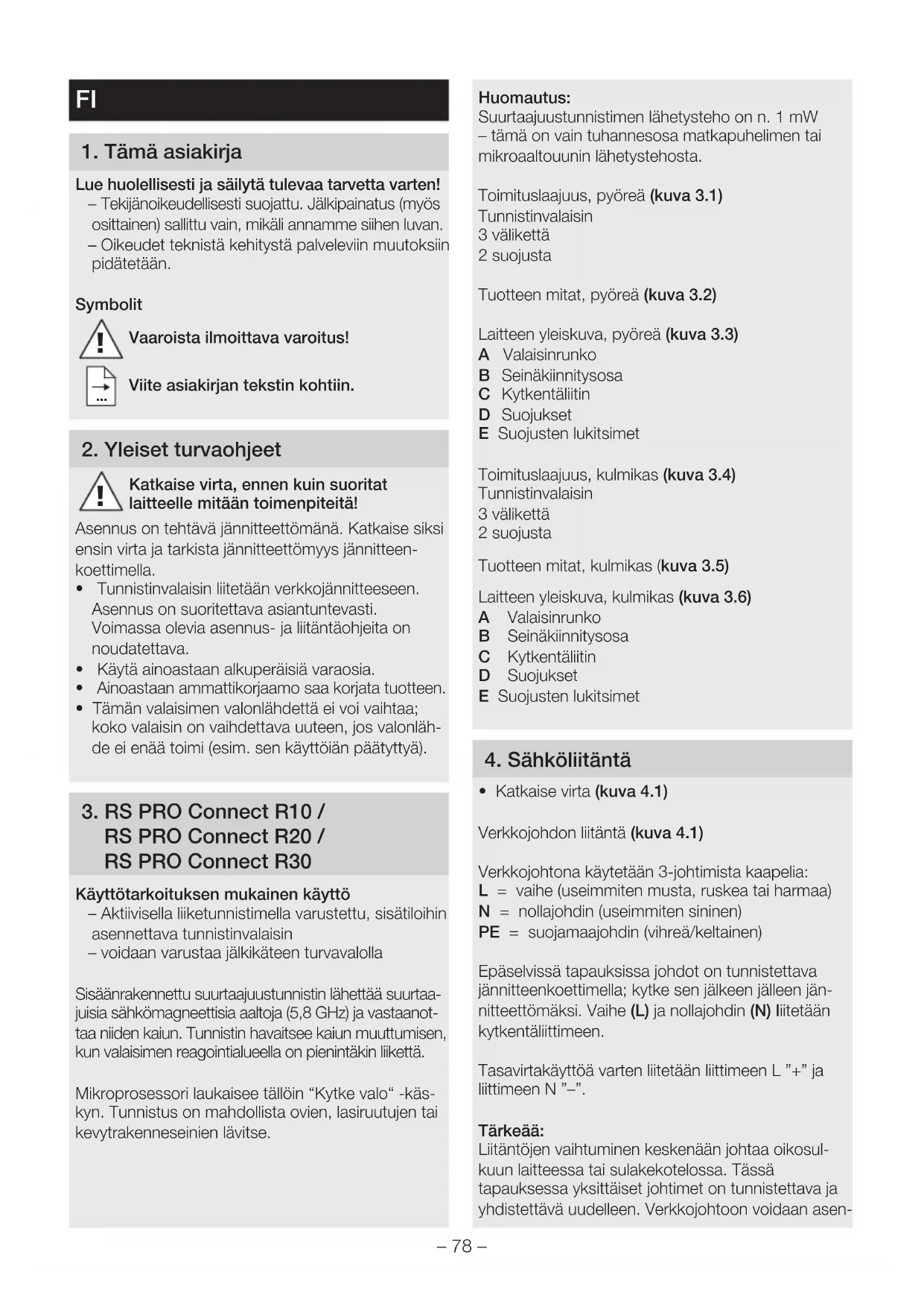RS PRO Connect R20 / RS PRO Connect R30 Käyttötarkoituksen mukainen käyttö – Aktiivisella liiketunnistimella varustettu, sisätiloihin asennettava tunnistinvalaisin – voidaan varustaa jälkikäteen turvavalolla Sisäänrakennettu suurtaajuustunnistin lähettää suurtaa- juisia sähkömagneettisia aaltoja (5,8GHz) ja vastaanot- taa niiden kaiun. Tunnistin havaitsee kaiun muuttumisen, kun valaisimen reagointialueella on pienintäkin liikettä. Mikroprosessori laukaisee tällöin “Kytke valo“ -käs- kyn. Tunnistus on mahdollista ovien, lasiruutujen tai kevytrakenneseinien lävitse. Huomautus: Suurtaajuustunnistimen lähetysteho on n. 1 mW – tämä on vain tuhannesosa matkapuhelimen tai mikroaaltouunin lähetystehosta. Toimituslaajuus, pyöreä (kuva3.1) Tunnistinvalaisin 3 välikettä 2 suojusta Tuotteen mitat, pyöreä (kuva3.2) Laitteen yleiskuva, pyöreä (kuva3.3) A Valaisinrunko B Seinäkiinnitysosa C Kytkentäliitin D Suojukset E Suojusten lukitsimet Toimituslaajuus, kulmikas (kuva3.4) Tunnistinvalaisin 3 välikettä 2 suojusta Tuotteen mitat, kulmikas (kuva3.5) Laitteen yleiskuva, kulmikas (kuva3.6) A Valaisinrunko B Seinäkiinnitysosa C Kytkentäliitin D Suojukset E Suojusten lukitsimet