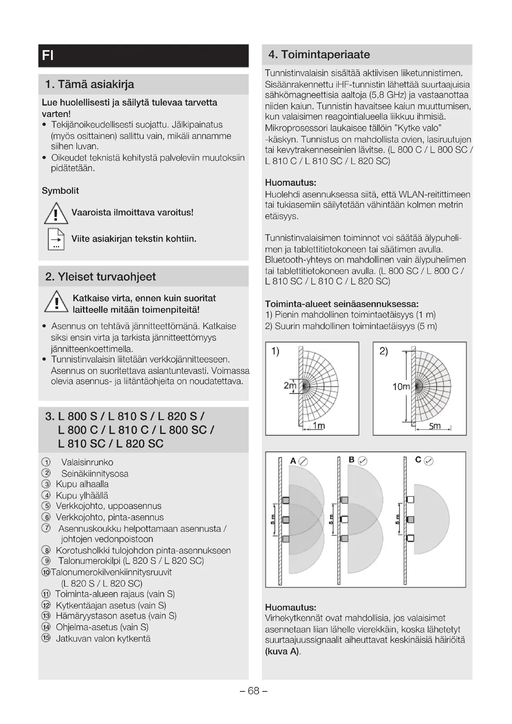 Tunnistinvalaisin sisältää aktiivisen liiketunnistimen. Sisäänrakennettu iHF-tunnistin lähettää suurtaajuisia sähkömagneettisia aaltoja (5,8GHz) ja vastaanottaa niiden kaiun. Tunnistin havaitsee kaiun muuttumisen, kun valaisimen reagointialueella liikkuu ihmisiä. Mikroprosessori laukaisee tällöin ”Kytke valo” -käskyn. Tunnistus on mahdollista ovien, lasiruutujen tai kevytrakenneseinien lävitse. (L800C / L800SC / L810C / L810SC / L820SC)Huomautus:Huolehdi asennuksessa siitä, että WLAN-reitittimeen tai tukiasemiin säilytetään vähintään kolmen metrin etäisyys.Tunnistinvalaisimen toiminnot voi säätää älypuheli-men ja tablettitietokoneen tai säätimen avulla. Bluetooth-yhteys on mahdollinen vain älypuhelimen tai tablettitietokoneen avulla. (L800SC/ L800C/ L810SC/ L810C/ L820SC) Toiminta-alueet seinäasennuksessa:1) Pienin mahdollinen toimintaetäisyys (1m)2) Suurin mahdollinen toimintaetäisyys (5m)