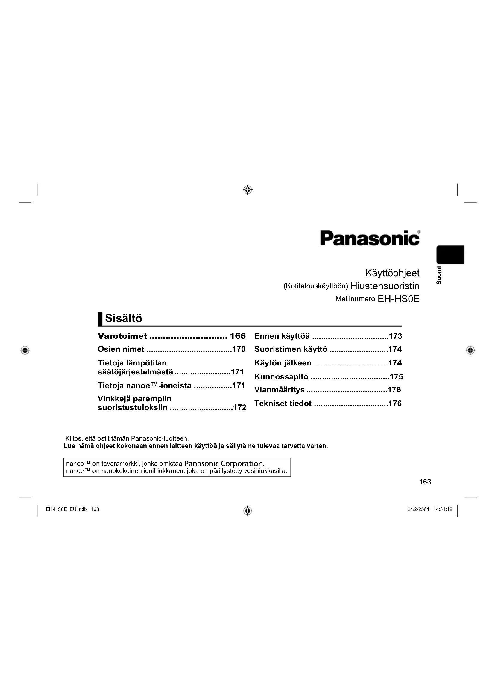 - Laite on muuttanut muotoaan tai haisee palaneelta. - Pyydä välittömästi tarkastusta tai korjausta valtuutetulta huoltoliikkeeltä. EH-HS0E_EU.indb 167EH-HS0E_EU.indb 167 24/2/2564 14:31:1324/2/2564 14:31:13168 Suomi VAROITUS Työnnä pistoke suoraan pistorasiaan: Älä käytä jatkojohdon kanssa. Työnnä pistoke kokonaan paikalleen. Varmista aina, että laitetta käytetään virtalähteellä, joka vastaa laitteen ilmoitettua nimellisjännitettä. - Jos näin ei tehdä, seurauksena voi olla tulipalo tai sähköisku. Puhdista pistoke säännöllisesti pölyn kertymisen estämiseksi. - Jos näin ei tehdä, seurauksena voi olla tulipalo kosteuden aiheuttaman eristysvian vuoksi. Irrota pistoke ja pyyhi kuivalla liinalla. Kun laitetta käytetään kylpyhuoneessa, irrota se pistorasiasta käytön jälkeen, koska veden läheisyys aiheuttaa vaaran myös silloin, kun laite on sammutettu. - Jos näin ei tehdä, seurauksena voi olla onnettomuus tai loukkaantuminen. Lisäsuojaa varten kylpyhuoneen virtapiiriin on suositeltavaa asentaa vikavirtasuojalaite (RCD), jonka nimellinen jäännöstoimintavirta on enintään 30 mA. Kysy neuvoa asentajalta. - Jos näin ei tehdä, seurauksena voi olla onnettomuus tai loukkaantuminen. Pidä laite poissa lasten ulottuvilta, erityisesti käytön aikana, ja suoristimen jäähtyessä. Lapset eivät saa käyttää laitetta. - Se voi aiheuttaa palovammoja, sähköiskun tai loukkaantumisen. Tätä laitetta ei ole tarkoitettu lasten tai muiden sellaisten henkilöiden käytettäväksi, joiden fyysiset, aistinvaraiset tai henkiset ominaisuudet tai kokemuksen tai tiedon puute estävät heitä käyttämästä laitetta turvallisesti, ellei heidän turvallisuudestaan vastaava henkilö valvo heitä tai ole opastanut heille laitteen käyttöä. Lapsia on pidettävä silmällä, etteivät he leiki laitteella. - Jos näin ei tehdä, seurauksena voi olla onnettomuus tai loukkaantuminen. Jos virtajohto vahingoittuu, valmistajan, huoltoliikkeen tai vastaavan pätevän henkilön on vaihdettava se vaaratilanteiden välttämiseksi. - Jos näin ei tehdä, seurauksena voi olla onnettomuus tai loukkaantuminen. HUOMIO Älä säilytä tai käytä johtoa sen ollessa kierteellä. - Se voi johtaa johdon johtimen katkeamiseen kuormituksessa ja sähköiskun tai tulipalon oikosulun vuoksi. Älä pudota tai altista iskuille. - Se voi aiheuttaa sähköiskun tai laitteen syttymisen. Älä käytä sylilapsiin. - Se voi aiheuttaa palovammoja. EH-HS0E_EU.indb 168EH-HS0E_EU.indb 168 24/2/2564 14:31:1324/2/2564 14:31:13169 Suomi HUOMIO Älä koske varjostettuihin alueisiin käytön aikana tai heti käytön jälkeen, sillä ne ovat kuumia. - Se voi aiheuttaa palovammoja. Älä anna kuumennetun osan koskettaa ihoa (korvat, otsa, niska jne.). - Se voi aiheuttaa palovammoja. Älä käytä laitetta, kun hiuksiin on levitetty permanenttiaineita. - Se voi aiheuttaa hius- tai iho-ongelmia. Älä käytä laitetta mihinkään muuhun tarkoitukseen kuin ihmisten hiusten hoitoon. (Älä käytä lemmikkieläimiin jne.) - Se voi aiheuttaa palovammoja. Älä käytä laitetta samaan hiuskimppuun yli 2 kertaa. - Se voi aiheuttaa hiusten palamisen tai vahingoittumisen. Irrota pistoke pistorasiasta käytön jälkeen. - Jos näin ei tehdä, seurauksena voi olla sähköisku tai tulipalo eristeen heikkenemisestä johtuvan sähkövuodon vuoksi. Varo käytön aikana tarttumasta käsin tai sormin varjostettuihin alueisiin. - Jos näin ei tehdä, seurauksena voi olla loukkaantuminen. Irrota pistoke tarttumalla pistokkeeseen johdosta vetämisen sijaan. - Jos näin ei tehdä, johdon johdin voi katketa ja aiheuttaa palovamman, sähköiskun tai tulipalon oikosulun vuoksi. Liu’uta laite kokonaan hiusten läpi pysähtymättä. Käytä laitetta vain puhtaisiin, kuiviin ja takuttomiin hiuksiin. Suositeltu käyttölämpötila riippuu kunkin hiustyypin kunnosta. (katso sivu 173) - Jos näin ei tehdä, seurauksena voi olla hiusten palaminen tai vahingoittuminen. Sijoita laite aina lämmönkestävälle, vakaalle ja tasaiselle alustalle. - Jos näin ei tehdä, seurauksena voi olla tulipalo, palovammoja tai värin- tai muodonmuutoksia lähellä olevissa kohteissa. ►Huomautukset ● Muotoilu pysyy vain yhden päivän. Hiukset palaavat normaaliin tilaan shampoopesun jälkeen. ● nanoe™:n ja suoristuksen tehokkuus voi vaihdella yksilöittäin. ● Jotkin peruukit ja hiustenpidennykset heikentyvät lämmössä ja saattavat vääntyä tai menettää koostumuksensa. Älä käytä laitetta näihin tuotteisiin. EH-HS0E_EU.indb 169EH-HS0E_EU.indb 169 24/2/2564 14:31:1324/2/2564 14:31:13170 Suomi Osien nimet A Lämpölevyt B Höyryn tuuletusura C Rautalevy D nanoe™-poistoaukko E Lukituskytkin F Johto G Pistoke H nanoe™-valo I Lämpötilansäätimen kytkin J Virtakytkin K Lämpötila-asetukset Valo Lisätarvikkeet L Puhdistusharja (nanoe™-poistoaukolle) Tietoja lukituskytkimestä Lukitse ja avaa liu’uttamalla lukituskytkintä (varjostettu alue). Lukittu Avattu ►Huomautus ● Älä yritä avata laitetta väkisin, kun se on lukittu. Tämä voi vahingoittaa tuotetta.