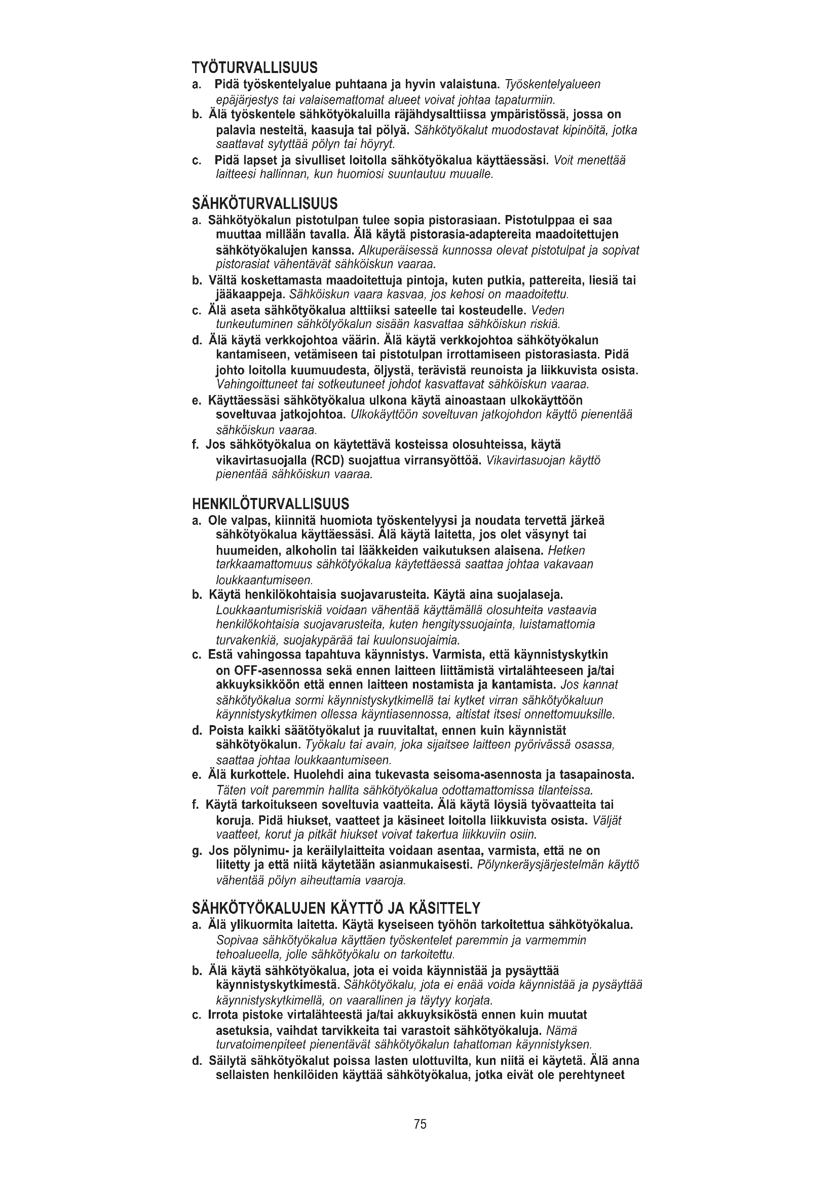 Alla olevien ohjeiden noudattamisen laiminlyönti saattaa johtaa sähköiskuun, tulipaloon ja/tai vakavaan loukkaantumiseen. Säilytä kaikki ohjeet ja varoitukset myöhempää käyttöä varten. Termillä ”sähkötyökalu” tarkoitetaan sähkökäyttöistä (sähköjohdolla varustettua) työkalua tai akkukäyttöistä (sähköjohdotonta) työkalua.75 TYÖTURVALLISUUS a. Pidä työskentelyalue puhtaana ja hyvin valaistuna. Työskentelyalueen epäjärjestys tai valaisemattomat alueet voivat johtaa tapaturmiin. b. Älä työskentele sähkötyökaluilla räjähdysalttiissa ympäristössä, jossa on palavia nesteitä, kaasuja tai pölyä. Sähkötyökalut muodostavat kipinöitä, jotka saattavat sytyttää pölyn tai höyryt. c. Pidä lapset ja sivulliset loitolla sähkötyökalua käyttäessäsi. Voit menettää laitteesi hallinnan, kun huomiosi suuntautuu muualle.