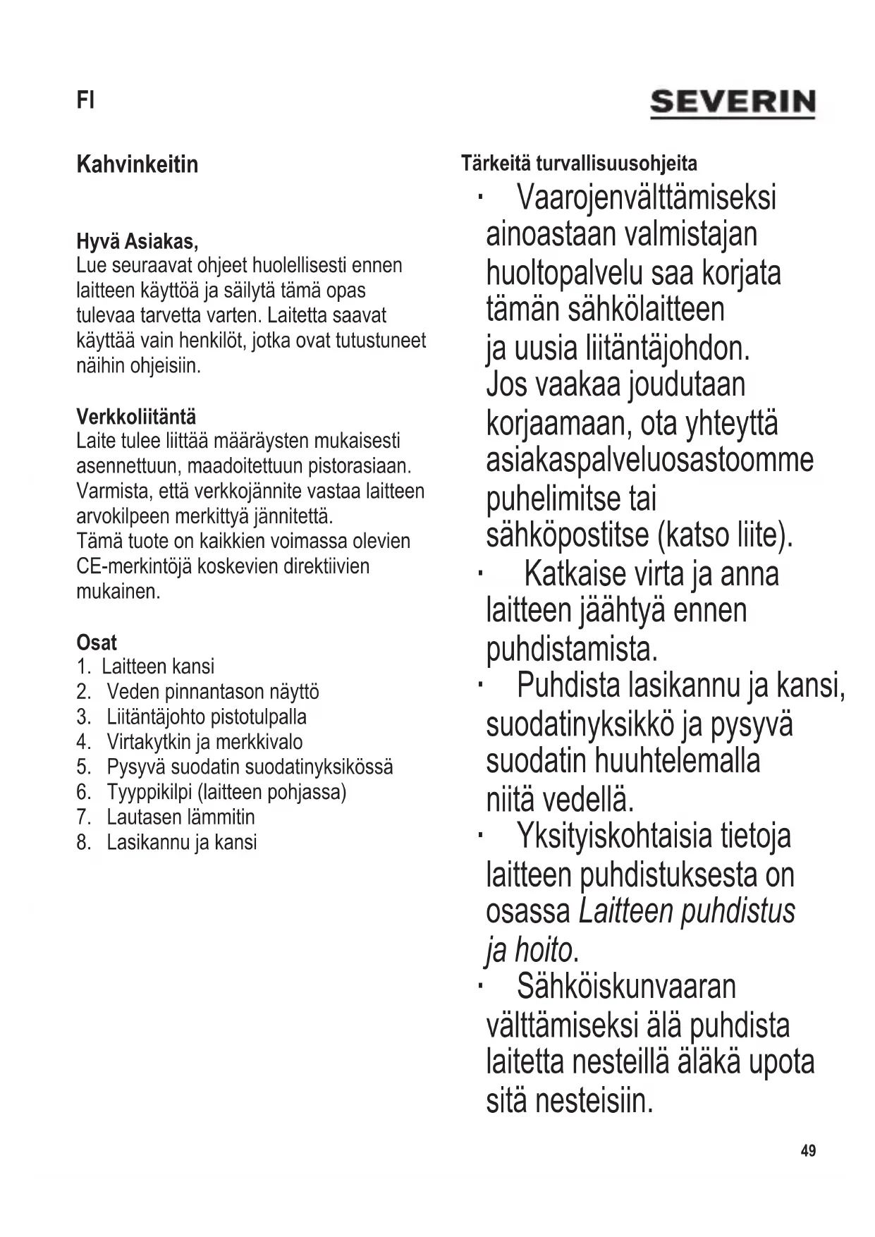 Kalkin poisto ∙ Kaikista kuumaa vettä käyttävistä kodinkoneista on aika ajoin poistettava kalkkisakkautumat, jotta laitteen toiminta ei kärsi. Toimenpiteen toistotiheys riippuu veden laadusta (kalkkipitoisuus), sekä siitä, kuinka usein laitetta käytetään. ∙ Kaikki takuut raukeavat, jos laitteeseen tulee vika riittämättömän kalkinpoiston vuoksi. ∙ Jos suodatusjakso pitenee, kahvinkeitin alkaa toimia äänekkäästi tai säiliöön jää vettä, täytyy suorittaa kalkinpoisto. ∙ Kovin paksuja kalkkisakkautumia on erittäin vaikea poistaa voimakkaillakin aineilla. Kalkki voi aiheuttaa myös keittimen vuotamista. Valmistaja suosittelee, että kattilakiven poisto suoritetaan aina 30-40 suodatusjakson välein. Toimenpiteen voi suorittaa etikkaliuoksella: ∙ Sekoita 80 ml etikkaesanssia annettuun maksimimäärään kylmää vettä. ∙ Kaada seos keittimen vesisäiliöön, laita paperisuodatin suodatinpitimeen ilman kahvia Kahvin valmistus -osassa kuvatulla tavalla ja anna keittimen käydä läpi yksi suodatusjakso. Toista toimenpide tarpeen vaatiessa. Älä hengitä kalkinpoiston aikana syntyviä etikkahöyryjä ja varmista riittävä tuuletus. ∙ Puhdista kahvinkeitin kattilakiven poiston jälkeen käymällä suodatusjakso lävitse 2–3 kertaa puhtaalla vedellä. ∙ Älä kaada kalkinpoistoainetta emaloituihin astianpesualtaisiin. Jätehuolto Tällä symbolilla merkityt laitteet täytyy hävittää kotitalousjätteestä erillään, sillä ne sisältävät arvokkaita kierrätyskelpoisia materiaaleja. Asianmukaisella hävittämisellä suojellaan ympäristöä ja ihmisterveyttä. Saat aiheesta lisätietoa paikallisilta viranomaisilta tai jälleenmyyjiltä. Takuu Laitteelle myönnetään 2 vuoden takuu, joka koskee valmistus- ja ainevikoja, ostopäivästä lukien yksilöityä ostokuittia vastaan yleisten Suomessa kulloinkin alalla voimassa olevien takuuehtojen mukaan. Mikäli laitetta käytetään väärin, käyttöohjeen vastaisesti tai huolimattomasti, vastuu syntyvistä esine- ja henkilövahingoista lankeaa laitteen käyttäjälle. Tämä takuu ei vaikuta lakimääräisiin oikeuksiin eikä mihinkään muihin kansallisen lainsäädännön säätämiin tuotteiden ostoa koskeviin laillisiin kuluttajaoikeuksiin, joita tuotteen hankkijalla on. Valmistuttaja: Severin Elektrogeräte GmbH, Saksa Maahantuoja: AV-Komponentti Oy (Puh) 09-8678020 info@avkomponentti. www.avkomponentti.54 104 x 142 mm Máquina de Café de Filtro Estimado/a cliente Por favor, leia atentamente as seguintes instruções antes de usar o aparelho e guarde-as para uso posterior. O aparelho apenas deve ser utilizado por pessoas que estejam familiarizadas com as instruções de segurança. Ligação Ligue o aparelho apenas a uma tomada devidamente instalada. A voltagem deve corresponder àquela indicadanaplacadeclassicaçãodo aparelho. O aparelho está em conformidade com asdiretivasquesãovinculativasparaa marcaçãoCE. Estrutura