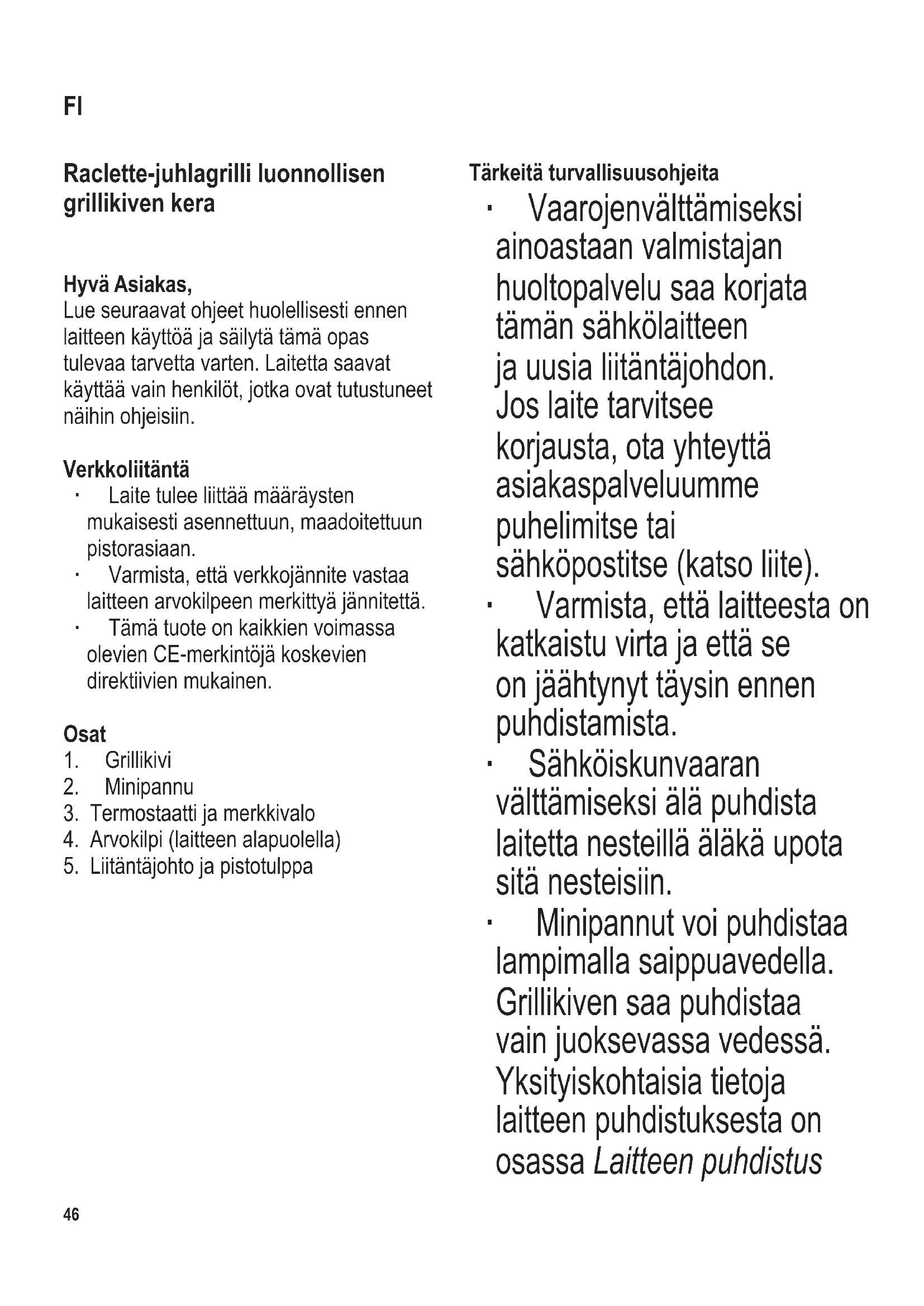 Tärkeitä turvallisuusohjeita ∙ Vaarojen välttämiseksi ainoastaan valmistajan huoltopalvelu saa korjata tämän sähkölaitteen ja uusia liitäntäjohdon. Jos laite tarvitsee korjausta, ota yhteyttä asiakaspalveluumme puhelimitse tai sähköpostitse (katso liite). ∙ Varmista, että laitteesta on katkaistu virta ja että se on jäähtynyt täysin ennen puhdistamista. ∙ Sähköiskun vaaran välttämiseksi älä puhdista laitetta nesteillä äläkä upota sitä nesteisiin. ∙ Minipannut voi puhdistaa lampimalla saippuavedella. Grillikiven saa puhdistaa vain juoksevassa vedessä. Yksityiskohtaisia tietoja laitteen puhdistuksesta on osassa Laitteen puhdistus FI104 x 142 mm