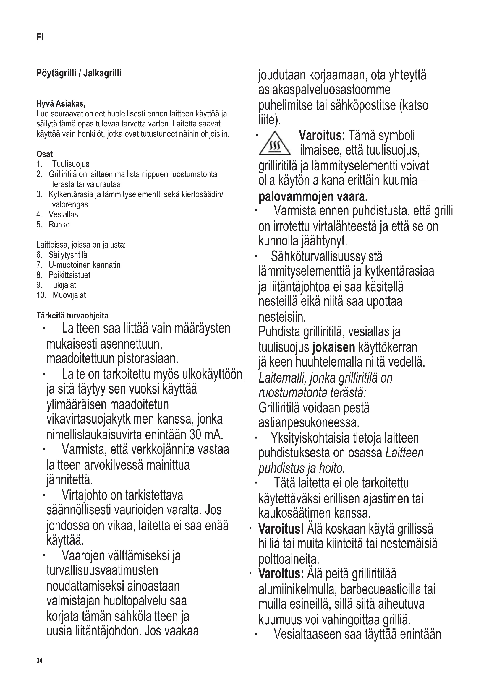 Varoitus: Tämä symboli ilmaisee, että tuulisuojus, grilliritilä ja lämmityselementti voivat olla käytön aikana erittäin kuumia – palovammojen vaara. ∙ Varmista ennen puhdistusta, että grilli on irrotettu virtalähteestä ja että se on kunnolla jäähtynyt. ∙ Sähköturvallisuussyistä lämmityselementtiä ja kytkentärasiaa ja liitäntäjohtoa ei saa käsitellä nesteillä eikä niitä saa upottaa nesteisiin. Puhdista grilliritilä, vesiallas ja tuulisuojus jokaisen käyttökerran jälkeen huuhtelemalla niitä vedellä. Laitemalli, jonka grilliritilä on ruostumatonta terästä: Grilliritilä voidaan pestä astianpesukoneessa. ∙ Yksityiskohtaisia tietoja laitteen puhdistuksesta on osassa Laitteen puhdistus ja hoito. ∙ Tätä laitetta ei ole tarkoitettu käytettäväksi erillisen ajastimen tai kaukosäätimen kanssa. ∙ Varoitus! Älä koskaan käytä grillissä hiiliä tai muita kiinteitä tai nestemäisiä polttoaineita. ∙ Varoitus: Älä peitä grilliritilää alumiinikelmulla, barbecueastioilla tai muilla esineillä, sillä siitä aiheutuva kuumuus voi vahingoittaa grilliä. ∙ Vesialtaaseen saa täyttää enintään FI35 142 x 208 mm 1,1 litraa vettä. ∙ Tämä laite on tarkoitettu kotitalouskäyttöön tai vastaavaan, kuten - ruokalat, toimistot ja muut kaupalliset ympäristöt - maatalousyritykset - hotellien, motellien jne. ja vastaavien yritysten asiakkaat - aamiaisen ja majoituksen tarjoavat majatalot. ∙ Tätä laitetta saavat käyttää lapset (vähintään 8-vuotiaat) sekä henkilöt, joilla on fyysisesti, aistillisesti tai henkisesti rajoittunut toimintakyky tai joilla on puuttuvat tai vajavaiset tiedot laitteen toiminnasta, mikäli heitä valvotaan tai ohjataan laitteen käytössä ja he ymmärtävät täysin kaikki käyttöön liittyvät vaarat ja turvatoimenpiteet. ∙ Lasten ei saa antaa leikkiä laitteella. ∙ Lasten ei saa antaa tehdä laitteen puhdistus- tai huoltotoimenpiteitä, elleivät he ole aikuisen valvonnassa sekä vähintään 8 vuotta vanhoja. ∙ Laite ja sen liitäntäjohto täytyy aina pitää alle 8-vuotiaiden ulottumattomissa. ∙ Varoitus: Pidä lapset poissa pakkausmateriaalien luota potentiaalisen vaaratilanteen esim. tukehtumisvaaran vuoksi. ∙ Ennen käyttöä laite ja mahdolliset lisäosat tulee tarkistaa vaurioiden varalta. Jos laite putoaa kovalle alustalle, sitä ei saa enää käyttää: näkymättömätkin vauriot voivat aiheuttaa vaaratilanteita laitetta käytettäessä. ∙ Käytön aikana grillin on oltava tulenkestävällä, roiskeet ja tahrautumisen kestävällä työtasolla. Rasvaista tai nestepitoista ruokaa valmistettaessa ei aina ole mahdollista välttää roiskumista. ∙ Älä aseta grilliä seinän viereen tai nurkkaan ja varmista, ettei sen lähellä ole tulenarkoja materiaaleja. ∙ Kun laitetta käytetään sisätiloissa, tuulisuojaa ei tarvitse asentaa. ∙ Rasvapitoinen grilliruoka voi syttyä, ja sen vuoksi vesiallas on täytettävä vedellä aina ennen käyttöönottoa! Liitä virtapistoke vasta sen jälkeen. Näin vesiallas jäähtyy, savun muodostus vähenee ja puhdistus helpottuu. ∙ Valvo jatkuvasti veden pinnan tasoa. Lisää vettä hyvissä ajoin ja varmista, ettei se joudu kosketuksiin lämmityselementin kanssa. Varoitus: Kytke grillin liitäntäjohto irti verkkovirrasta ennen kuin lisäät vettä. ∙ Tarkasta ennen käyttöönottoa, että lämmityselementti on asianmukaisesti asetettu runkoon ja vesialtaaseen. ∙ Grilliä ei saa jättää toimintaan ilman valvontaa. ∙ Lämmityselementti ja grilliritilä ovat käytön aikana erittäin kuumia. Älä koske lämmityselementtiin käytön jälkeenkään ennen kuin se on jäähtynyt. Palovammojen vaara! ∙ Älä anna liitäntäjohdon koskea laitteen kuumia osia. ∙ Reititä virtajohto niin, ettei kukaan voi kompastua siihen. ∙ Irrota pistoke pistorasiasta aina - ennen veden lisäämistä kaukaloon, - käytön jälkeen, - jos laitteessa ilmenee vikaa, - ennen laitteen puhdistusta. ∙ Jatkojohdon tai johtokelan käyttö aiheuttaa tehon heikkenemistä ja mahdollisesti myöhemmin lämmönmuodostusta johtoon. Siitä syystä johto on vedettävä kokonaan esiin ennen käyttöä. Varmista, että johto on tarkoitettu ulkokäyttöön ja eritellylle teholle (katso arvokilpi). ∙ Laitteissa, joissa on jalusta: Säilytysritilää saa kuormittaa enintään 4 kg painolla. ∙ Älä koskaan liikuta grilliä käytön aikana. ∙ Huomio! Anna grillin aina jäähtyä täydellisesti ennen kuin siirrät, puhdistat, peität tai laitat sen säilytykseen. ∙ Huomio! Jos grilliä ei käytetä, lämmityselementti on kytkentärasioineen irrotettava grillistä ja sitä on säilytettävä sisällä kosteudelta suojattuna. ∙ Muita grillin osia ei saa säilyttää ulkona tai sellaisissa suojaamattomissa paikoissa, missä ne altistuvat säätilan vaikutuksille. ∙ Valmistaja ei ole vastuussa mahdollisista vaurioista, jos ne johtuvat laitteen väärinkäytöstä tai käyttöohjeiden laiminlyömisestä. ∙ Tämä tuote on kaikkien voimassa olevien CE-merkintöjä koskevien direktiivien mukainen. Ennen ensimmäistä käyttöä ∙ Poista laitteesta pakkausmateriaali ja tarrat. ∙ Irrota neljä silikoniletkua myös lämmityselementin poikittaistuista. ∙ Puhdista grilliritilä, vesiallas ja tuulisuojus huuhtelemalla niitä kuumalla vedellä ja kuivaa ne sen jälkeen hyvin. ∙ Kokoa laite luvussa Laitteen valmistelu olevan kuvauksen mukaisesti. ∙ Anna grillin lämmetä noin 10 minuutin ajan maksimiteholla ilman ruokia (katso Grillaus). Näin laitteesta poistuu haju, jota ilmenee tavallisesti36 142 x 208 mm ensimmäisen käytön yhteydessä. Laitteesta voi tulla jonkin verran savua; sen takia täytyy varmistaa riittävä tuuletus avaamalla ikkuna tai parvekkeen ovi; myös liesituuletinta voidaan käyttää. Grillin kokoaminen ∙ Kokoa grilli kaaviokuvien mukaisesti: ∙ Aseta vesiallas runkoon. ∙ Aseta lämmityselementti kytkentärasian kanssa vesialtaaseen.