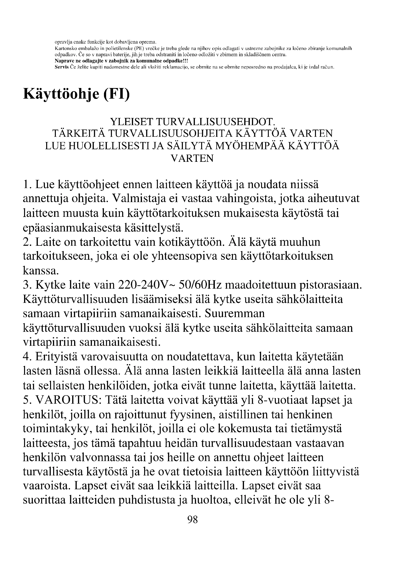 Ympäristön suojelemiseksi. Tietoja sähkö- ja elektroniikkalaiteromusta Syyskuun 11. päivänä 2015 annetun sähkö- ja elektroniikkalaiteromusta annetun lain 13 §:n 1 ja 2 momentin mukaisesti haluamme tiedottaa sinua sähkö- ja elektroniikkalaiteromun asianmukaisesta käsittelystä: 1. Sähkö- ja elektroniikkalaiteromua ei saa sijoittaa muun jätteen joukkoon - tämä vahvistetaan merkinnällä "yliviivatun roskiksen" muodossa, jossa määrätään tämäntyyppisen jätteen valikoivasta keräyksestä. 2. Sähkö- ja elektroniikkalaitteet voivat sisältää vaarallisia aineita, seoksia ja komponentteja, jotka ympäristöön joutuessaan voivat aiheuttaa vakavan uhan ihmisten ja elävien organismien terveydelle ja elämälle. Ne voivat aiheuttaa lukuisia terveysongelmia, kuten näkö-, kuulo- ja puhehäiriöitä, ja ne voivat myös vahingoittaa munuaisia, maksaa ja sydäntä sekä aiheuttaa ihosairauksia. Haitallisilla aineilla voi olla myös haitallisia vaikutuksia hengitys- ja lisääntymisjärjestelmiin ja ne voivat aiheuttaa syöpämuutoksia. Saastuneella maaperällä kasvavien kasvien ja niistä saatavien tuotteiden nauttiminen voi aiheuttaa edellä mainittuja terveysvaikutuksia. 3. Sähkö- ja elektroniikkalaiteromu on luovutettava ainoastaan valtuutettuihin keräyspisteisiin, joista on luettelo kunkin kunnan verkkosivustolla. 4. Kotitalouksilla on tärkeä rooli jätelaitteiden uudelleenkäytön ja hyödyntämisen, myös kierrätyksen, edistämisessä. Kotitalouksilla on myös keskeinen asema sähkö- ja elektroniikkalaiteromun jätehuoltojärjestelmässä, koska ne voivat toimittaa sähkö- ja elektroniikkalaitteet suoraan valtuutettuihin keräyspisteisiin ja koska ne poistavat ei-toivotut sosiaaliset tottumukset, jotka johtavat laitteiden jättämiseen paikkoihin, joita ei ole tarkoitettu tällaiseen tarkoitukseen. Lisäksi Palauta sähkö- ja elektroniikkaromu toimituspaikalle. Kun jakelija toimittaa kotitalouksille tarkoitettuja laitteita ostajalle, jakelijan on otettava kotitalouksilta käytetyt laitteet maksutta takaisin niiden toimituspaikassa edellyttäen, että käytetyt laitteet ovat samantyyppisiä ja toimivat samoilla toiminnoilla kuin toimitetut laitteet. Pahvipakkaukset ja polyeteenipussit (PE-pussit) on sijoitettava asianmukaisiin astioihin yhdyskuntajätteen erilliskeräystä varten niiden kuvauksen mukaisesti. Jos laitteessa on paristoja, ne on poistettava ja hävitettävä erikseen keräys- ja varastointilaitoksessa. Älä hävitä laitetta yhdyskuntajäteastiaan!!!! Huolto Jos haluat hankkia varaosia tai tehdä reklamaation, ota yhteyttä osoitteeseen ota yhteyttä suoraan kuitin antaneeseen jälleenmyyjään. Instrukcja obsługi (PL) OGÓLNE WARUNKI BEZPIECZEŃSTWA. WAŻNE INSTRUKCJE DOTYCZĄCE BEZPIECZEŃSTWA UŻYTKOWANIA PRZECZYTAJ UWAŻNIE I ZACHOWAJ NA PRZYSZŁOŚĆ104