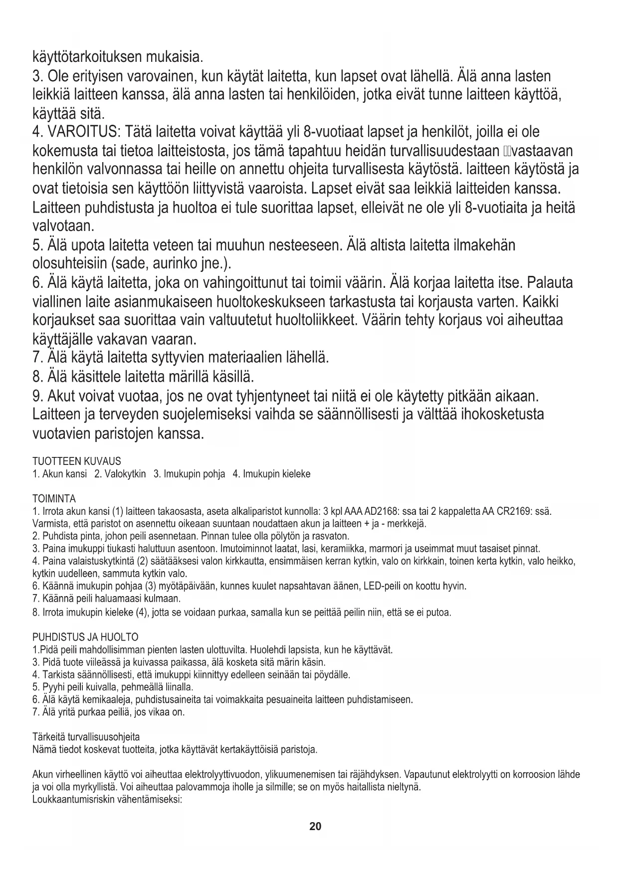 Varmista, että paristot on asennettu oikeaan suuntaan noudattaen akun ja laitteen + ja - merkkejä. 4. Paina valaistuskytkintä (2) säätääksesi valon kirkkautta, ensimmäisen kerran kytkin, valo on kirkkain, toinen kerta kytkin, valo heikko, kytkin uudelleen, sammuta kytkin valo. Tärkeitä turvallisuusohjeita